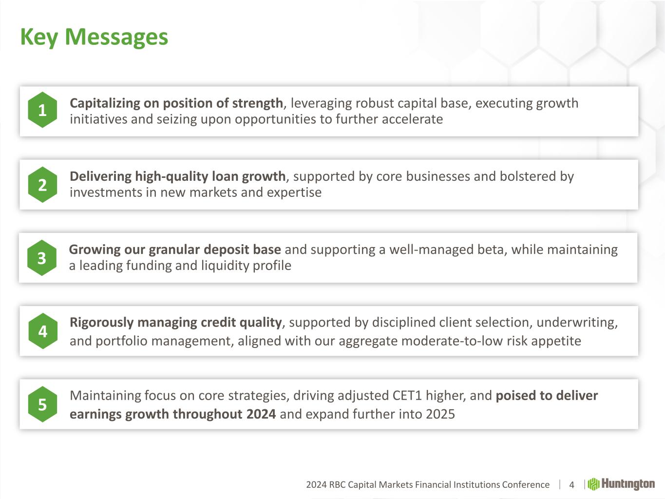 2024 RBC Capital Markets Financial Institutions Conference Huntington: A Purpose-Driven Company 3 OUR PURPOSE We make people’s lives better, help businesses thrive, and strengthen the communities we serve OUR VISION To be the leading People-First, Digitally Powered Bank Purpose and Vision Linked to Business Strategies Guided by Through-the-Cycle Aggregate Moderate-to-Low Risk Appetite