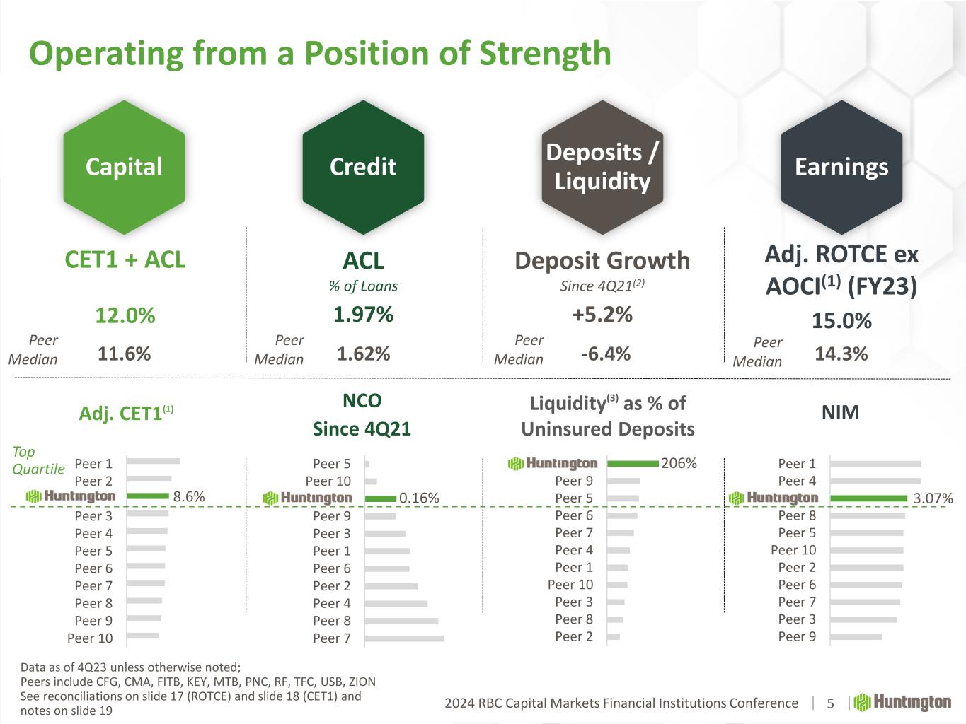 2024 RBC Capital Markets Financial Institutions Conference Key Messages Delivering high-quality loan growth, supported by core businesses and bolstered by investments in new markets and expertise2 Rigorously managing credit quality, supported by disciplined client selection, underwriting, and portfolio management, aligned with our aggregate moderate-to-low risk appetite4 Capitalizing on position of strength, leveraging robust capital base, executing growth initiatives and seizing upon opportunities to further accelerate1 Growing our granular deposit base and supporting a well-managed beta, while maintaining a leading funding and liquidity profile3 Maintaining focus on core strategies, driving adjusted CET1 higher, and poised to deliver earnings growth throughout 2024 and expand further into 20255 4