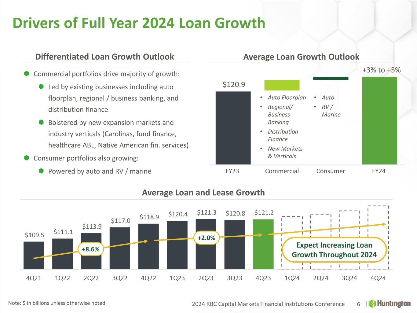 2024 RBC Capital Markets Financial Institutions ConferenceNote: $ in billions unless otherwise noted  Commercial portfolios drive majority of growth:  Led by existing businesses including auto floorplan, regional / business banking, and distribution finance  Bolstered by new expansion markets and industry verticals (Carolinas, fund finance, healthcare ABL, Native American fin. services)  Consumer portfolios also growing:  Powered by auto and RV / marine Differentiated Loan Growth Outlook 6 Drivers of Full Year 2024 Loan Growth $121.2 $120.8 $121.3 $120.4 $118.9 $117.0 $113.9 $111.1 $109.5 4Q243Q242Q241Q244Q233Q232Q231Q234Q223Q222Q221Q224Q21 Average Loan and Lease Growth +8.6% +2.0% $120.9 +3% to +5% FY23 Commercial Consumer FY24 Average Loan Growth Outlook • Auto Floorplan • Regional/ Business Banking • Distribution Finance • New Markets & Verticals • Auto • RV / Marine Expect Increasing Loan Growth Throughout 2024