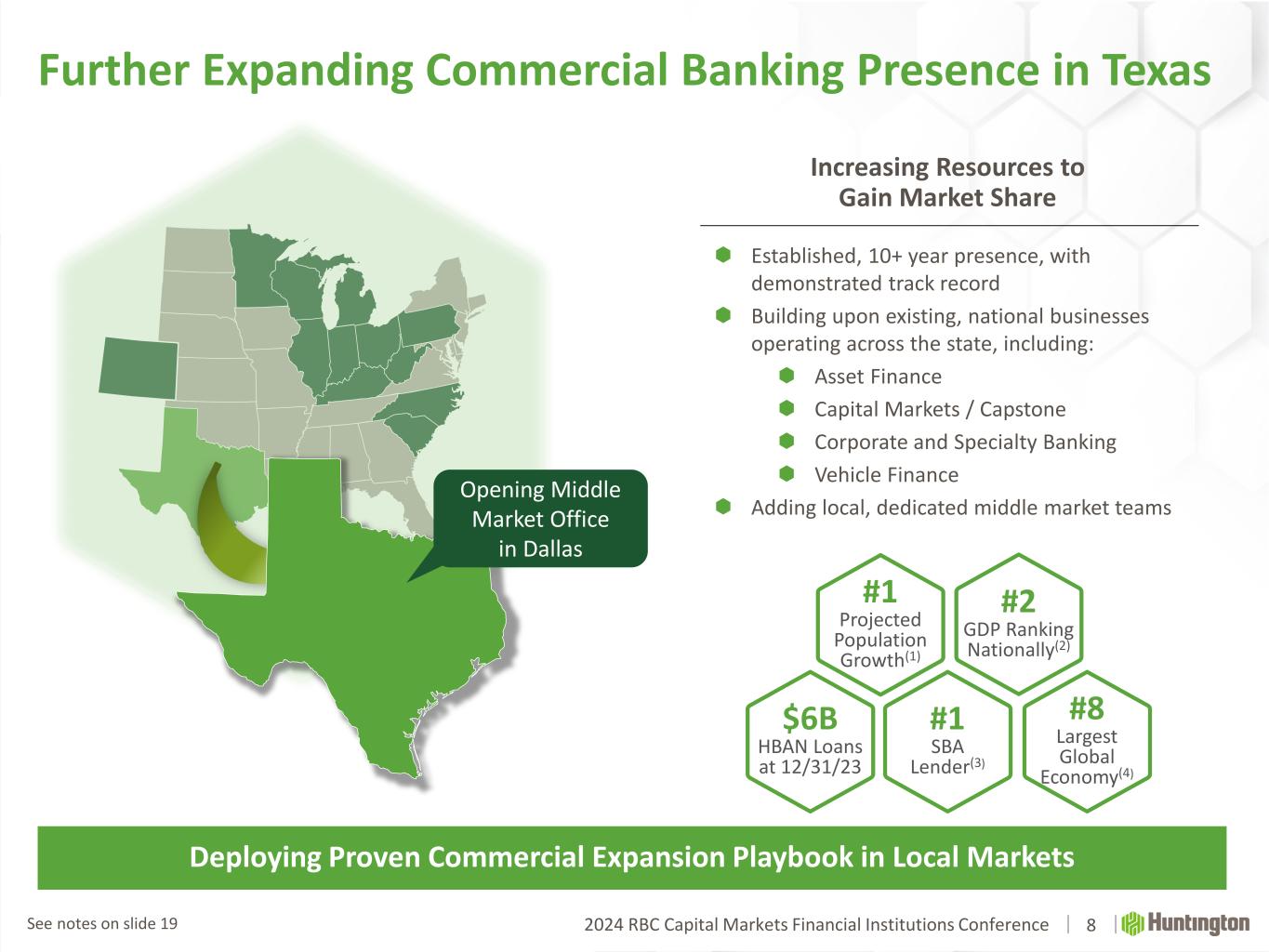2024 RBC Capital Markets Financial Institutions Conference Well-positioned to gain share in attractive, high-growth markets Seizing Opportunity in the Carolinas 7 Expect the Pace of Production to Increase Over the Course of 2024  5 regions staffed with experienced bankers  Building on existing coverage of corporate and specialty banking  Managing relationships locally and leveraging national expertise  Focused on middle market, corporate and specialty banking, regional banking, SBA, and practice finance. Full relationships with loans, deposits, capital markets, and payment revenues Triad Coastal S.C. Upstate S.C. Charlotte Raleigh / Durham $3B HBAN Loans at 12/31/23 #3 Projected Population Growth(1) #2 SBA Lender N. Carolina(3) #5 GDP Ranking Nationally(2) #4 SBA Lender S. Carolina(3) See notes on slide 19