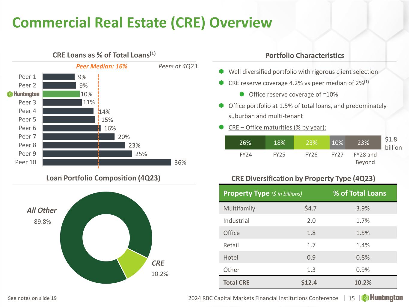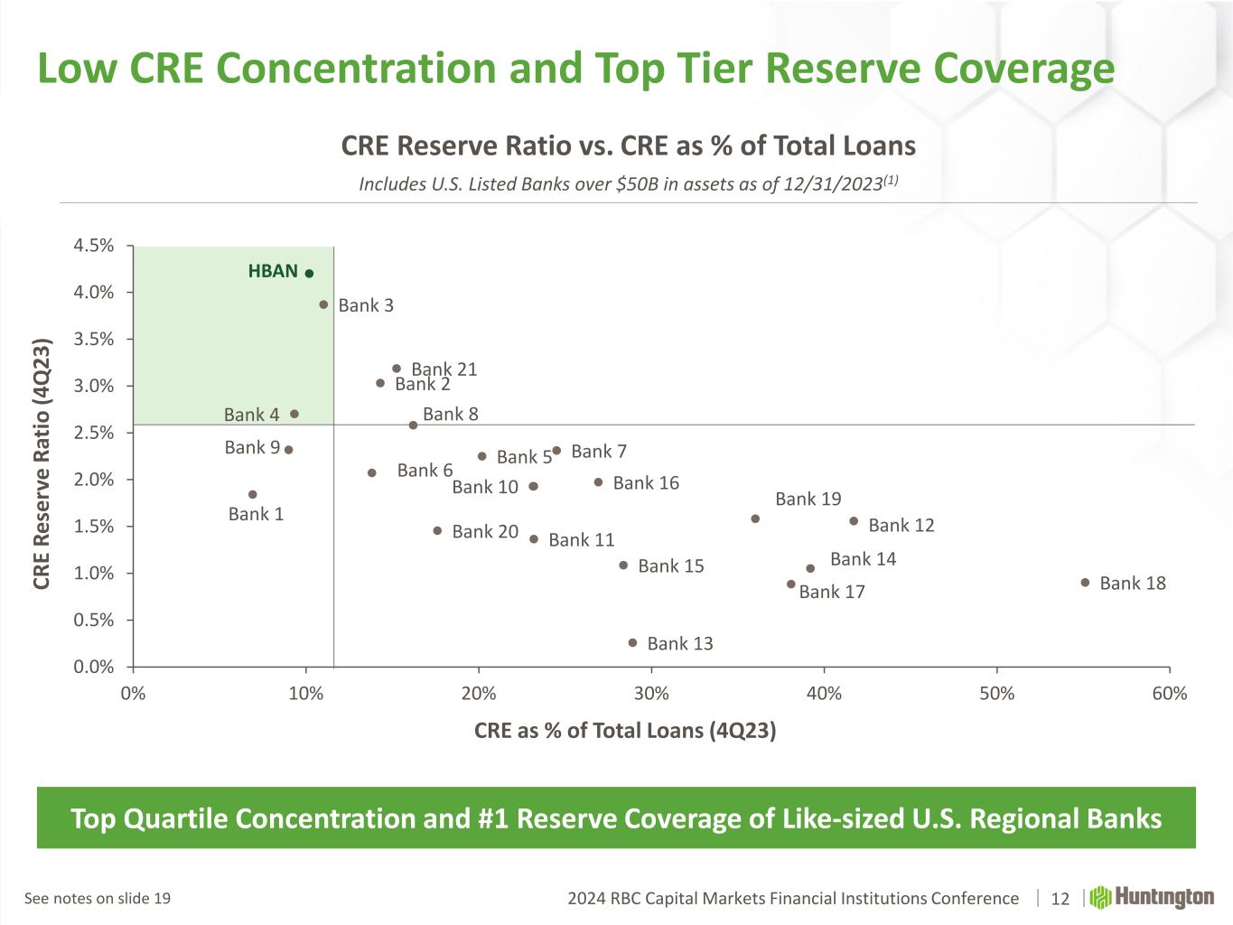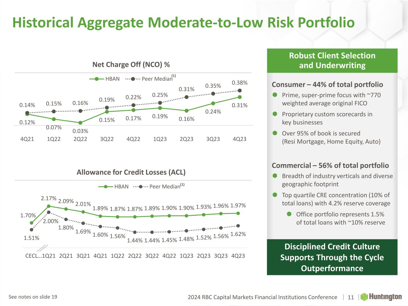 2024 RBC Capital Markets Financial Institutions Conference 0.12% 0.07% 0.03% 0.15% 0.17% 0.19% 0.16% 0.24% 0.31%0.14% 0.15% 0.16% 0.19% 0.22% 0.25% 0.31% 0.35% 0.38% 4Q21 1Q22 2Q22 3Q22 4Q22 1Q23 2Q23 3Q23 4Q23 HBAN Peer Median 1.70% 2.17% 2.09% 2.01% 1.89% 1.87% 1.87% 1.89% 1.90% 1.90% 1.93% 1.96% 1.97% 1.51% 2.00% 1.80% 1.69% 1.60% 1.56% 1.44% 1.44% 1.45% 1.48% 1.52% 1.56% 1.62% CECL…1Q21 2Q21 3Q21 4Q21 1Q22 2Q22 3Q22 4Q22 1Q23 2Q23 3Q23 4Q23 HBAN Peer Median Historical Aggregate Moderate-to-Low Risk Portfolio Allowance for Credit Losses (ACL) 11 (1) Net Charge Off (NCO) % (1) Robust Client Selection and Underwriting Disciplined Credit Culture Supports Through the Cycle Outperformance Consumer – 44% of total portfolio  Prime, super-prime focus with ~770 weighted average original FICO  Proprietary custom scorecards in key businesses  Over 95% of book is secured (Resi Mortgage, Home Equity, Auto) Commercial – 56% of total portfolio  Breadth of industry verticals and diverse geographic footprint  Top quartile CRE concentration (10% of total loans) with 4.2% reserve coverage  Office portfolio represents 1.5% of total loans with ~10% reserve See notes on slide 19