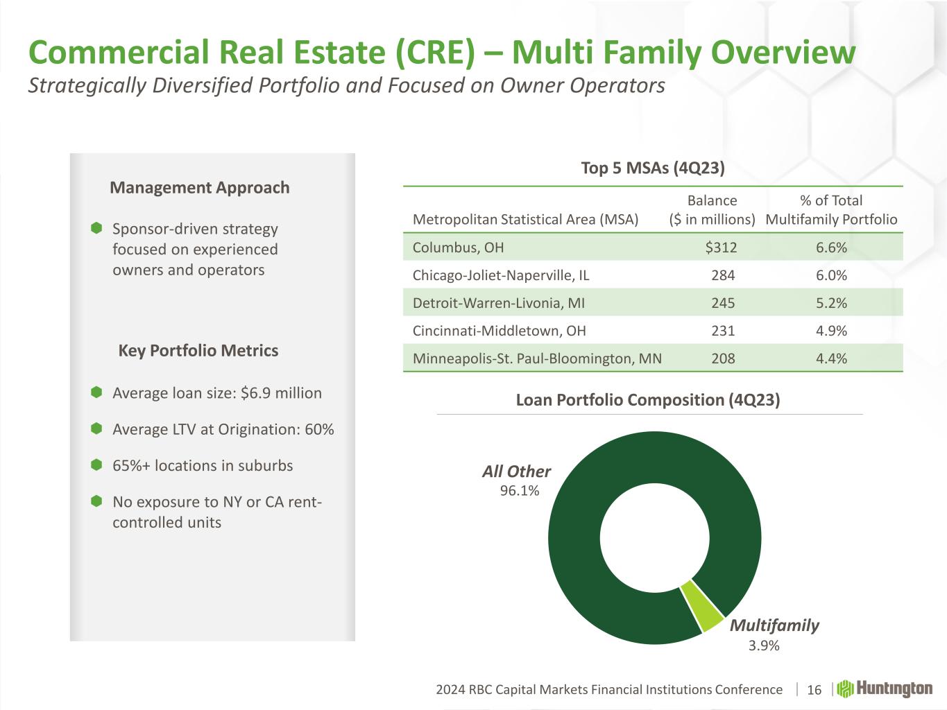 2024 RBC Capital Markets Financial Institutions Conference 9% 9% 10% 11% 14% 15% 16% 20% 23% 25% 36% Peer 1 Peer 2 HBAN Peer 3 Peer 4 Peer 5 Peer 6 Peer 7 Peer 8 Peer 9 Peer 10  Well diversified portfolio with rigorous client selection  CRE reserve coverage 4.2% vs peer median of 2%(1)  Office reserve coverage of ~10%  Office portfolio at 1.5% of total loans, and predominately suburban and multi-tenant  CRE – Office maturities (% by year): CRE Loans as % of Total Loans(1) Commercial Real Estate (CRE) Overview 15 Portfolio Characteristics CRE Diversification by Property Type (4Q23) Peer Median: 16% Loan Portfolio Composition (4Q23) Property Type ($ in billions) % of Total Loans Multifamily $4.7 3.9% Industrial 2.0 1.7% Office 1.8 1.5% Retail 1.7 1.4% Hotel 0.9 0.8% Other 1.3 0.9% Total CRE $12.4 10.2% Peers at 4Q23 89.8% 10.2% CRE All Other 26% 18% 23% 10% 23% $1.8 billion FY24 FY25 FY26 FY27 FY28 and Beyond See notes on slide 19