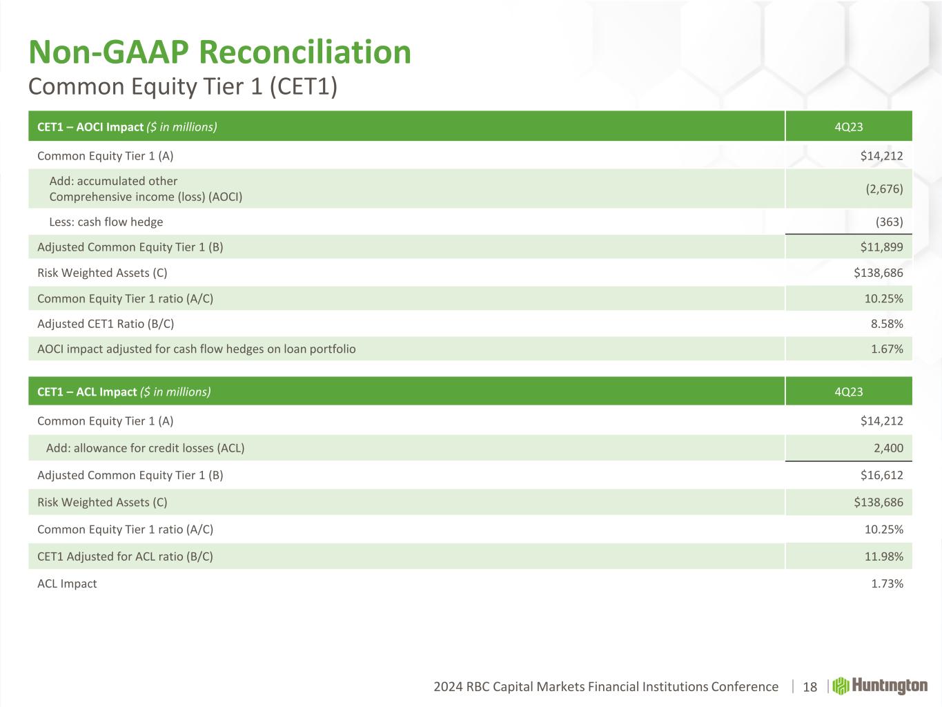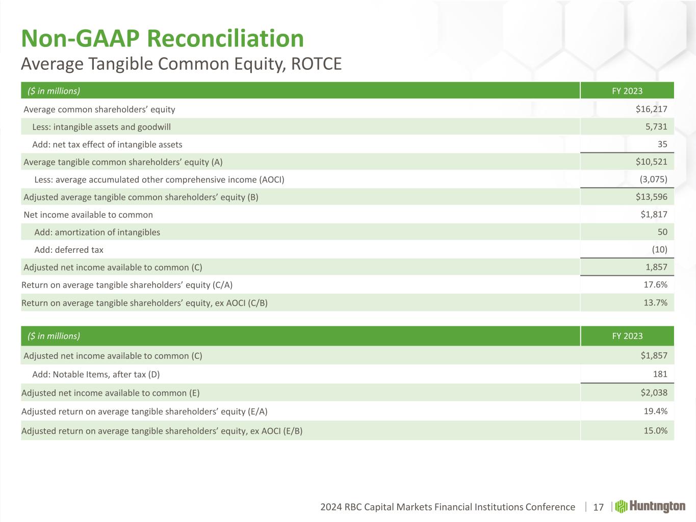 2024 RBC Capital Markets Financial Institutions Conference Non-GAAP Reconciliation Average Tangible Common Equity, ROTCE ($ in millions) FY 2023 Average common shareholders’ equity $16,217 Less: intangible assets and goodwill 5,731 Add: net tax effect of intangible assets 35 Average tangible common shareholders’ equity (A) $10,521 Less: average accumulated other comprehensive income (AOCI) (3,075) Adjusted average tangible common shareholders’ equity (B) $13,596 Net income available to common $1,817 Add: amortization of intangibles 50 Add: deferred tax (10) Adjusted net income available to common (C) 1,857 Return on average tangible shareholders’ equity (C/A) 17.6% Return on average tangible shareholders’ equity, ex AOCI (C/B) 13.7% ($ in millions) FY 2023 Adjusted net income available to common (C) $1,857 Add: Notable Items, after tax (D) 181 Adjusted net income available to common (E) $2,038 Adjusted return on average tangible shareholders’ equity (E/A) 19.4% Adjusted return on average tangible shareholders’ equity, ex AOCI (E/B) 15.0% 17