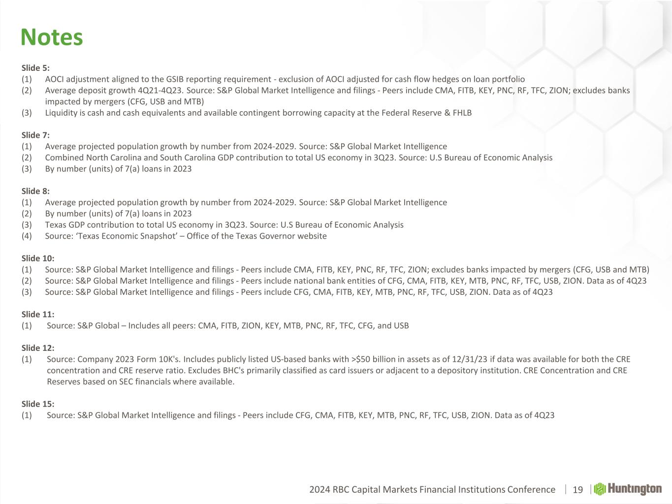 2024 RBC Capital Markets Financial Institutions Conference Notes 19 Slide 5: (1) AOCI adjustment aligned to the GSIB reporting requirement - exclusion of AOCI adjusted for cash flow hedges on loan portfolio (2) Average deposit growth 4Q21-4Q23. Source: S&P Global Market Intelligence and filings - Peers include CMA, FITB, KEY, PNC, RF, TFC, ZION; excludes banks impacted by mergers (CFG, USB and MTB) (3) Liquidity is cash and cash equivalents and available contingent borrowing capacity at the Federal Reserve & FHLB Slide 7: (1) Average projected population growth by number from 2024-2029. Source: S&P Global Market Intelligence (2) Combined North Carolina and South Carolina GDP contribution to total US economy in 3Q23. Source: U.S Bureau of Economic Analysis (3) By number (units) of 7(a) loans in 2023 Slide 8: (1) Average projected population growth by number from 2024-2029. Source: S&P Global Market Intelligence (2) By number (units) of 7(a) loans in 2023 (3) Texas GDP contribution to total US economy in 3Q23. Source: U.S Bureau of Economic Analysis (4) Source: ‘Texas Economic Snapshot’ – Office of the Texas Governor website Slide 10: (1) Source: S&P Global Market Intelligence and filings - Peers include CMA, FITB, KEY, PNC, RF, TFC, ZION; excludes banks impacted by mergers (CFG, USB and MTB) (2) Source: S&P Global Market Intelligence and filings - Peers include national bank entities of CFG, CMA, FITB, KEY, MTB, PNC, RF, TFC, USB, ZION. Data as of 4Q23 (3) Source: S&P Global Market Intelligence and filings - Peers include CFG, CMA, FITB, KEY, MTB, PNC, RF, TFC, USB, ZION. Data as of 4Q23 Slide 11: (1) Source: S&P Global – Includes all peers: CMA, FITB, ZION, KEY, MTB, PNC, RF, TFC, CFG, and USB Slide 12: (1) Source: Company 2023 Form 10K's. Includes publicly listed US-based banks with >$50 billion in assets as of 12/31/23 if data was available for both the CRE concentration and CRE reserve ratio. Excludes BHC's primarily classified as card issuers or adjacent to a depository institution. CRE Concentration and CRE Reserves based on SEC financials where available. Slide 15: (1) Source: S&P Global Market Intelligence and filings - Peers include CFG, CMA, FITB, KEY, MTB, PNC, RF, TFC, USB, ZION. Data as of 4Q23