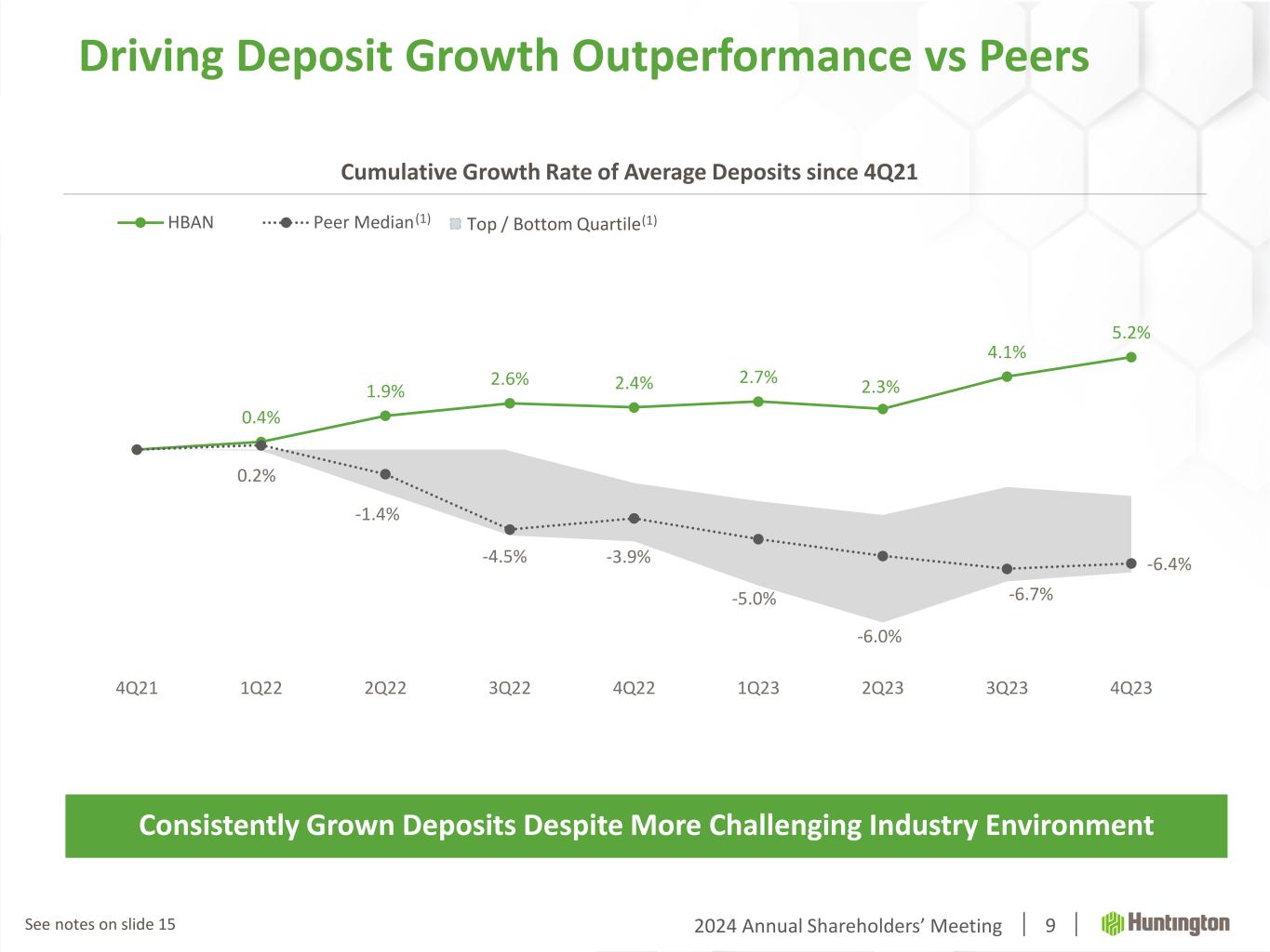 2024 Annual Shareholders’ Meeting 8 $174 $183 $189 2021 2022 2023 $143 $148 $151 2021 2022 2023 Total Assets $189 Billion Total Loans $122 Billion Total Deposits $151 Billion EQUIPMENT FINANCE SBA LENDER #6 #1 NATIONALLY NATIONALLY (6 Years) $112 $120 $122 2021 2022 2023 Huntington Bancshares Snapshot Top 10 Regional Bank in the U.S. (1) (2)11.3% 20.7% 17.6% 19.1% 21.5% 19.4% 2021 2022 2023 Notable Items ROTCE (GAAP) Return on Tangible Common Equity % Pre-Provision Net Revenue (PPNR) $1.6 $3.1 $2.8 $2.3 $3.2 $3.1 0.0 0 0.5 0 1.0 0 1.5 0 2.0 0 2.5 0 3.0 0 3.5 0 4.0 0 2021 2022 2023 Notable Items PPNR (GAAP) See reconciliations on slide 16 (PPNR) and slide 17 (ROTCE) See notes on slide 15