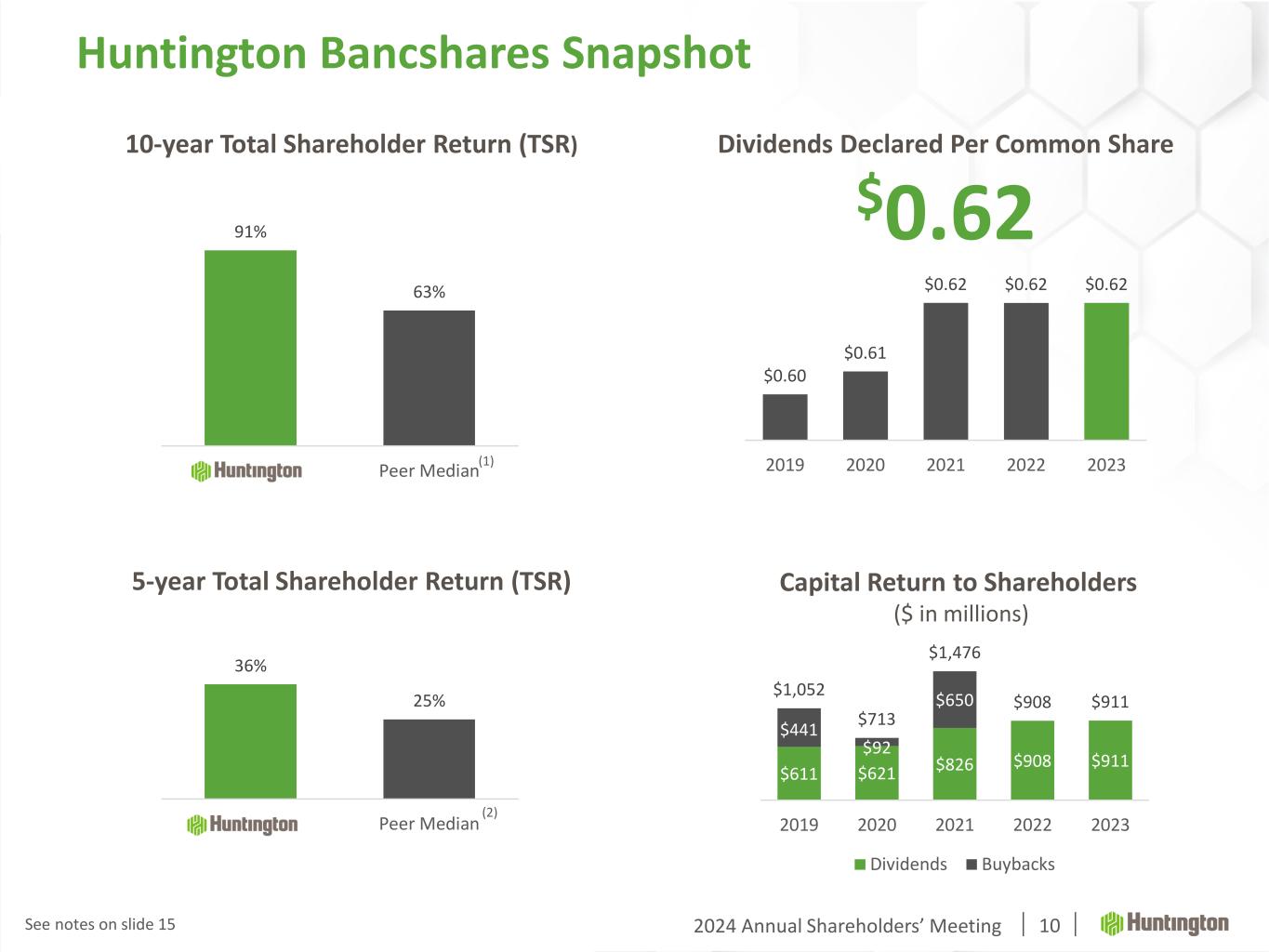 2024 Annual Shareholders’ Meeting 9 Driving Deposit Growth Outperformance vs Peers 0.4% 1.9% 2.6% 2.4% 2.7% 2.3% 4.1% 5.2% 0.2% -1.4% -4.5% -3.9% -5.0% -6.0% -6.7% -6.4% 4Q21 1Q22 2Q22 3Q22 4Q22 1Q23 2Q23 3Q23 4Q23 HBAN Peer Median(1) Cumulative Growth Rate of Average Deposits since 4Q21 Top / Bottom Quartile(1) Consistently Grown Deposits Despite More Challenging Industry Environment See notes on slide 15