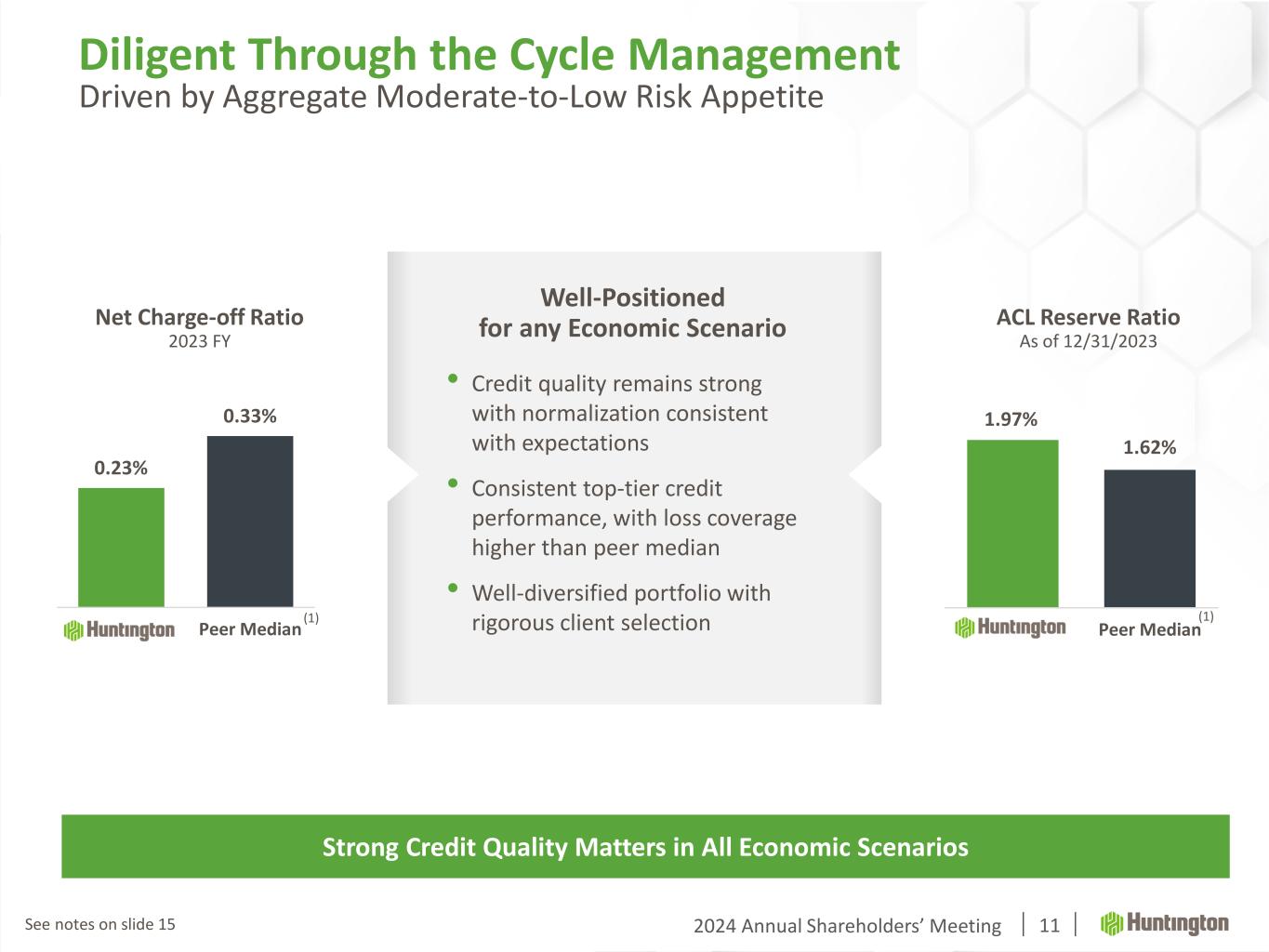 2024 Annual Shareholders’ Meeting 5-year Total Shareholder Return (TSR) 36% 25% HBAN Peer Median (2) Capital Return to Shareholders ($ in millions) $611 $621 $826 $908 $911 $441 $92 $650$1,052 $713 $1,476 $908 $911 2019 2020 2021 2022 2023 Dividends Buybacks Dividends Declared Per Common Share $0.62 $0.60 $0.61 $0.62 $0.62 $0.62 2019 2020 2021 2022 2023 10-year Total Shareholder Return (TSR) Huntington Bancshares Snapshot 10 91% 63% HBAN Peer Median(1) See notes on slide 15
