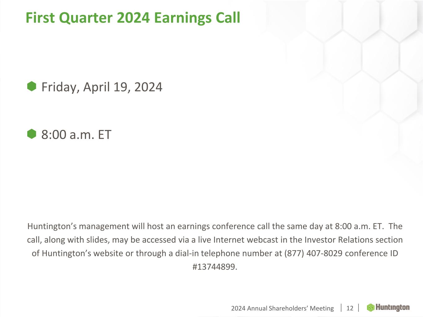 2024 Annual Shareholders’ Meeting 12 First Quarter 2024 Earnings Call  Friday, April 19, 2024  8:00 a.m. ET Huntington’s management will host an earnings conference call the same day at 8:00 a.m. ET. The call, along with slides, may be accessed via a live Internet webcast in the Investor Relations section of Huntington’s website or through a dial-in telephone number at (877) 407-8029 conference ID #13744899.