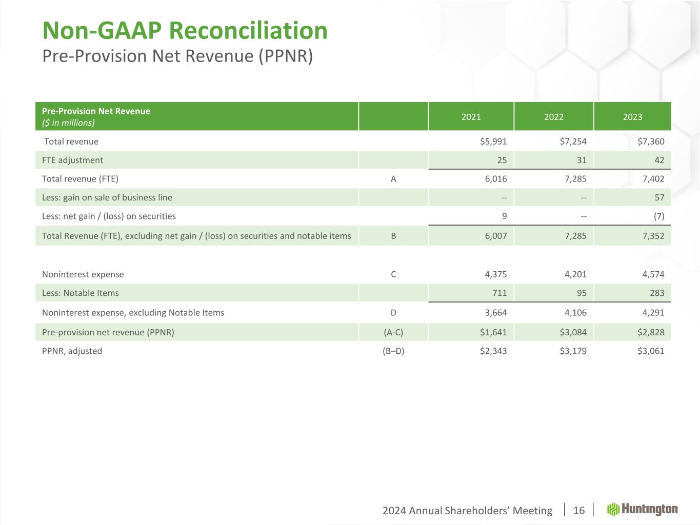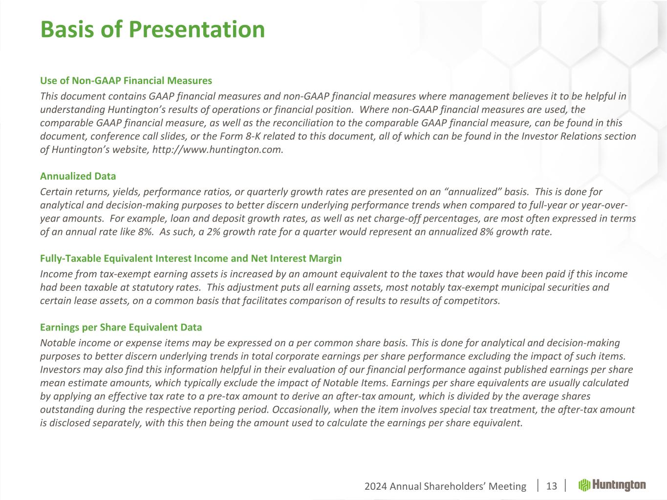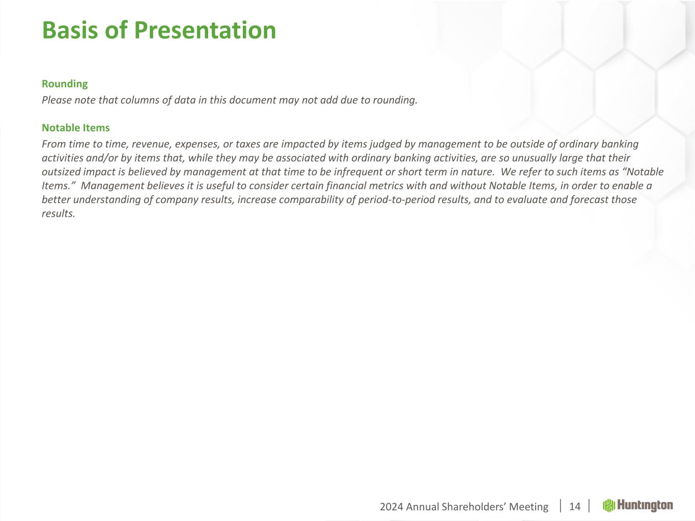 2024 Annual Shareholders’ Meeting 13 Use of Non-GAAP Financial Measures This document contains GAAP financial measures and non-GAAP financial measures where management believes it to be helpful in understanding Huntington’s results of operations or financial position. Where non-GAAP financial measures are used, the comparable GAAP financial measure, as well as the reconciliation to the comparable GAAP financial measure, can be found in this document, conference call slides, or the Form 8-K related to this document, all of which can be found in the Investor Relations section of Huntington’s website, http://www.huntington.com. Annualized Data Certain returns, yields, performance ratios, or quarterly growth rates are presented on an “annualized” basis. This is done for analytical and decision-making purposes to better discern underlying performance trends when compared to full-year or year-over- year amounts. For example, loan and deposit growth rates, as well as net charge-off percentages, are most often expressed in terms of an annual rate like 8%. As such, a 2% growth rate for a quarter would represent an annualized 8% growth rate. Fully-Taxable Equivalent Interest Income and Net Interest Margin Income from tax-exempt earning assets is increased by an amount equivalent to the taxes that would have been paid if this income had been taxable at statutory rates. This adjustment puts all earning assets, most notably tax-exempt municipal securities and certain lease assets, on a common basis that facilitates comparison of results to results of competitors. Earnings per Share Equivalent Data Notable income or expense items may be expressed on a per common share basis. This is done for analytical and decision-making purposes to better discern underlying trends in total corporate earnings per share performance excluding the impact of such items. Investors may also find this information helpful in their evaluation of our financial performance against published earnings per share mean estimate amounts, which typically exclude the impact of Notable Items. Earnings per share equivalents are usually calculated by applying an effective tax rate to a pre-tax amount to derive an after-tax amount, which is divided by the average shares outstanding during the respective reporting period. Occasionally, when the item involves special tax treatment, the after-tax amount is disclosed separately, with this then being the amount used to calculate the earnings per share equivalent. Basis of Presentation