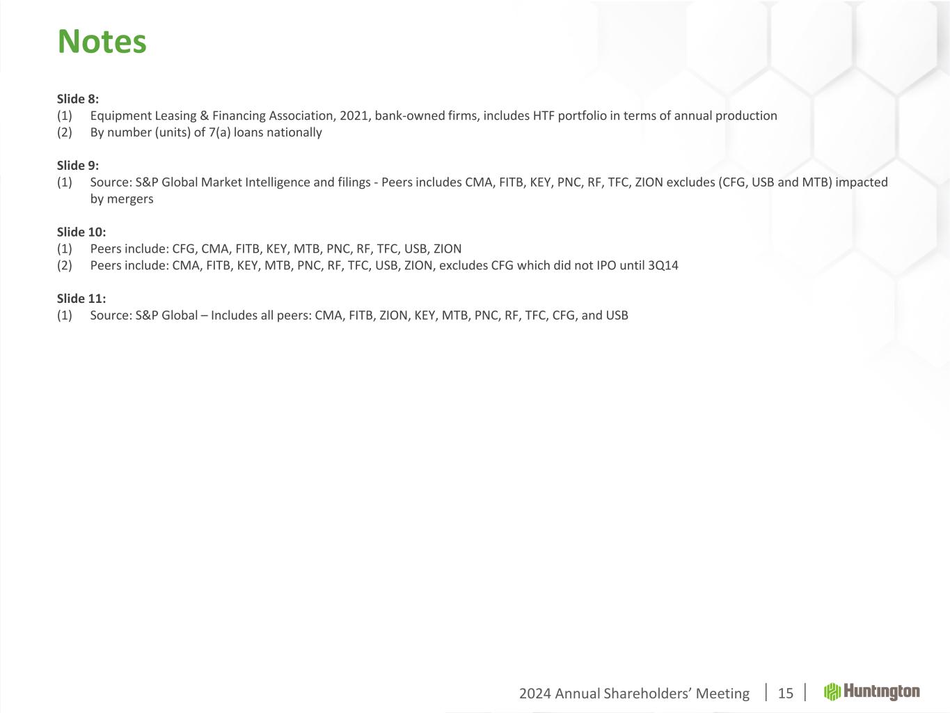 2024 Annual Shareholders’ Meeting Slide 8: (1) Equipment Leasing & Financing Association, 2021, bank-owned firms, includes HTF portfolio in terms of annual production (2) By number (units) of 7(a) loans nationally Slide 9: (1) Source: S&P Global Market Intelligence and filings - Peers includes CMA, FITB, KEY, PNC, RF, TFC, ZION excludes (CFG, USB and MTB) impacted by mergers Slide 10: (1) Peers include: CFG, CMA, FITB, KEY, MTB, PNC, RF, TFC, USB, ZION (2) Peers include: CMA, FITB, KEY, MTB, PNC, RF, TFC, USB, ZION, excludes CFG which did not IPO until 3Q14 Slide 11: (1) Source: S&P Global – Includes all peers: CMA, FITB, ZION, KEY, MTB, PNC, RF, TFC, CFG, and USB Notes 15