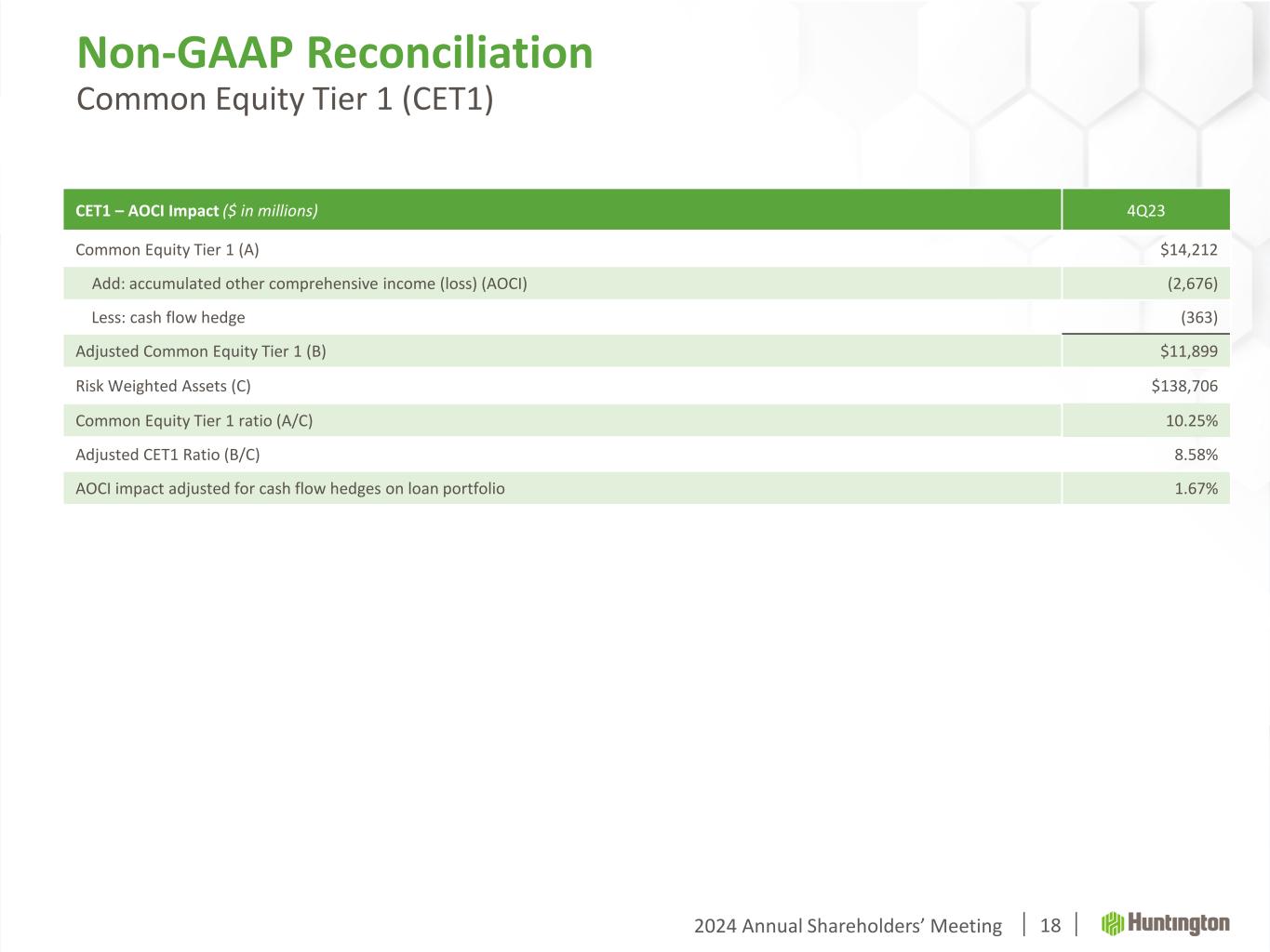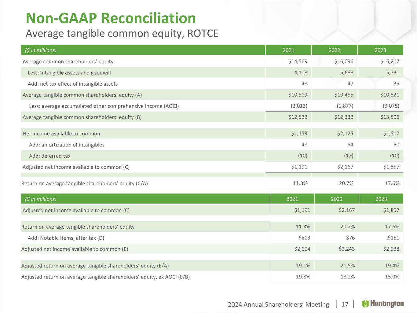 2024 Annual Shareholders’ Meeting ($ in millions) 2021 2022 2023 Average common shareholders’ equity $14,569 $16,096 $16,217 Less: intangible assets and goodwill 4,108 5,688 5,731 Add: net tax effect of intangible assets 48 47 35 Average tangible common shareholders’ equity (A) $10,509 $10,455 $10,521 Less: average accumulated other comprehensive income (AOCI) (2,013) (1,877) (3,075) Average tangible common shareholders’ equity (B) $12,522 $12,332 $13,596 Net income available to common $1,153 $2,125 $1,817 Add: amortization of intangibles 48 54 50 Add: deferred tax (10) (12) (10) Adjusted net income available to common (C) $1,191 $2,167 $1,857 Return on average tangible shareholders’ equity (C/A) 11.3% 20.7% 17.6% ($ in millions) 2021 2022 2023 Adjusted net income available to common (C) $1,191 $2,167 $1,857 Return on average tangible shareholders’ equity 11.3% 20.7% 17.6% Add: Notable Items, after tax (D) $813 $76 $181 Adjusted net income available to common (E) $2,004 $2,243 $2,038 Adjusted return on average tangible shareholders’ equity (E/A) 19.1% 21.5% 19.4% Adjusted return on average tangible shareholders’ equity, ex AOCI (E/B) 19.8% 18.2% 15.0% Non-GAAP Reconciliation Average tangible common equity, ROTCE 17