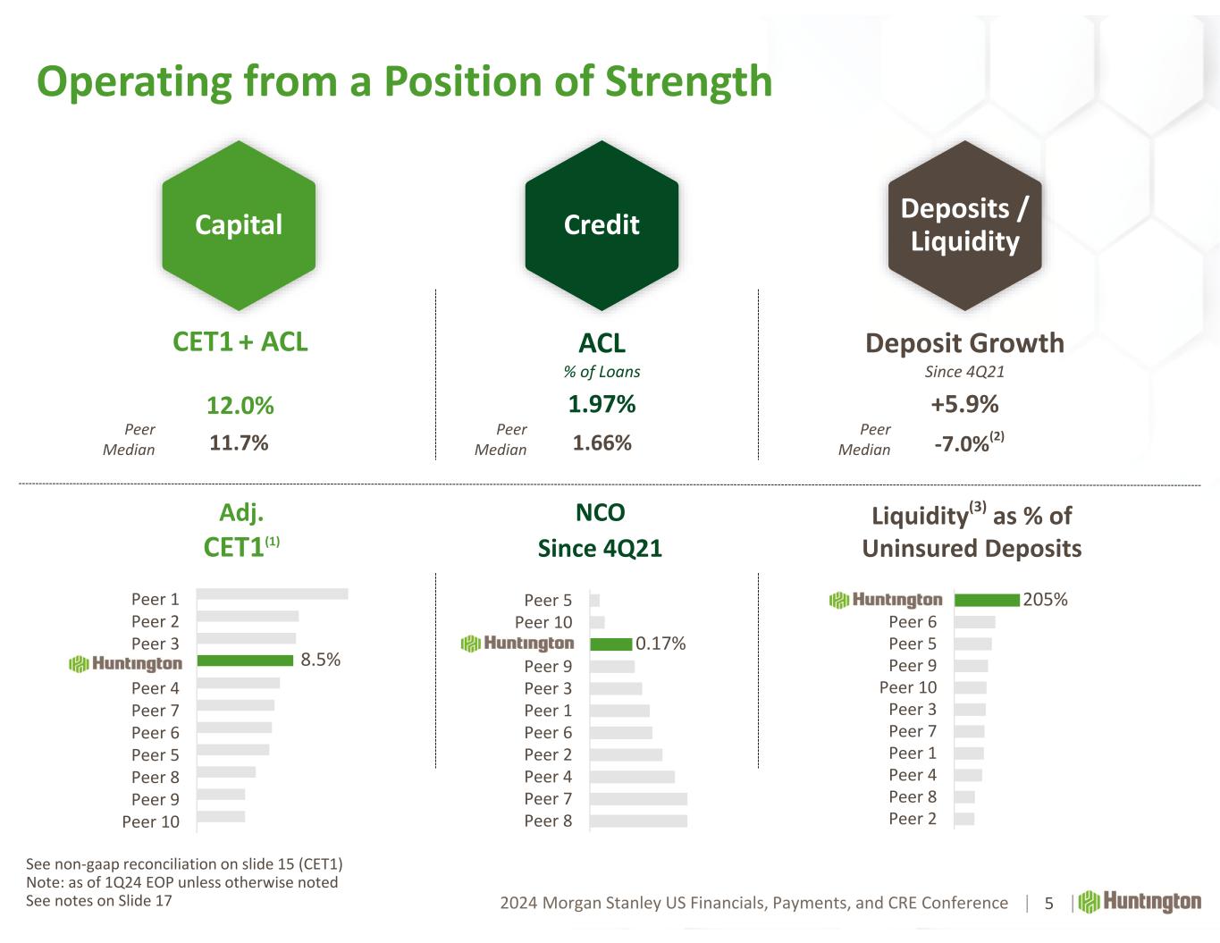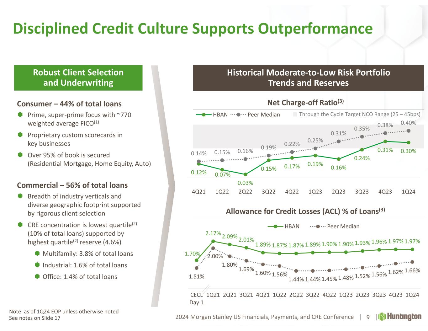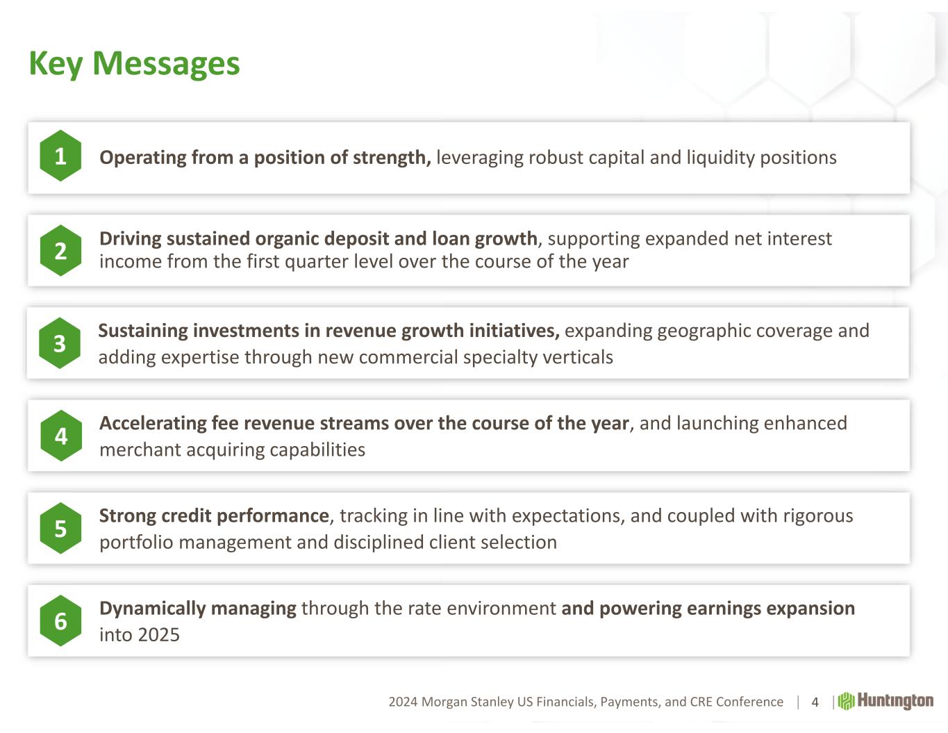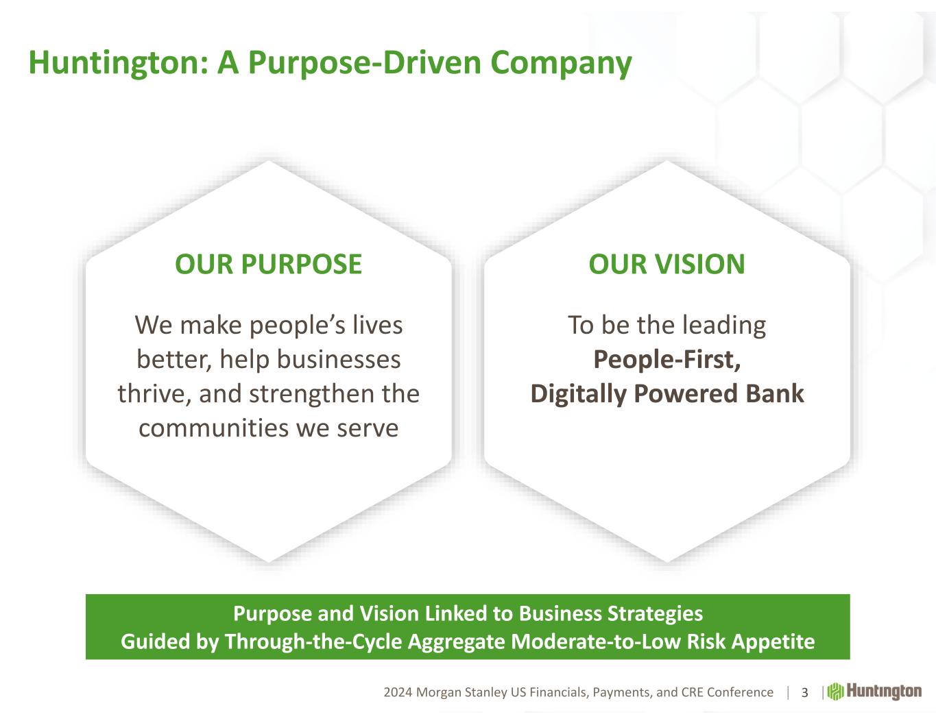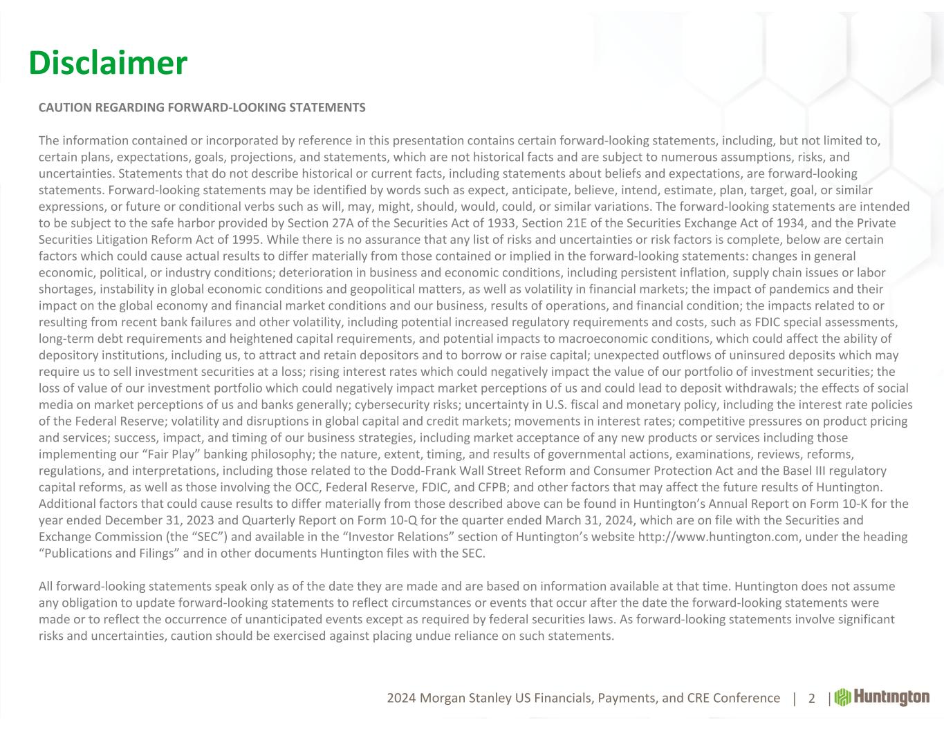 22024 Morgan Stanley US Financials, Payments, and CRE Conference Disclaimer CAUTION REGARDING FORWARD-LOOKING STATEMENTS The information contained or incorporated by reference in this presentation contains certain forward-looking statements, including, but not limited to, certain plans, expectations, goals, projections, and statements, which are not historical facts and are subject to numerous assumptions, risks, and uncertainties. Statements that do not describe historical or current facts, including statements about beliefs and expectations, are forward-looking statements. Forward-looking statements may be identified by words such as expect, anticipate, believe, intend, estimate, plan, target, goal, or similar expressions, or future or conditional verbs such as will, may, might, should, would, could, or similar variations. The forward-looking statements are intended to be subject to the safe harbor provided by Section 27A of the Securities Act of 1933, Section 21E of the Securities Exchange Act of 1934, and the Private Securities Litigation Reform Act of 1995. While there is no assurance that any list of risks and uncertainties or risk factors is complete, below are certain factors which could cause actual results to differ materially from those contained or implied in the forward-looking statements: changes in general economic, political, or industry conditions; deterioration in business and economic conditions, including persistent inflation, supply chain issues or labor shortages, instability in global economic conditions and geopolitical matters, as well as volatility in financial markets; the impact of pandemics and their impact on the global economy and financial market conditions and our business, results of operations, and financial condition; the impacts related to or resulting from recent bank failures and other volatility, including potential increased regulatory requirements and costs, such as FDIC special assessments, long-term debt requirements and heightened capital requirements, and potential impacts to macroeconomic conditions, which could affect the ability of depository institutions, including us, to attract and retain depositors and to borrow or raise capital; unexpected outflows of uninsured deposits which may require us to sell investment securities at a loss; rising interest rates which could negatively impact the value of our portfolio of investment securities; the loss of value of our investment portfolio which could negatively impact market perceptions of us and could lead to deposit withdrawals; the effects of social media on market perceptions of us and banks generally; cybersecurity risks; uncertainty in U.S. fiscal and monetary policy, including the interest rate policies of the Federal Reserve; volatility and disruptions in global capital and credit markets; movements in interest rates; competitive pressures on product pricing and services; success, impact, and timing of our business strategies, including market acceptance of any new products or services including those implementing our “Fair Play” banking philosophy; the nature, extent, timing, and results of governmental actions, examinations, reviews, reforms, regulations, and interpretations, including those related to the Dodd-Frank Wall Street Reform and Consumer Protection Act and the Basel III regulatory capital reforms, as well as those involving the OCC, Federal Reserve, FDIC, and CFPB; and other factors that may affect the future results of Huntington. Additional factors that could cause results to differ materially from those described above can be found in Huntington’s Annual Report on Form 10-K for the year ended December 31, 2023 and Quarterly Report on Form 10-Q for the quarter ended March 31, 2024, which are on file with the Securities and Exchange Commission (the “SEC”) and available in the “Investor Relations” section of Huntington’s website http://www.huntington.com, under the heading “Publications and Filings” and in other documents Huntington files with the SEC. All forward-looking statements speak only as of the date they are made and are based on information available at that time. Huntington does not assume any obligation to update forward-looking statements to reflect circumstances or events that occur after the date the forward-looking statements were made or to reflect the occurrence of unanticipated events except as required by federal securities laws. As forward-looking statements involve significant risks and uncertainties, caution should be exercised against placing undue reliance on such statements.