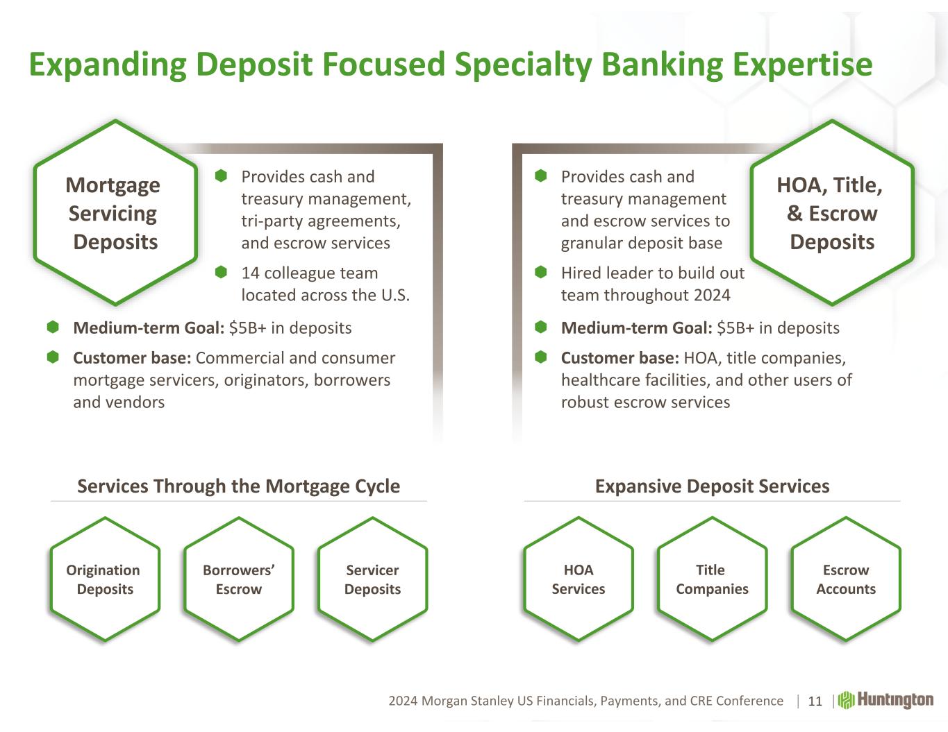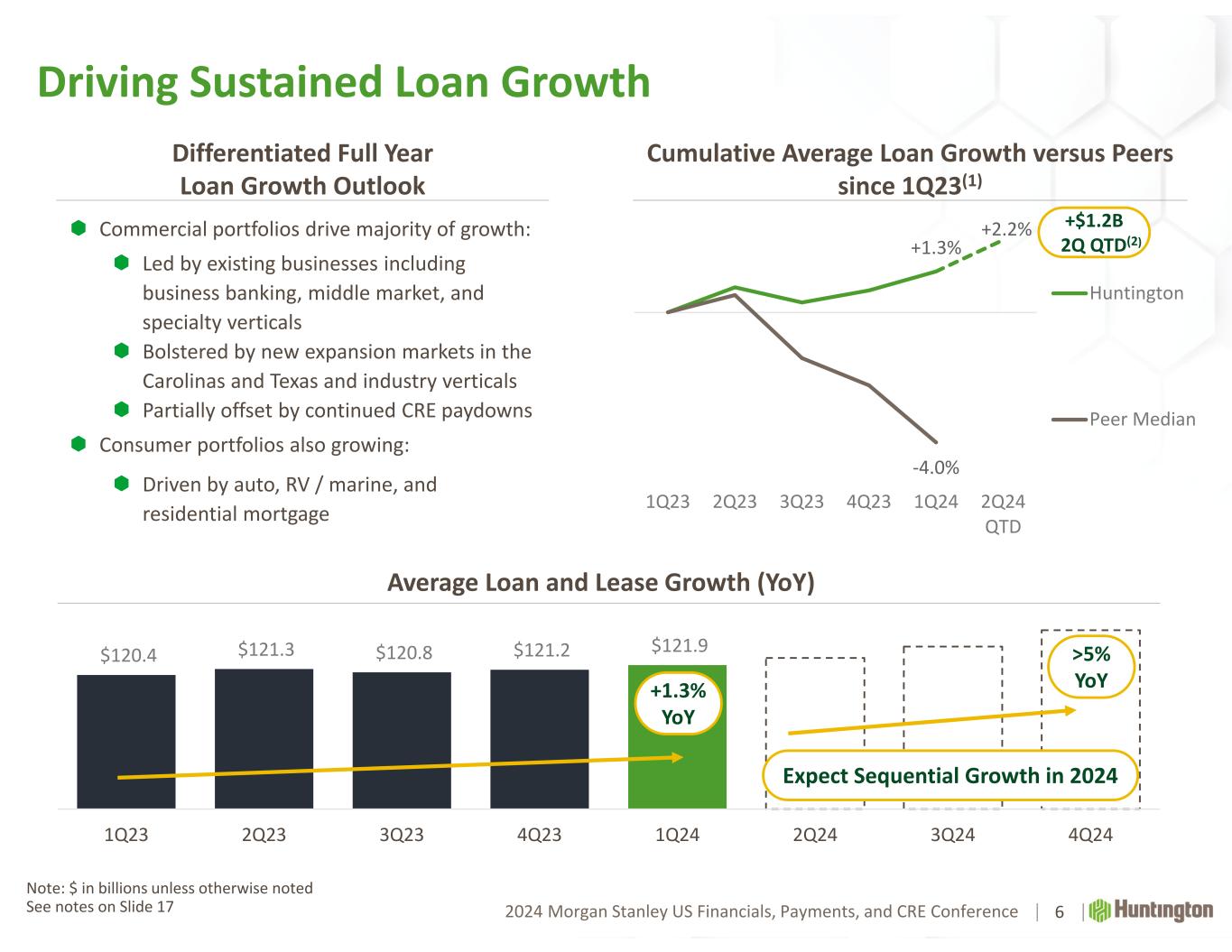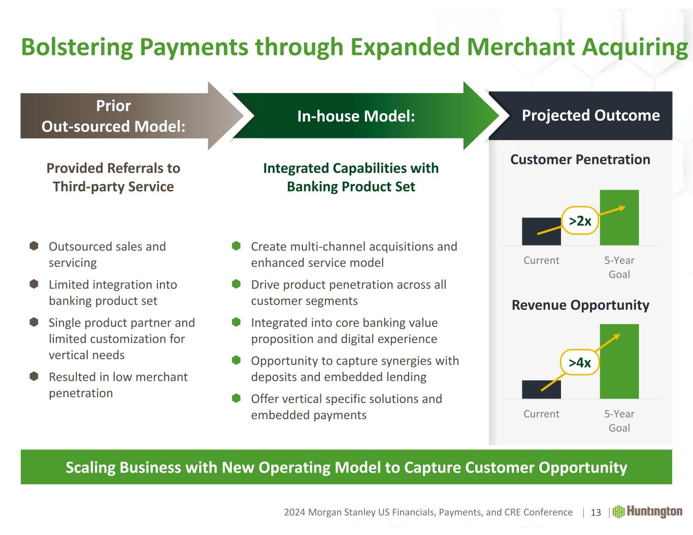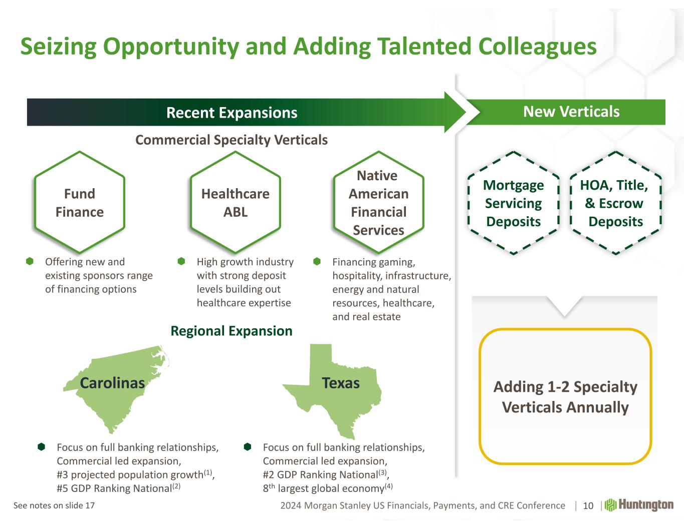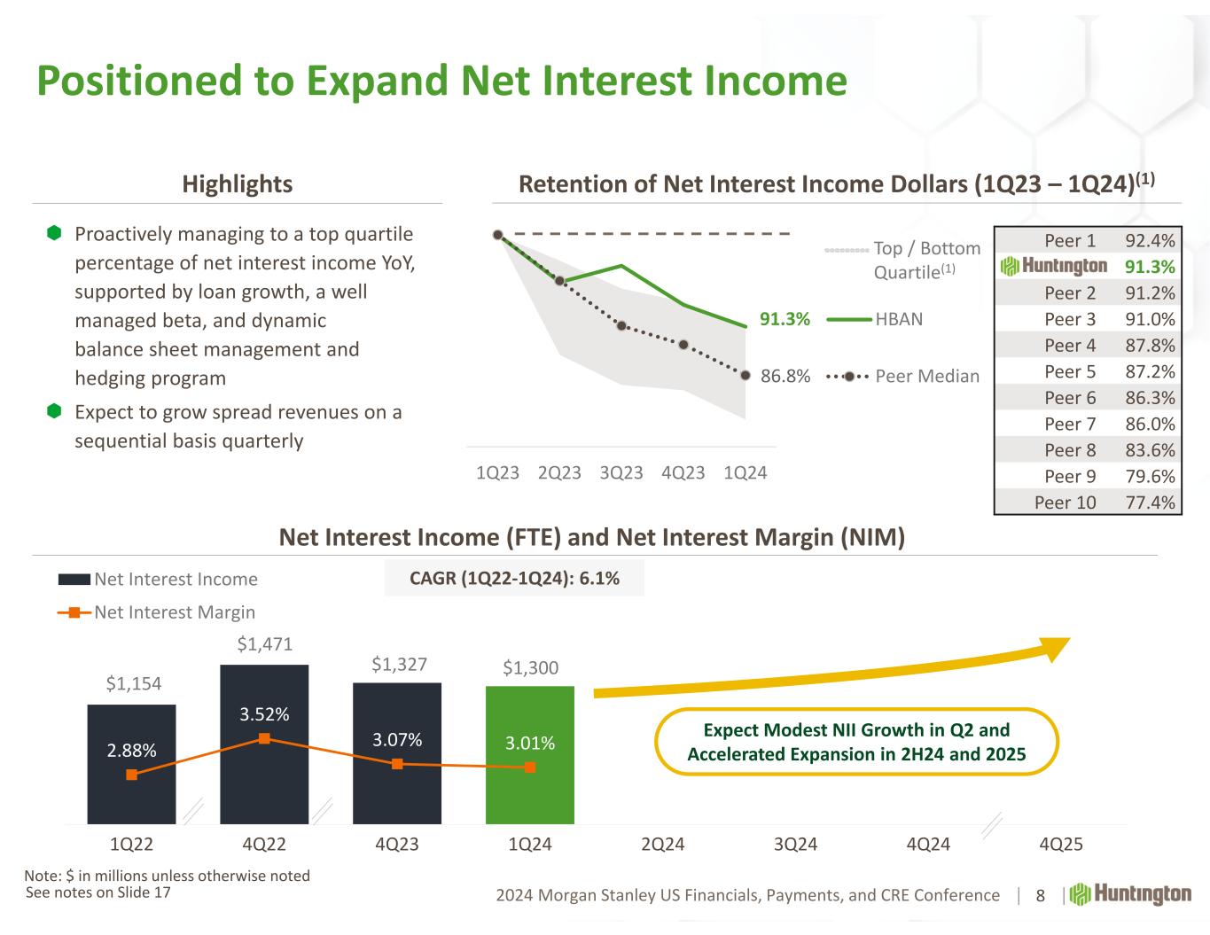 22024 Morgan Stanley US Financials, Payments, and CRE Conference Disclaimer CAUTION REGARDING FORWARD-LOOKING STATEMENTS The information contained or incorporated by reference in this presentation contains certain forward-looking statements, including, but not limited to, certain plans, expectations, goals, projections, and statements, which are not historical facts and are subject to numerous assumptions, risks, and uncertainties. Statements that do not describe historical or current facts, including statements about beliefs and expectations, are forward-looking statements. Forward-looking statements may be identified by words such as expect, anticipate, believe, intend, estimate, plan, target, goal, or similar expressions, or future or conditional verbs such as will, may, might, should, would, could, or similar variations. The forward-looking statements are intended to be subject to the safe harbor provided by Section 27A of the Securities Act of 1933, Section 21E of the Securities Exchange Act of 1934, and the Private Securities Litigation Reform Act of 1995. While there is no assurance that any list of risks and uncertainties or risk factors is complete, below are certain factors which could cause actual results to differ materially from those contained or implied in the forward-looking statements: changes in general economic, political, or industry conditions; deterioration in business and economic conditions, including persistent inflation, supply chain issues or labor shortages, instability in global economic conditions and geopolitical matters, as well as volatility in financial markets; the impact of pandemics and their impact on the global economy and financial market conditions and our business, results of operations, and financial condition; the impacts related to or resulting from recent bank failures and other volatility, including potential increased regulatory requirements and costs, such as FDIC special assessments, long-term debt requirements and heightened capital requirements, and potential impacts to macroeconomic conditions, which could affect the ability of depository institutions, including us, to attract and retain depositors and to borrow or raise capital; unexpected outflows of uninsured deposits which may require us to sell investment securities at a loss; rising interest rates which could negatively impact the value of our portfolio of investment securities; the loss of value of our investment portfolio which could negatively impact market perceptions of us and could lead to deposit withdrawals; the effects of social media on market perceptions of us and banks generally; cybersecurity risks; uncertainty in U.S. fiscal and monetary policy, including the interest rate policies of the Federal Reserve; volatility and disruptions in global capital and credit markets; movements in interest rates; competitive pressures on product pricing and services; success, impact, and timing of our business strategies, including market acceptance of any new products or services including those implementing our “Fair Play” banking philosophy; the nature, extent, timing, and results of governmental actions, examinations, reviews, reforms, regulations, and interpretations, including those related to the Dodd-Frank Wall Street Reform and Consumer Protection Act and the Basel III regulatory capital reforms, as well as those involving the OCC, Federal Reserve, FDIC, and CFPB; and other factors that may affect the future results of Huntington. Additional factors that could cause results to differ materially from those described above can be found in Huntington’s Annual Report on Form 10-K for the year ended December 31, 2023 and Quarterly Report on Form 10-Q for the quarter ended March 31, 2024, which are on file with the Securities and Exchange Commission (the “SEC”) and available in the “Investor Relations” section of Huntington’s website http://www.huntington.com, under the heading “Publications and Filings” and in other documents Huntington files with the SEC. All forward-looking statements speak only as of the date they are made and are based on information available at that time. Huntington does not assume any obligation to update forward-looking statements to reflect circumstances or events that occur after the date the forward-looking statements were made or to reflect the occurrence of unanticipated events except as required by federal securities laws. As forward-looking statements involve significant risks and uncertainties, caution should be exercised against placing undue reliance on such statements.