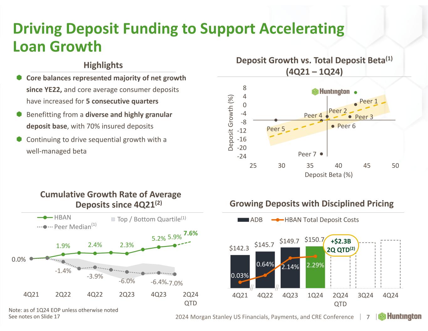 2023 Goldman Sachs US Financial Services Conference2024 Morgan Stanley US Fi an ials, Payments, and CRE $121.9 $121.2 $120.8 $121.3 $120.4 4Q243Q242Q241Q244Q233Q232Q231Q23 Differentiated Full Year Loan Growth Outlook 6 Driving Sustained Loan Growth Cumulative Average Loan Growth versus Peers since 1Q23(1) Average Loan and Lease Growth (YoY) +1.3% YoY >5% YoY Expect Sequential Growth in 2024 +1.3% +2.2% -4.0% 1Q23 2Q23 3Q23 4Q23 1Q24 2Q24 QTD Huntington Peer Median Commercial portfolios drive majority of growth: Led by existing businesses including business banking, middle market, and specialty verticals Bolstered by new expansion markets in the Carolinas and Texas and industry verticals Partially offset by continued CRE paydowns Consumer portfolios also growing: Driven by auto, RV / marine, and residential mortgage +$1.2B 2Q QTD(2) Note: $ in billions unless otherwise noted See notes on Slide 17