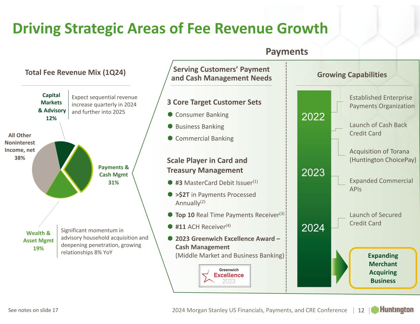 2023 Goldman Sachs US Financial Services Conference2024 Morgan Stanley US Fi an ials, Payments, and CRE Driving Strategic Areas of Fee Revenue Growth 12 Total Fee Revenue Mix (1Q24) Growing Capabilities Scale Player in Card and Treasury Management #3 MasterCard Debit Issuer(1) >$2T in Payments Processed Annually(2) Top 10 Real Time Payments Receiver(3) #11 ACH Receiver(4) 2023 Greenwich Excellence Award – Cash Management (Middle Market and Business Banking) All Other Noninterest Income, net 38% Wealth & Asset Mgmt 19% Payments & Cash Mgmt 31% Capital Markets & Advisory 12% Expect sequential revenue increase quarterly in 2024 and further into 2025 Serving Customers’ Payment and Cash Management Needs Significant momentum in advisory household acquisition and deepening penetration, growing relationships 8% YoY 3 Core Target Customer Sets Consumer Banking Business Banking Commercial Banking 2022 2023 2024 Established Enterprise Payments Organization Acquisition of Torana (Huntington ChoicePay) Expanded Commercial APIs Expanding Merchant Acquiring Business Payments Launch of Cash Back Credit Card Launch of Secured Credit Card See notes on slide 17
