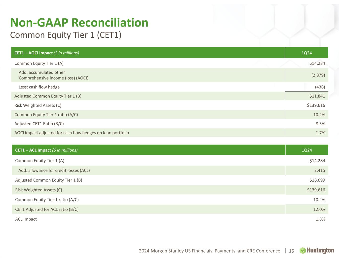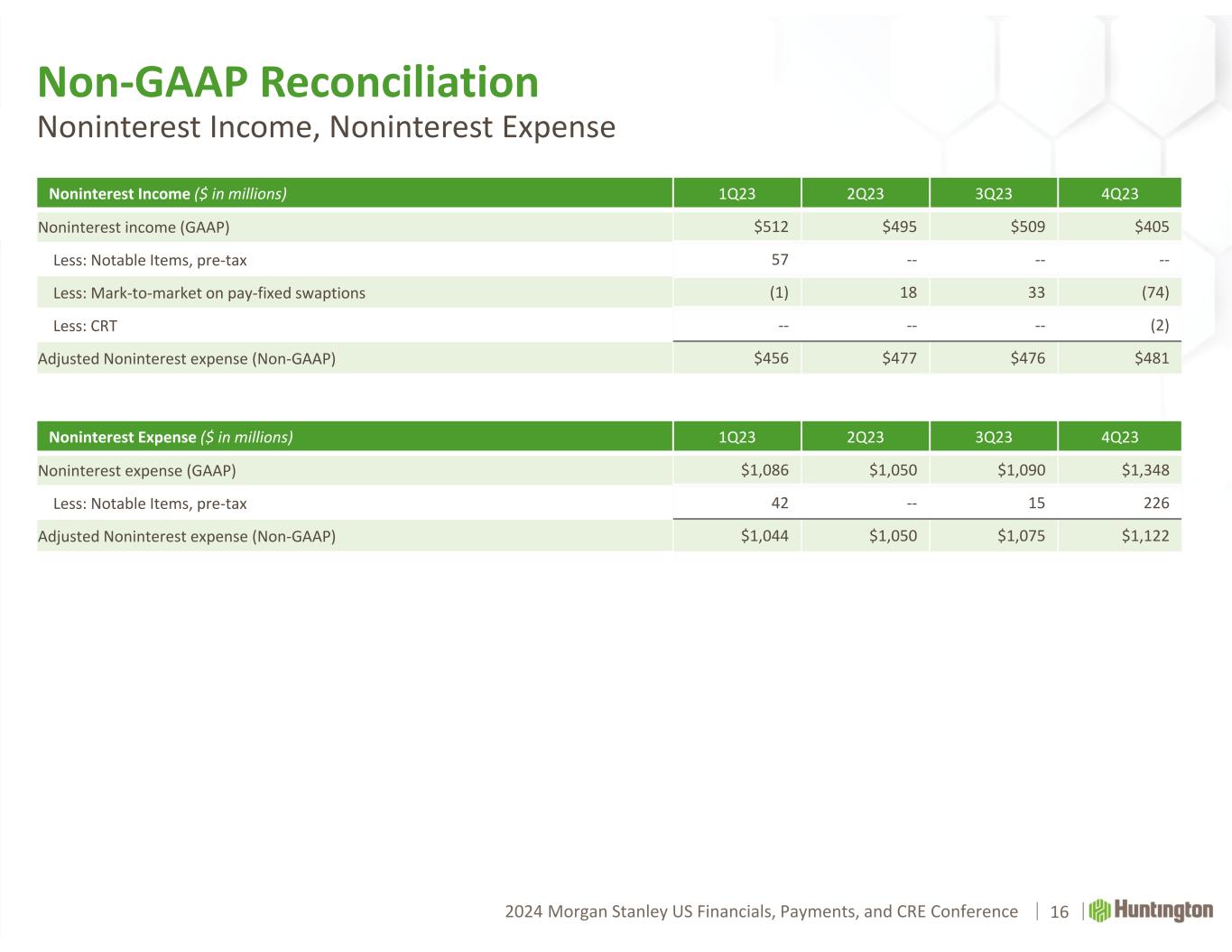 2023 Goldman Sachs US Financial Services Conference2024 Morgan Stanley US Fi an ials, Payments, and CRE 15 Non-GAAP Reconciliation Common Equity Tier 1 (CET1) CET1 – ACL Impact ($ in millions) 1Q24 Common Equity Tier 1 (A) $14,284 Add: allowance for credit losses (ACL) 2,415 Adjusted Common Equity Tier 1 (B) $16,699 Risk Weighted Assets (C) $139,616 Common Equity Tier 1 ratio (A/C) 10.2% CET1 Adjusted for ACL ratio (B/C) 12.0% ACL Impact 1.8% CET1 – AOCI Impact ($ in millions) 1Q24 Common Equity Tier 1 (A) $14,284 Add: accumulated other Comprehensive income (loss) (AOCI) (2,879) Less: cash flow hedge (436) Adjusted Common Equity Tier 1 (B) $11,841 Risk Weighted Assets (C) $139,616 Common Equity Tier 1 ratio (A/C) 10.2% Adjusted CET1 Ratio (B/C) 8.5% AOCI impact adjusted for cash flow hedges on loan portfolio 1.7%
