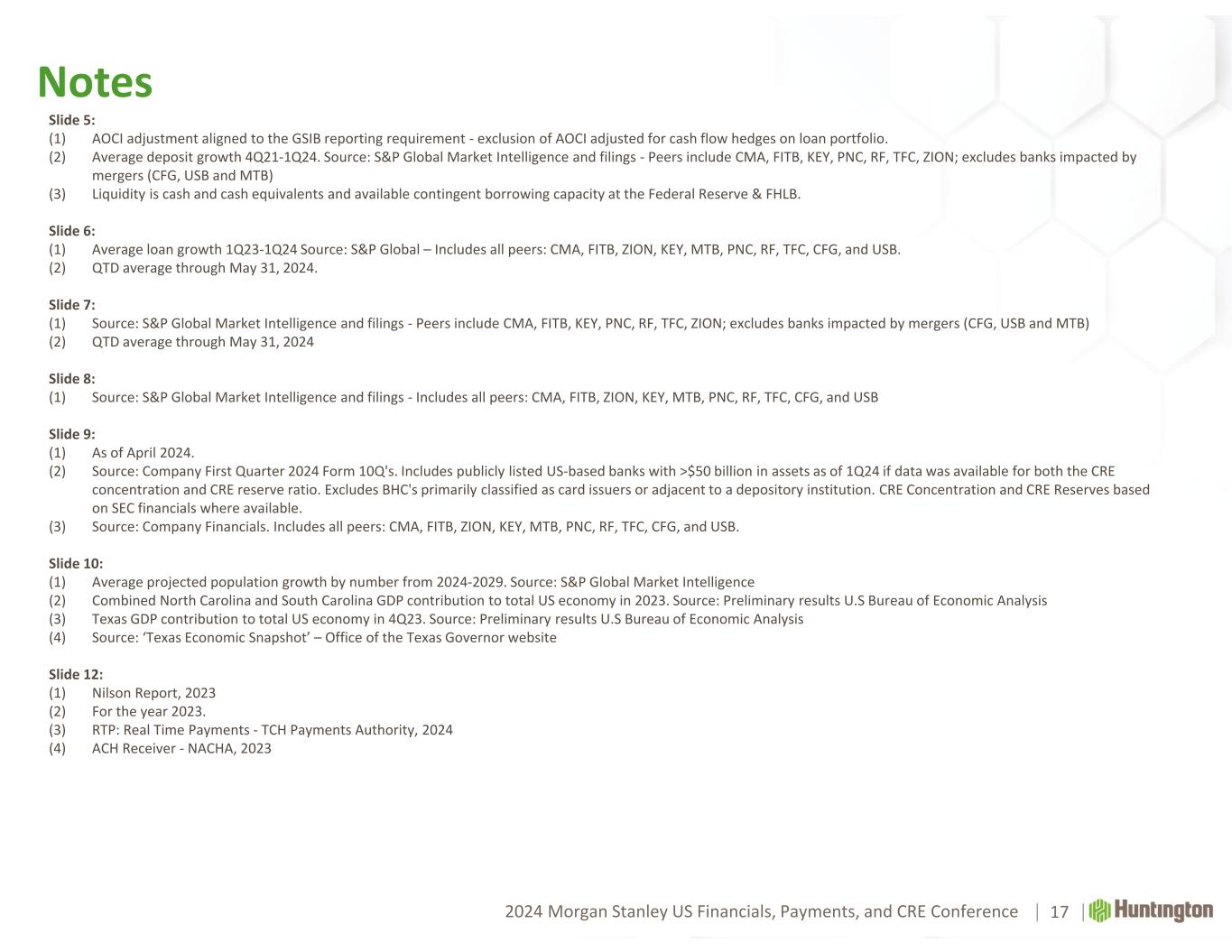 2023 Goldman Sachs US Financial Services Conference2024 Morgan Stanley US Fi an ials, Payments, and CRE 17 Notes Slide 5: (1) AOCI adjustment aligned to the GSIB reporting requirement - exclusion of AOCI adjusted for cash flow hedges on loan portfolio. (2) Average deposit growth 4Q21-1Q24. Source: S&P Global Market Intelligence and filings - Peers include CMA, FITB, KEY, PNC, RF, TFC, ZION; excludes banks impacted by mergers (CFG, USB and MTB) (3) Liquidity is cash and cash equivalents and available contingent borrowing capacity at the Federal Reserve & FHLB. Slide 6: (1) Average loan growth 1Q23-1Q24 Source: S&P Global – Includes all peers: CMA, FITB, ZION, KEY, MTB, PNC, RF, TFC, CFG, and USB. (2) QTD average through May 31, 2024. Slide 7: (1) Source: S&P Global Market Intelligence and filings - Peers include CMA, FITB, KEY, PNC, RF, TFC, ZION; excludes banks impacted by mergers (CFG, USB and MTB) (2) QTD average through May 31, 2024 Slide 8: (1) Source: S&P Global Market Intelligence and filings - Includes all peers: CMA, FITB, ZION, KEY, MTB, PNC, RF, TFC, CFG, and USB Slide 9: (1) As of April 2024. (2) Source: Company First Quarter 2024 Form 10Q's. Includes publicly listed US-based banks with >$50 billion in assets as of 1Q24 if data was available for both the CRE concentration and CRE reserve ratio. Excludes BHC's primarily classified as card issuers or adjacent to a depository institution. CRE Concentration and CRE Reserves based on SEC financials where available. (3) Source: Company Financials. Includes all peers: CMA, FITB, ZION, KEY, MTB, PNC, RF, TFC, CFG, and USB. Slide 10: (1) Average projected population growth by number from 2024-2029. Source: S&P Global Market Intelligence (2) Combined North Carolina and South Carolina GDP contribution to total US economy in 2023. Source: Preliminary results U.S Bureau of Economic Analysis (3) Texas GDP contribution to total US economy in 4Q23. Source: Preliminary results U.S Bureau of Economic Analysis (4) Source: ‘Texas Economic Snapshot’ – Office of the Texas Governor website Slide 12: (1) Nilson Report, 2023 (2) For the year 2023. (3) RTP: Real Time Payments - TCH Payments Authority, 2024 (4) ACH Receiver - NACHA, 2023