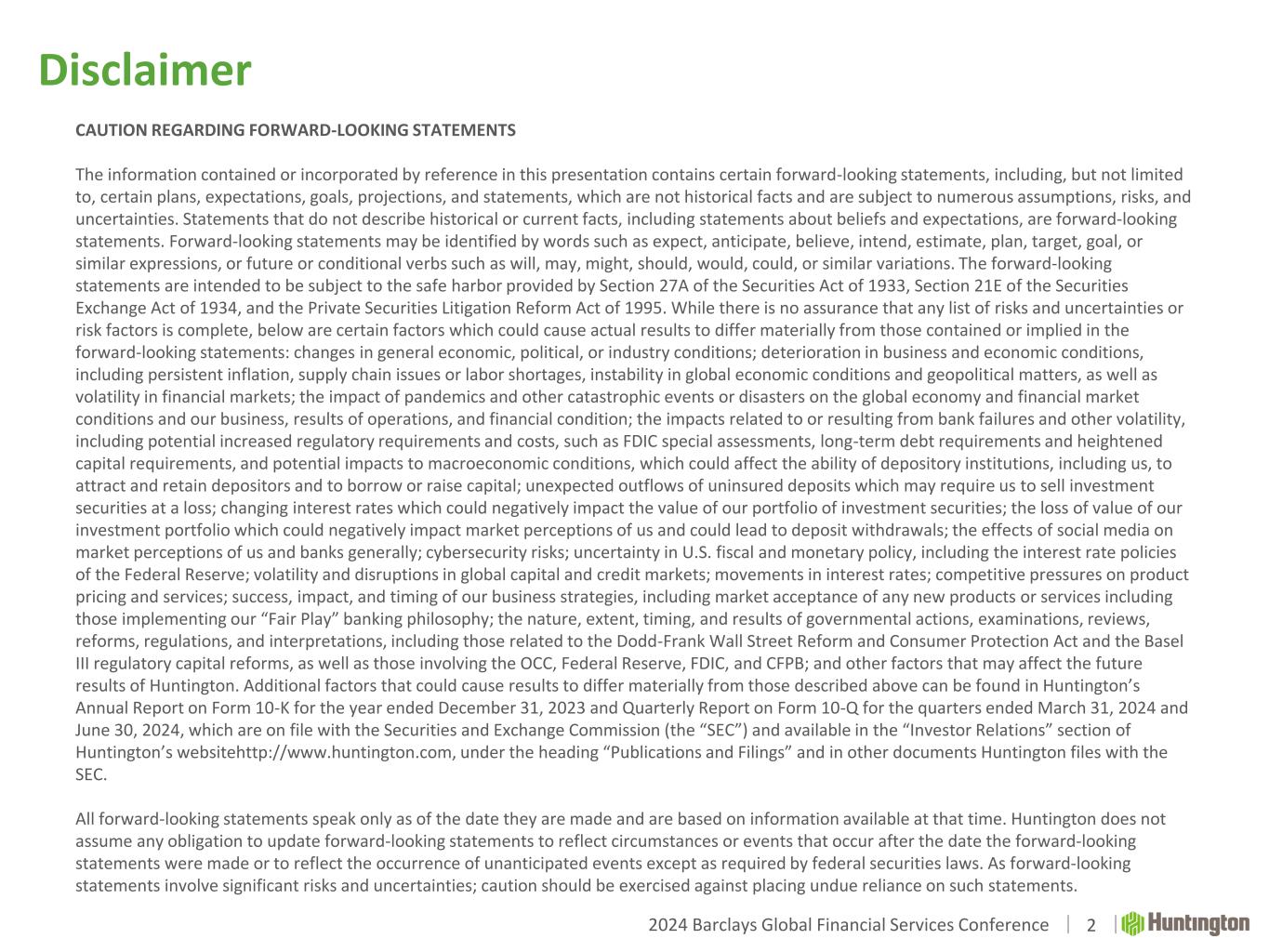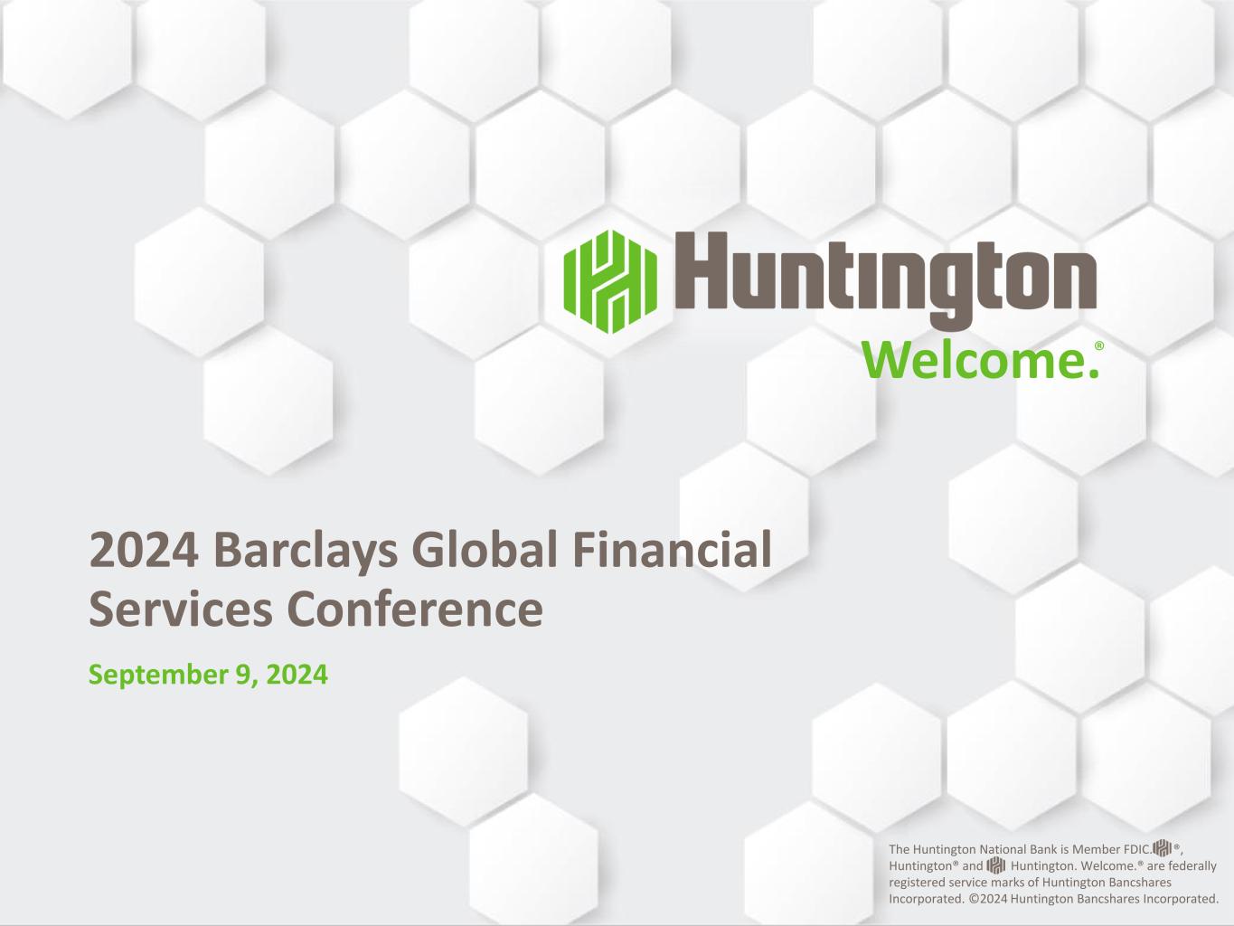 2024 Barclays Global Financial Services Conference Welcome.® 2024 Barclays Global Financial Services Conference September 9, 2024 The Huntington National Bank is Member FDIC. ®, Huntington® and Huntington. Welcome.® are federally registered service marks of Huntington Bancshares Incorporated. ©2024 Huntington Bancshares Incorporated.