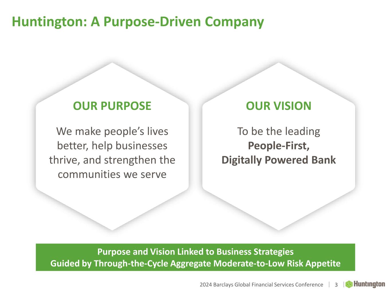 2024 Barclays Global Financial Services Conference Disclaimer 2 CAUTION REGARDING FORWARD-LOOKING STATEMENTS The information contained or incorporated by reference in this presentation contains certain forward-looking statements, including, but not limited to, certain plans, expectations, goals, projections, and statements, which are not historical facts and are subject to numerous assumptions, risks, and uncertainties. Statements that do not describe historical or current facts, including statements about beliefs and expectations, are forward-looking statements. Forward-looking statements may be identified by words such as expect, anticipate, believe, intend, estimate, plan, target, goal, or similar expressions, or future or conditional verbs such as will, may, might, should, would, could, or similar variations. The forward-looking statements are intended to be subject to the safe harbor provided by Section 27A of the Securities Act of 1933, Section 21E of the Securities Exchange Act of 1934, and the Private Securities Litigation Reform Act of 1995. While there is no assurance that any list of risks and uncertainties or risk factors is complete, below are certain factors which could cause actual results to differ materially from those contained or implied in the forward-looking statements: changes in general economic, political, or industry conditions; deterioration in business and economic conditions, including persistent inflation, supply chain issues or labor shortages, instability in global economic conditions and geopolitical matters, as well as volatility in financial markets; the impact of pandemics and other catastrophic events or disasters on the global economy and financial market conditions and our business, results of operations, and financial condition; the impacts related to or resulting from bank failures and other volatility, including potential increased regulatory requirements and costs, such as FDIC special assessments, long-term debt requirements and heightened capital requirements, and potential impacts to macroeconomic conditions, which could affect the ability of depository institutions, including us, to attract and retain depositors and to borrow or raise capital; unexpected outflows of uninsured deposits which may require us to sell investment securities at a loss; changing interest rates which could negatively impact the value of our portfolio of investment securities; the loss of value of our investment portfolio which could negatively impact market perceptions of us and could lead to deposit withdrawals; the effects of social media on market perceptions of us and banks generally; cybersecurity risks; uncertainty in U.S. fiscal and monetary policy, including the interest rate policies of the Federal Reserve; volatility and disruptions in global capital and credit markets; movements in interest rates; competitive pressures on product pricing and services; success, impact, and timing of our business strategies, including market acceptance of any new products or services including those implementing our “Fair Play” banking philosophy; the nature, extent, timing, and results of governmental actions, examinations, reviews, reforms, regulations, and interpretations, including those related to the Dodd-Frank Wall Street Reform and Consumer Protection Act and the Basel III regulatory capital reforms, as well as those involving the OCC, Federal Reserve, FDIC, and CFPB; and other factors that may affect the future results of Huntington. Additional factors that could cause results to differ materially from those described above can be found in Huntington’s Annual Report on Form 10-K for the year ended December 31, 2023 and Quarterly Report on Form 10-Q for the quarters ended March 31, 2024 and June 30, 2024, which are on file with the Securities and Exchange Commission (the “SEC”) and available in the “Investor Relations” section of Huntington’s websitehttp://www.huntington.com, under the heading “Publications and Filings” and in other documents Huntington files with the SEC. All forward-looking statements speak only as of the date they are made and are based on information available at that time. Huntington does not assume any obligation to update forward-looking statements to reflect circumstances or events that occur after the date the forward-looking statements were made or to reflect the occurrence of unanticipated events except as required by federal securities laws. As forward-looking statements involve significant risks and uncertainties; caution should be exercised against placing undue reliance on such statements.