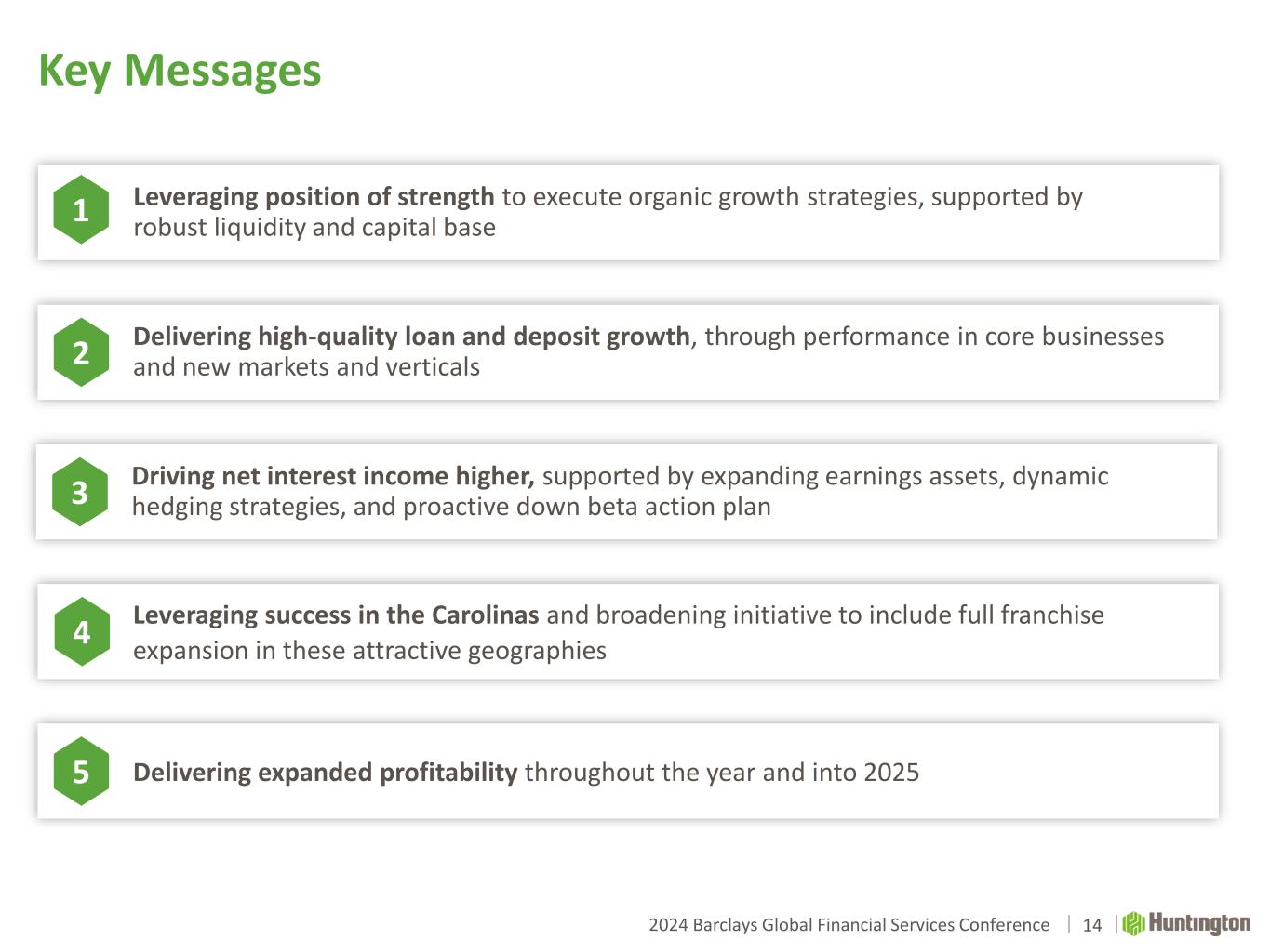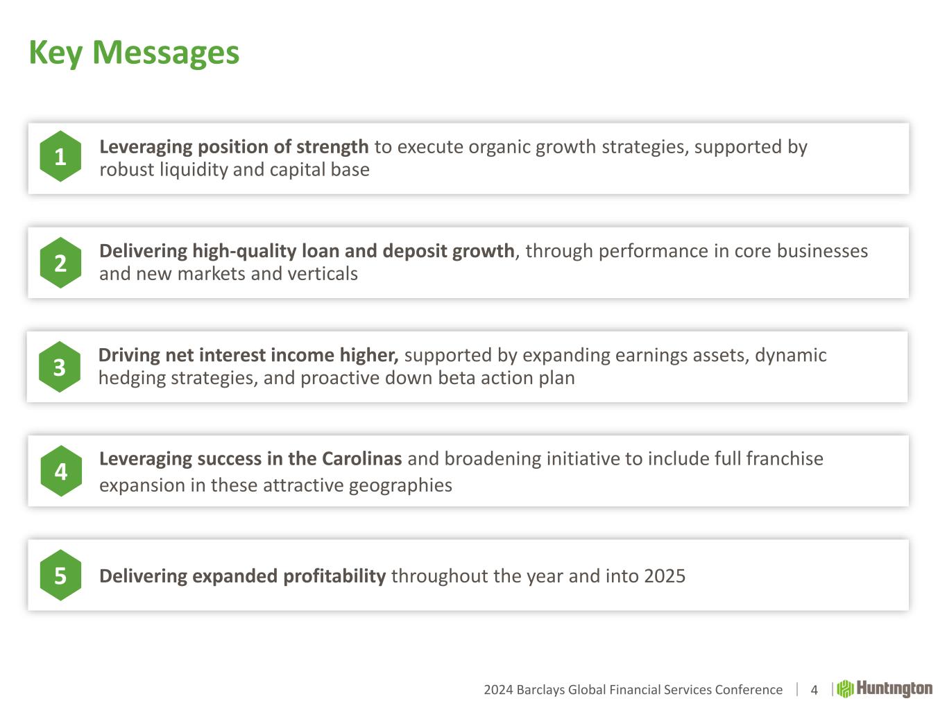 2024 Barclays Global Financial Services Conference Key Messages 4 Delivering high-quality loan and deposit growth, through performance in core businesses and new markets and verticals2 Leveraging success in the Carolinas and broadening initiative to include full franchise expansion in these attractive geographies 4 Leveraging position of strength to execute organic growth strategies, supported by robust liquidity and capital base 1 Driving net interest income higher, supported by expanding earnings assets, dynamic hedging strategies, and proactive down beta action plan3 Delivering expanded profitability throughout the year and into 20255
