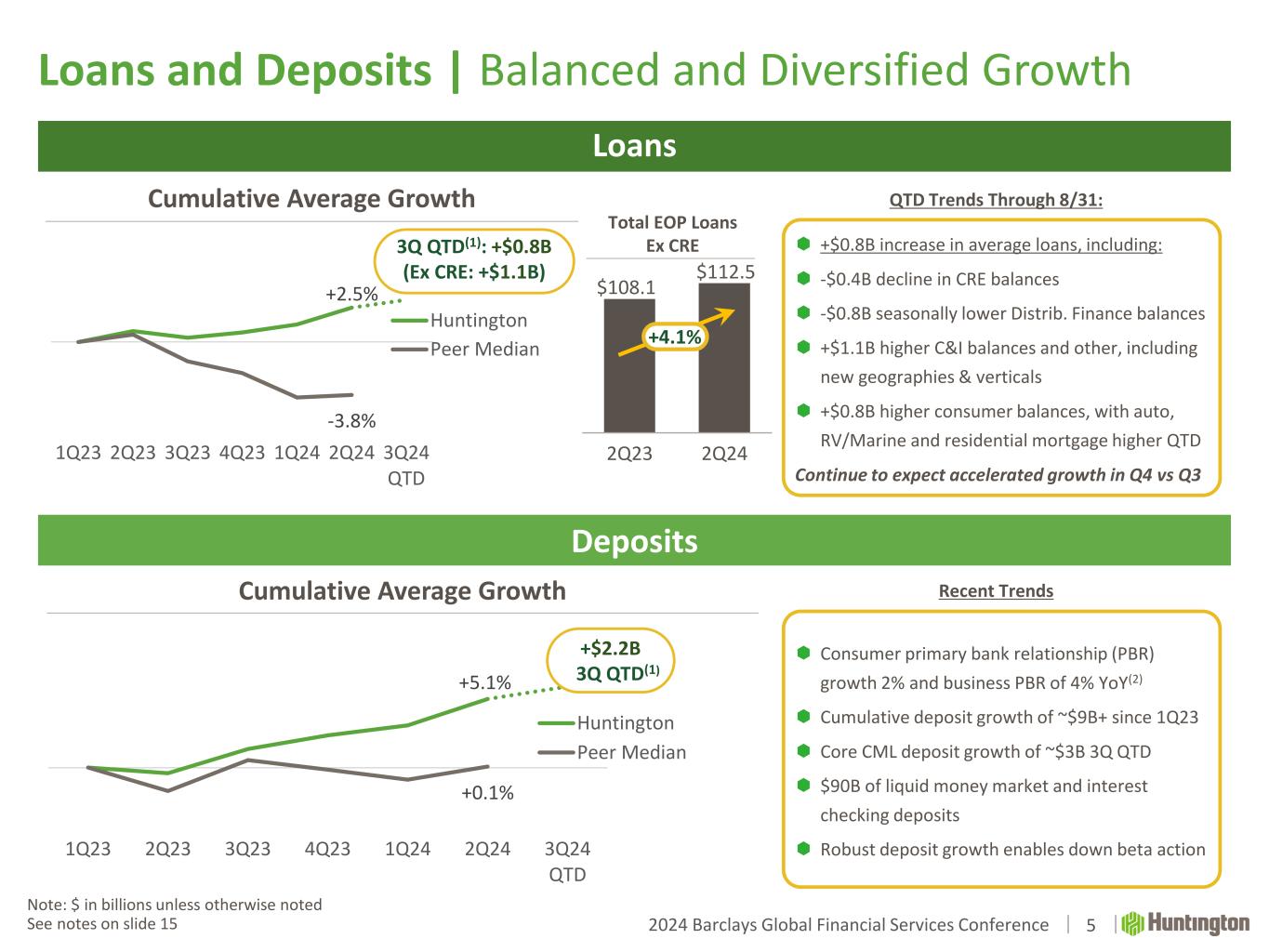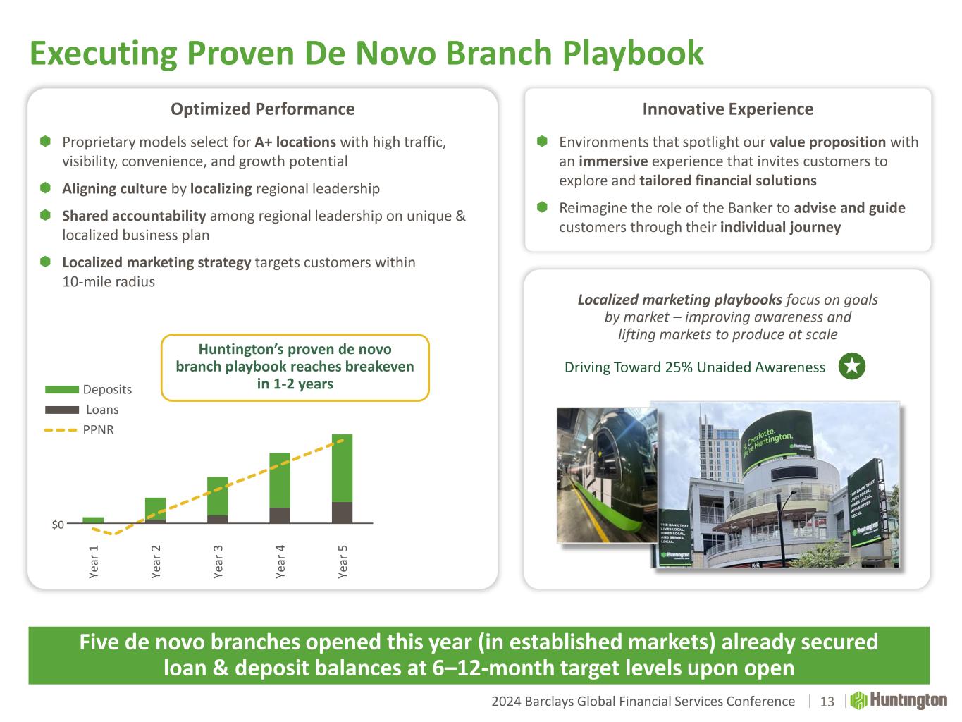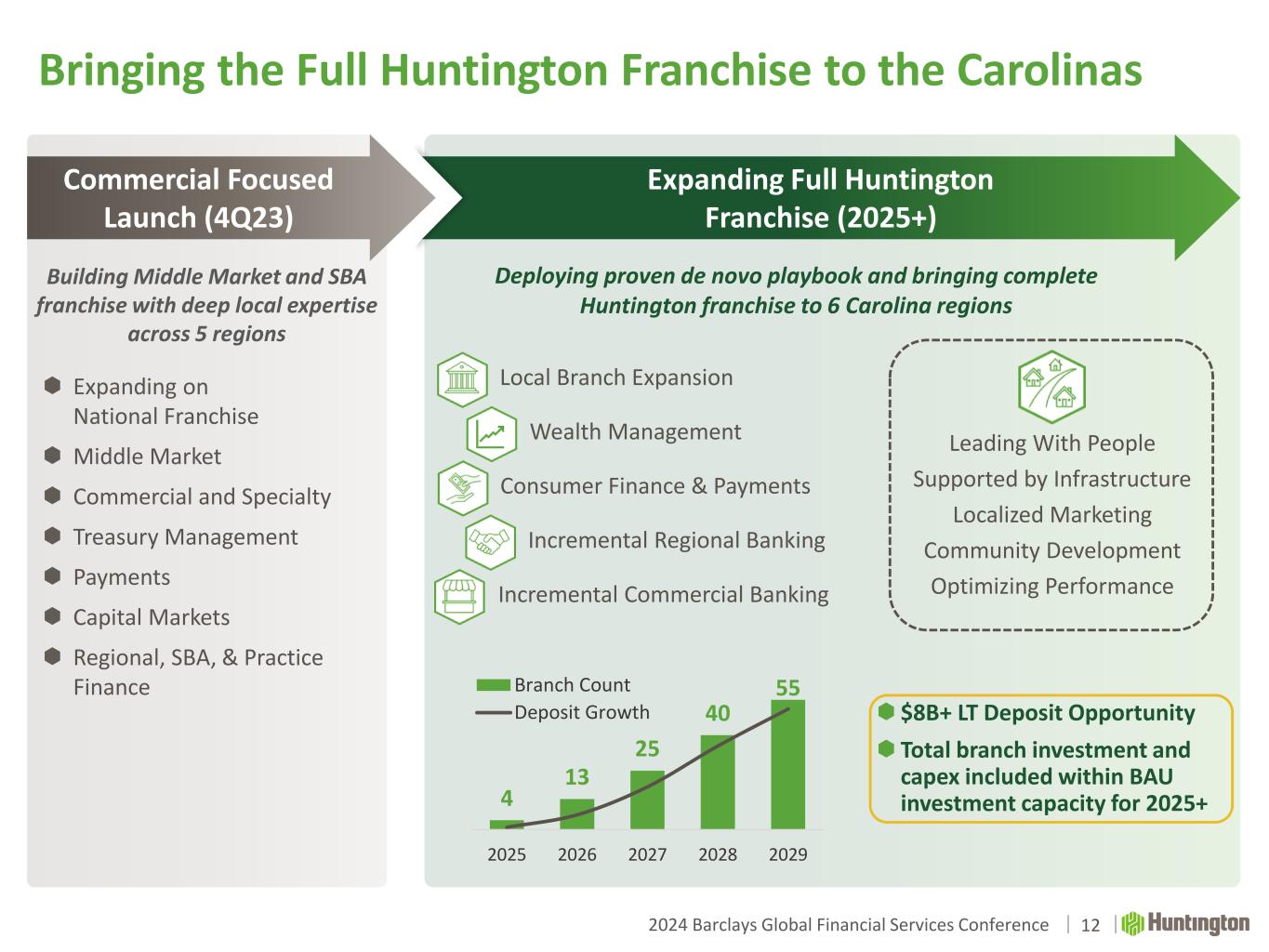 2024 Barclays Global Financial Services Conference  Expanding on National Franchise  Middle Market  Commercial and Specialty  Treasury Management  Payments  Capital Markets  Regional, SBA, & Practice Finance Commercial Focused Launch (4Q23) Expanding Full Huntington Franchise (2025+) Building Middle Market and SBA franchise with deep local expertise across 5 regions Deploying proven de novo playbook and bringing complete Huntington franchise to 6 Carolina regions Community Development 4 13 25 40 55 - 1 2 3 4 5 6 7 0 10 20 30 40 50 2025 2026 2027 2028 2029 Branch Count Deposit Growth $8B+ LT Deposit Opportunity Total branch investment and capex included within BAU investment capacity for 2025+ Wealth Management Incremental Regional Banking Incremental Commercial Banking Consumer Finance & Payments Local Branch Expansion Localized Marketing Supported by Infrastructure Leading With People Optimizing Performance Bringing the Full Huntington Franchise to the Carolinas 12