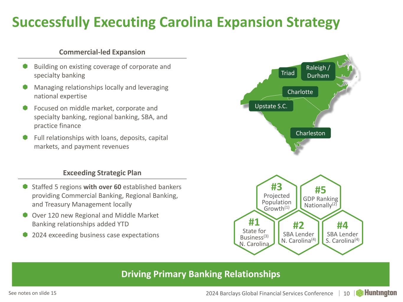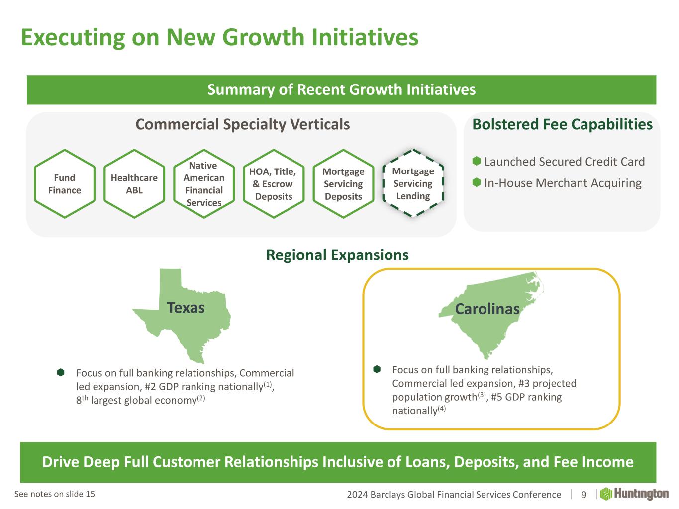 2024 Barclays Global Financial Services Conference Executing on New Growth Initiatives Commercial Specialty Verticals Regional Expansions  Focus on full banking relationships, Commercial led expansion, #2 GDP ranking nationally(1), 8th largest global economy(2) Texas 9  Focus on full banking relationships, Commercial led expansion, #3 projected population growth(3), #5 GDP ranking nationally(4) Carolinas Summary of Recent Growth Initiatives Drive Deep Full Customer Relationships Inclusive of Loans, Deposits, and Fee Income Bolstered Fee Capabilities  Launched Secured Credit Card  In-House Merchant Acquiring Mortgage Servicing Deposits Fund Finance Healthcare ABL Native American Financial Services HOA, Title, & Escrow Deposits Mortgage Servicing Lending See notes on slide 15