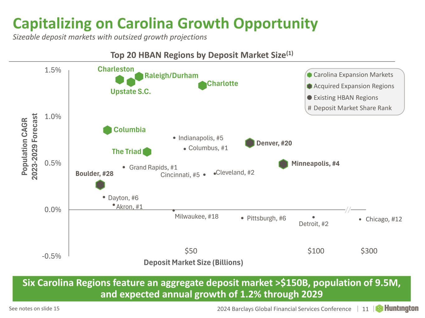2024 Barclays Global Financial Services Conference Detroit, #2 Minneapolis, #4 Denver, #20 Pittsburgh, #6 Cleveland, #2Cincinnati, #5 Charlotte Columbus, #1 Indianapolis, #5 Milwaukee, #18 The Triad Raleigh/Durham Upstate S.C. Grand Rapids, #1 Charleston Akron, #1 Columbia Dayton, #6 Boulder, #28 -0.5% 0.0% 0.5% 1.0% 1.5% - 20 40 60 80 100 120 Po pu la tio n C AG R 20 23 -2 02 9 Fo re ca st Deposit Market Size (Billions) Capitalizing on Carolina Growth Opportunity Sizeable deposit markets with outsized growth projections 11See notes on slide 15 $300$100$50 Six Carolina Regions feature an aggregate deposit market >$150B, population of 9.5M, and expected annual growth of 1.2% through 2029 Top 20 HBAN Regions by Deposit Market Size(1) Acquired Expansion Regions Carolina Expansion Markets Existing HBAN Regions Deposit Market Share Rank# Chicago, #12
