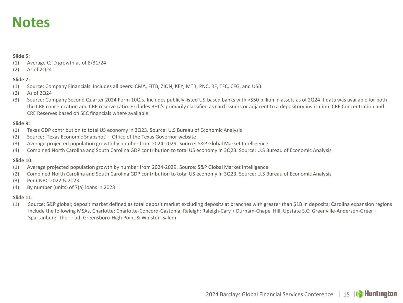2024 Barclays Global Financial Services Conference Notes 15 Slide 5: (1) Average QTD growth as of 8/31/24 (2) As of 2Q24 Slide 7: (1) Source: Company Financials. Includes all peers: CMA, FITB, ZION, KEY, MTB, PNC, RF, TFC, CFG, and USB. (2) As of 2Q24 (3) Source: Company Second Quarter 2024 Form 10Q's. Includes publicly listed US-based banks with >$50 billion in assets as of 2Q24 if data was available for both the CRE concentration and CRE reserve ratio. Excludes BHC's primarily classified as card issuers or adjacent to a depository institution. CRE Concentration and CRE Reserves based on SEC financials where available. Slide 9: (1) Texas GDP contribution to total US economy in 3Q23. Source: U.S Bureau of Economic Analysis (2) Source: ‘Texas Economic Snapshot’ – Office of the Texas Governor website (3) Average projected population growth by number from 2024-2029. Source: S&P Global Market Intelligence (4) Combined North Carolina and South Carolina GDP contribution to total US economy in 3Q23. Source: U.S Bureau of Economic Analysis Slide 10: (1) Average projected population growth by number from 2024-2029. Source: S&P Global Market Intelligence (2) Combined North Carolina and South Carolina GDP contribution to total US economy in 3Q23. Source: U.S Bureau of Economic Analysis (3) Per CNBC 2022 & 2023 (4) By number (units) of 7(a) loans in 2023 Slide 11: (1) Source: S&P global; deposit market defined as total deposit market excluding deposits at branches with greater than $1B in deposits; Carolina expansion regions include the following MSAs, Charlotte: Charlotte-Concord-Gastonia; Raleigh: Raleigh-Cary + Durham-Chapel Hill; Upstate S.C: Greenville-Anderson-Greer + Spartanburg; The Triad: Greensboro-High Point & Winston-Salem