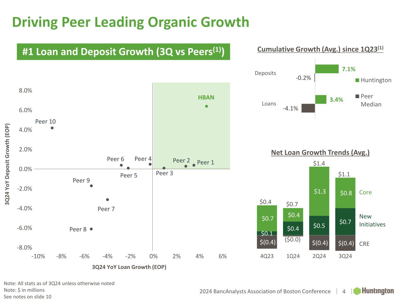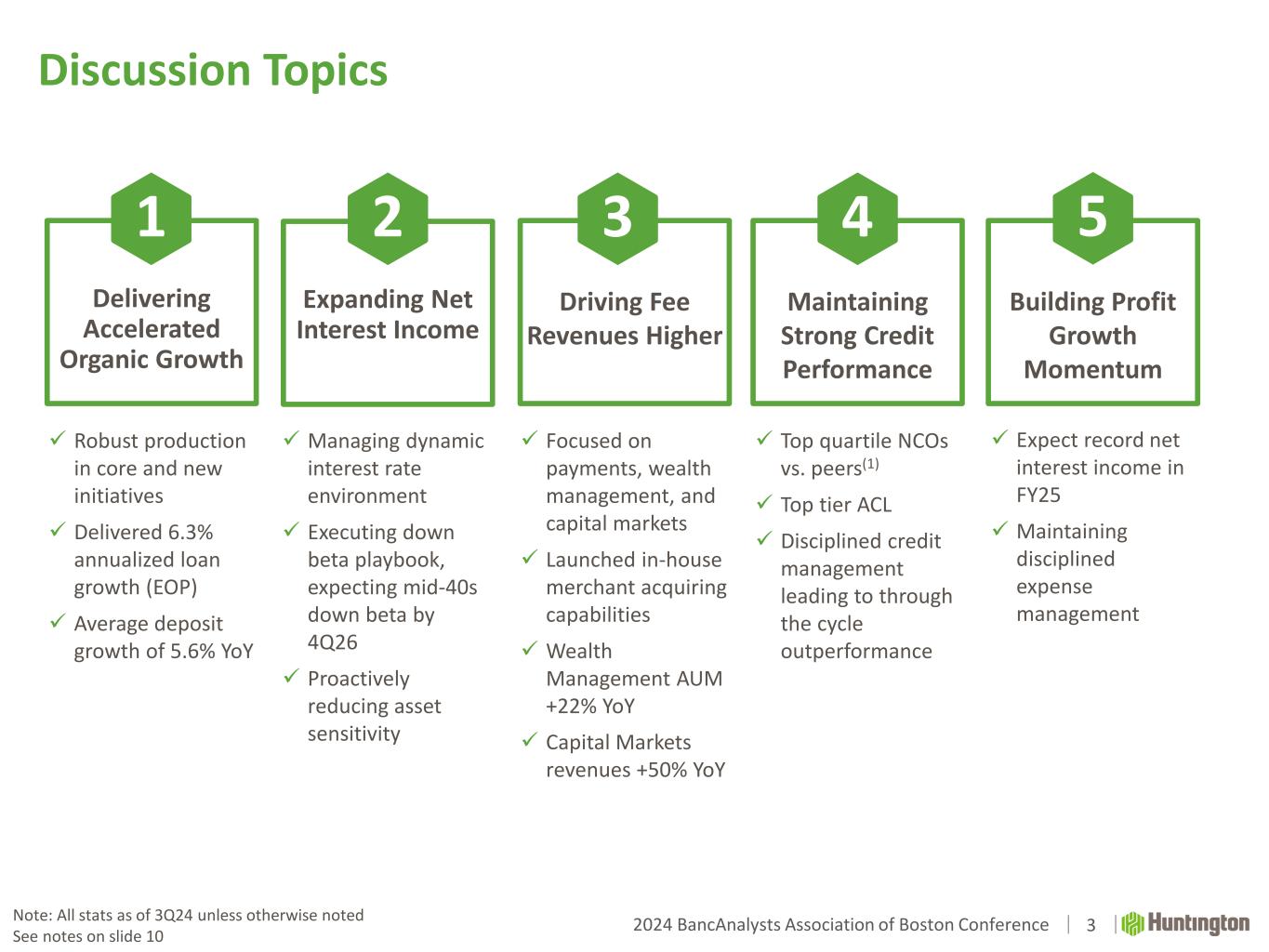 2024 BancAnalysts Association of Boston Conference Disclaimer 2 CAUTION REGARDING FORWARD-LOOKING STATEMENTS The information contained or incorporated by reference in this presentation contains certain forward-looking statements, including, but not limited to, certain plans, expectations, goals, projections, and statements, which are not historical facts and are subject to numerous assumptions, risks, and uncertainties. Statements that do not describe historical or current facts, including statements about beliefs and expectations, are forward-looking statements. Forward-looking statements may be identified by words such as expect, anticipate, believe, intend, estimate, plan, target, goal, or similar expressions, or future or conditional verbs such as will, may, might, should, would, could, or similar variations. The forward-looking statements are intended to be subject to the safe harbor provided by Section 27A of the Securities Act of 1933, Section 21E of the Securities Exchange Act of 1934, and the Private Securities Litigation Reform Act of 1995. While there is no assurance that any list of risks and uncertainties or risk factors is complete, below are certain factors which could cause actual results to differ materially from those contained or implied in the forward-looking statements: changes in general economic, political, or industry conditions; deterioration in business and economic conditions, including persistent inflation, supply chain issues or labor shortages, instability in global economic conditions and geopolitical matters, as well as volatility in financial markets; the impact of pandemics and other catastrophic events or disasters on the global economy and financial market conditions and our business, results of operations, and financial condition; the impacts related to or resulting from bank failures and other volatility, including potential increased regulatory requirements and costs, such as FDIC special assessments, long-term debt requirements and heightened capital requirements, and potential impacts to macroeconomic conditions, which could affect the ability of depository institutions, including us, to attract and retain depositors and to borrow or raise capital; unexpected outflows of uninsured deposits which may require us to sell investment securities at a loss; changing interest rates which could negatively impact the value of our portfolio of investment securities; the loss of value of our investment portfolio which could negatively impact market perceptions of us and could lead to deposit withdrawals; the effects of social media on market perceptions of us and banks generally; cybersecurity risks; uncertainty in U.S. fiscal and monetary policy, including the interest rate policies of the Federal Reserve; volatility and disruptions in global capital and credit markets; movements in interest rates; competitive pressures on product pricing and services; success, impact, and timing of our business strategies, including market acceptance of any new products or services including those implementing our “Fair Play” banking philosophy; changes in policies and standards for regulatory review of bank mergers; the nature, extent, timing, and results of governmental actions, examinations, reviews, reforms, regulations, and interpretations, including those related to the Dodd- Frank Wall Street Reform and Consumer Protection Act and the Basel III regulatory capital reforms, as well as those involving the OCC, Federal Reserve, FDIC, and CFPB; and other factors that may affect the future results of Huntington. Additional factors that could cause results to differ materially from those described above can be found in Huntington’s Annual Report on Form 10-K for the year ended December 31, 2023 and Quarterly Reports on Form 10-Q for the quarters ended March 31, 2024, June 30, 2024 and September 30, 2024, which are on file with the Securities and Exchange Commission (the “SEC”) and available in the “Investor Relations” section of Huntington’s website http://www.huntington.com, under the heading “Publications and Filings” and in other documents Huntington files with the SEC. All forward-looking statements speak only as of the date they are made and are based on information available at that time. Huntington does not assume any obligation to update forward-looking statements to reflect circumstances or events that occur after the date the forward-looking statements were made or to reflect the occurrence of unanticipated events except as required by federal securities laws. As forward-looking statements involve significant risks and uncertainties, caution should be exercised against placing undue reliance on such statements.
