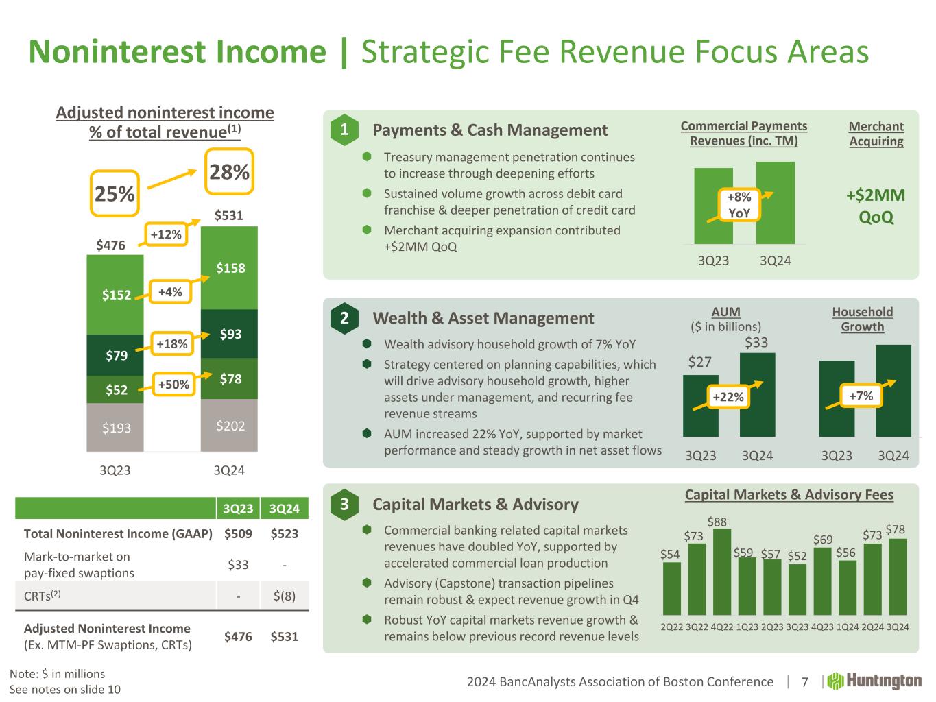 2024 BancAnalysts Association of Boston Conference 3Q23 3Q24 3Q23 3Q24 $193 $202 $52 $78 $79 $93 $152 $158 3Q23 3Q24 Noninterest Income | Strategic Fee Revenue Focus Areas Capital Markets & Advisory Payments & Cash Management Wealth & Asset Management 1 3 +18% +4% +50% 2 $27 $33 3Q23 3Q24 $54 $73 $88 $59 $57 $52 $69 $56 $73 $78 2Q22 3Q22 4Q22 1Q23 2Q23 3Q23 4Q23 1Q24 2Q24 3Q24  Commercial banking related capital markets revenues have doubled YoY, supported by accelerated commercial loan production  Advisory (Capstone) transaction pipelines remain robust & expect revenue growth in Q4  Robust YoY capital markets revenue growth & remains below previous record revenue levels  Wealth advisory household growth of 7% YoY  Strategy centered on planning capabilities, which will drive advisory household growth, higher assets under management, and recurring fee revenue streams  AUM increased 22% YoY, supported by market performance and steady growth in net asset flows  Treasury management penetration continues to increase through deepening efforts  Sustained volume growth across debit card franchise & deeper penetration of credit card  Merchant acquiring expansion contributed +$2MM QoQ$476 $531 +12% AUM ($ in billions) Capital Markets & Advisory Fees Household Growth +22% +7% +8% YoY 28% 25% Commercial Payments Revenues (inc. TM) Merchant Acquiring +$2MM QoQ 7 3Q23 3Q24 Total Noninterest Income (GAAP) $509 $523 Mark-to-market on pay-fixed swaptions $33 - CRTs(2) - $(8) Adjusted Noninterest Income (Ex. MTM-PF Swaptions, CRTs) $476 $531 Adjusted noninterest income % of total revenue(1) Note: $ in millions See notes on slide 10