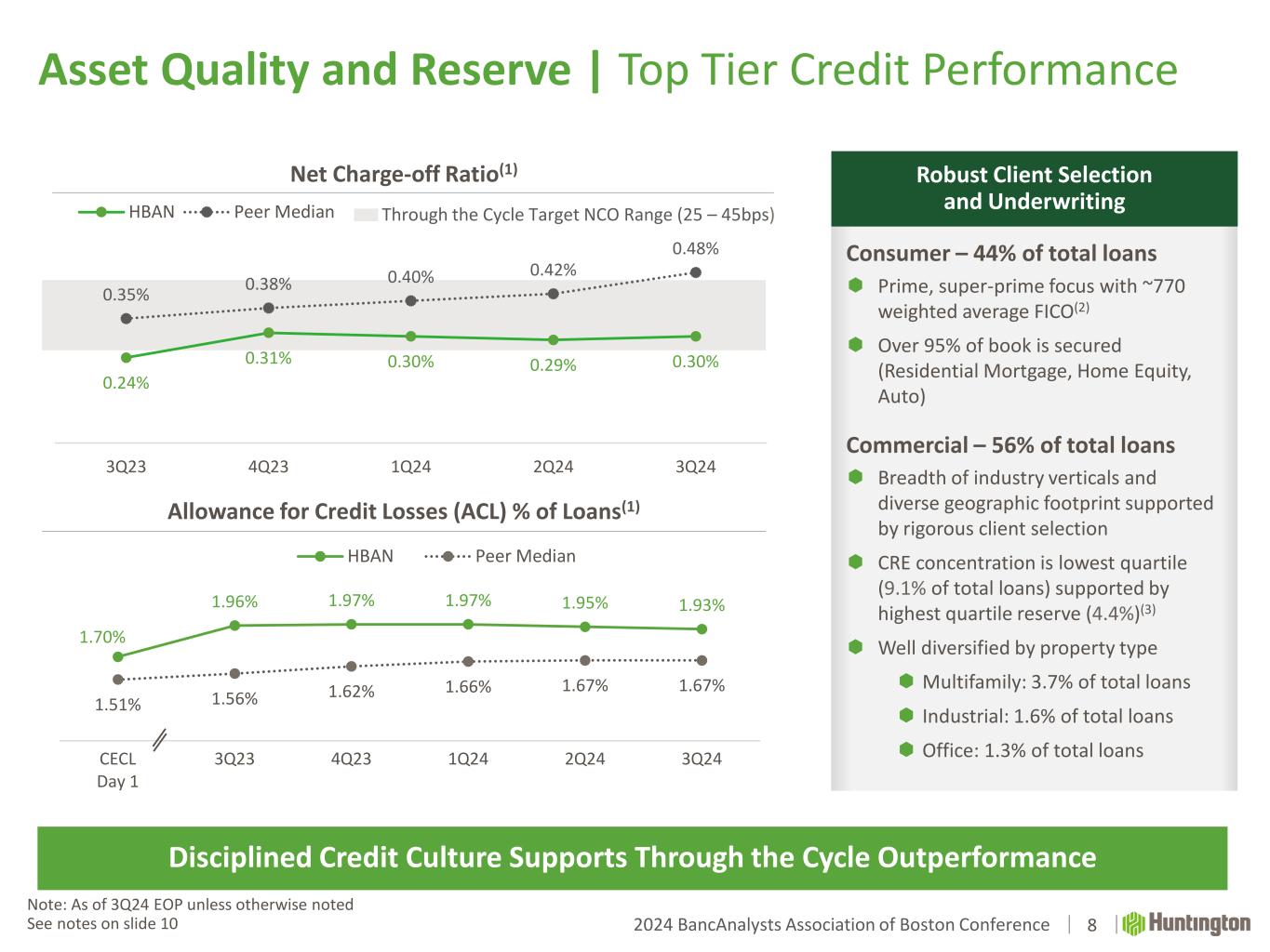 2024 BancAnalysts Association of Boston Conference 1.70% 1.96% 1.97% 1.97% 1.95% 1.93% 1.51% 1.56% 1.62% 1.66% 1.67% 1.67% CECL Day 1 3Q23 4Q23 1Q24 2Q24 3Q24 HBAN Peer Median Through the Cycle Target NCO Range (25 – 45bps) 8 Asset Quality and Reserve | Top Tier Credit Performance Net Charge-off Ratio(1) Allowance for Credit Losses (ACL) % of Loans(1) Robust Client Selection and Underwriting Consumer – 44% of total loans  Prime, super-prime focus with ~770 weighted average FICO(2)  Over 95% of book is secured (Residential Mortgage, Home Equity, Auto) Commercial – 56% of total loans  Breadth of industry verticals and diverse geographic footprint supported by rigorous client selection  CRE concentration is lowest quartile (9.1% of total loans) supported by highest quartile reserve (4.4%)(3)  Well diversified by property type  Multifamily: 3.7% of total loans  Industrial: 1.6% of total loans  Office: 1.3% of total loans Disciplined Credit Culture Supports Through the Cycle Outperformance Note: As of 3Q24 EOP unless otherwise noted See notes on slide 10 0.24% 0.31% 0.30% 0.29% 0.30% 0.35% 0.38% 0.40% 0.42% 0.48% 3Q23 4Q23 1Q24 2Q24 3Q24 HBAN Peer Median