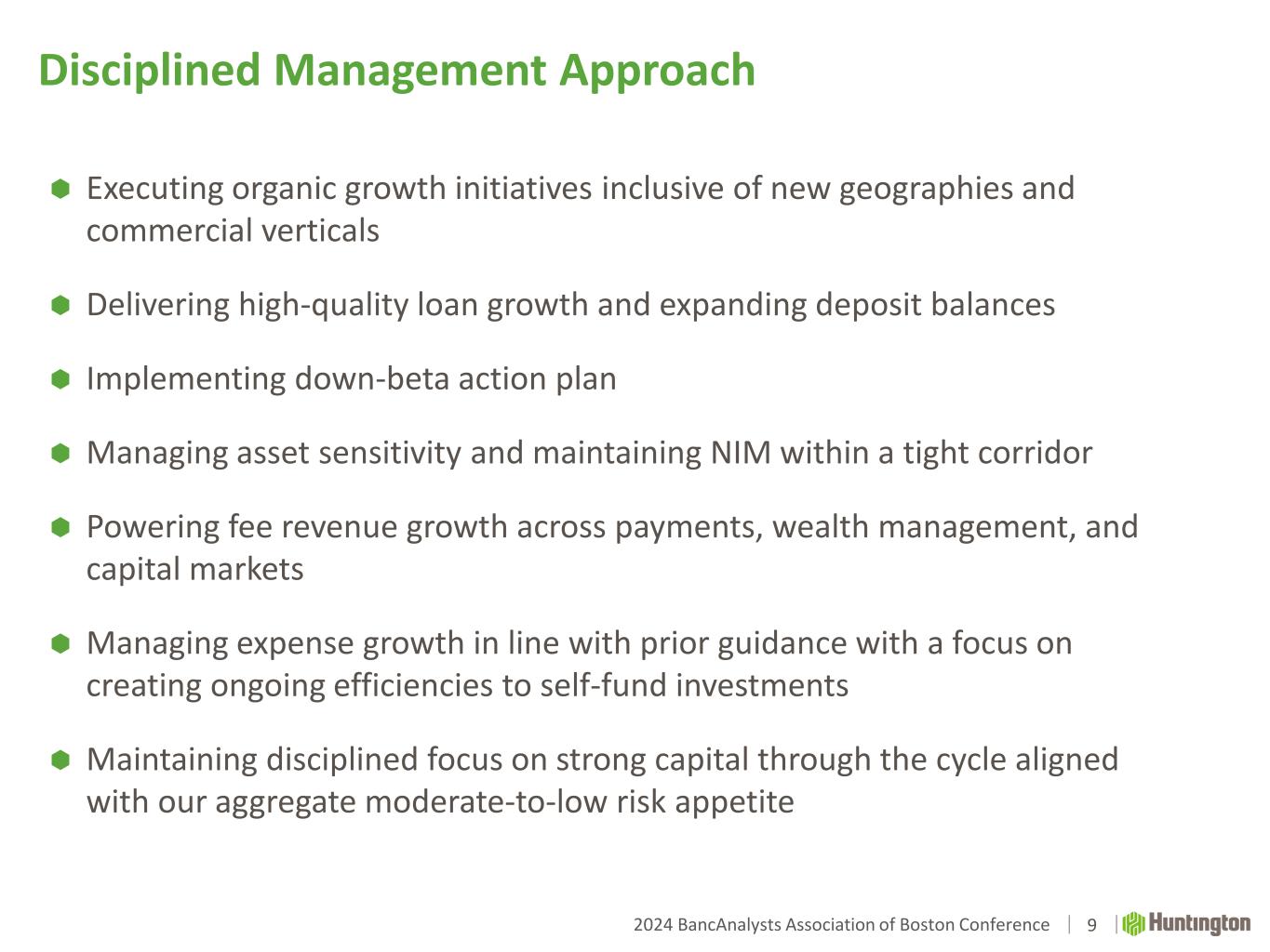 2024 BancAnalysts Association of Boston Conference 9 Disciplined Management Approach  Executing organic growth initiatives inclusive of new geographies and commercial verticals  Delivering high-quality loan growth and expanding deposit balances  Implementing down-beta action plan  Managing asset sensitivity and maintaining NIM within a tight corridor  Powering fee revenue growth across payments, wealth management, and capital markets  Managing expense growth in line with prior guidance with a focus on creating ongoing efficiencies to self-fund investments  Maintaining disciplined focus on strong capital through the cycle aligned with our aggregate moderate-to-low risk appetite
