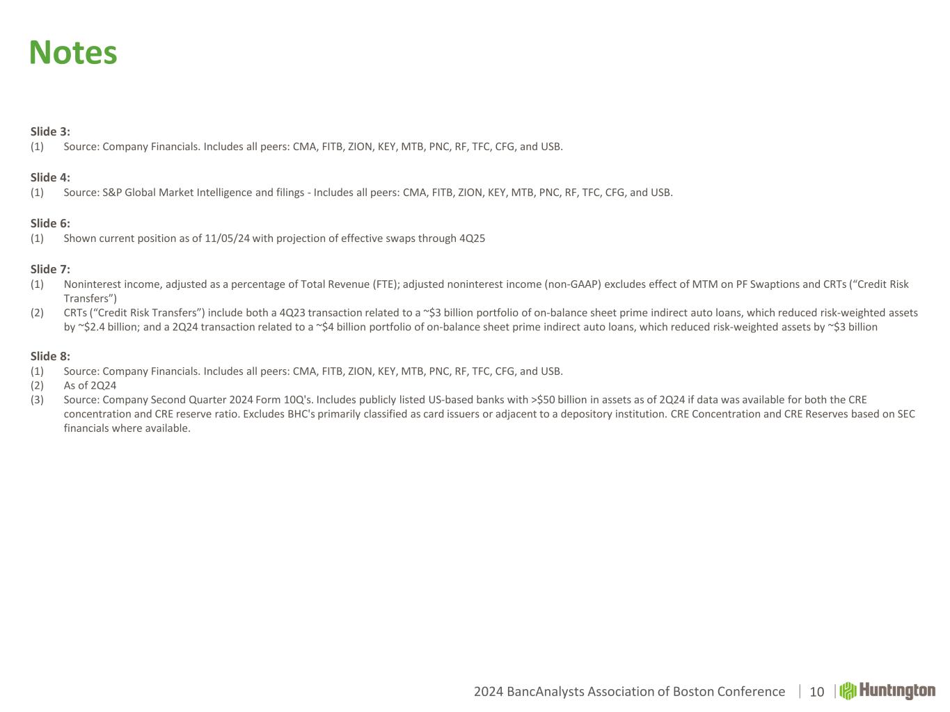 2024 BancAnalysts Association of Boston Conference Notes 10 Slide 3: (1) Source: Company Financials. Includes all peers: CMA, FITB, ZION, KEY, MTB, PNC, RF, TFC, CFG, and USB. Slide 4: (1) Source: S&P Global Market Intelligence and filings - Includes all peers: CMA, FITB, ZION, KEY, MTB, PNC, RF, TFC, CFG, and USB. Slide 6: (1) Shown current position as of 11/05/24 with projection of effective swaps through 4Q25 Slide 7: (1) Noninterest income, adjusted as a percentage of Total Revenue (FTE); adjusted noninterest income (non-GAAP) excludes effect of MTM on PF Swaptions and CRTs (“Credit Risk Transfers”) (2) CRTs (“Credit Risk Transfers”) include both a 4Q23 transaction related to a ~$3 billion portfolio of on-balance sheet prime indirect auto loans, which reduced risk-weighted assets by ~$2.4 billion; and a 2Q24 transaction related to a ~$4 billion portfolio of on-balance sheet prime indirect auto loans, which reduced risk-weighted assets by ~$3 billion Slide 8: (1) Source: Company Financials. Includes all peers: CMA, FITB, ZION, KEY, MTB, PNC, RF, TFC, CFG, and USB. (2) As of 2Q24 (3) Source: Company Second Quarter 2024 Form 10Q's. Includes publicly listed US-based banks with >$50 billion in assets as of 2Q24 if data was available for both the CRE concentration and CRE reserve ratio. Excludes BHC's primarily classified as card issuers or adjacent to a depository institution. CRE Concentration and CRE Reserves based on SEC financials where available.