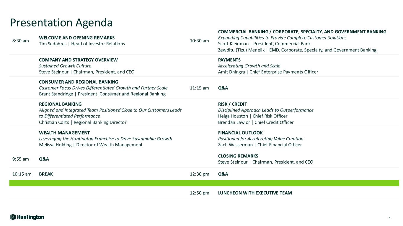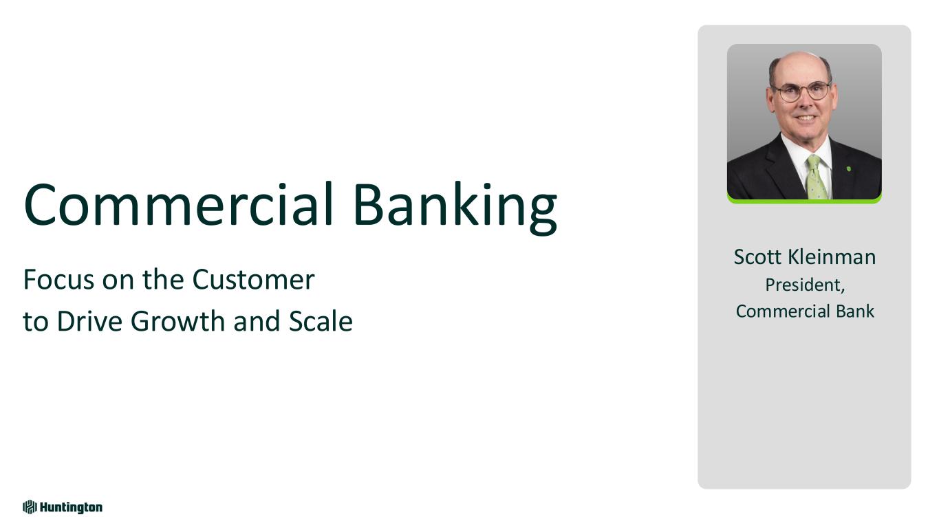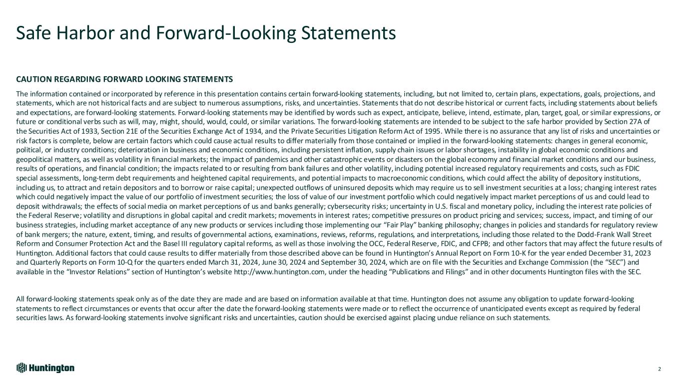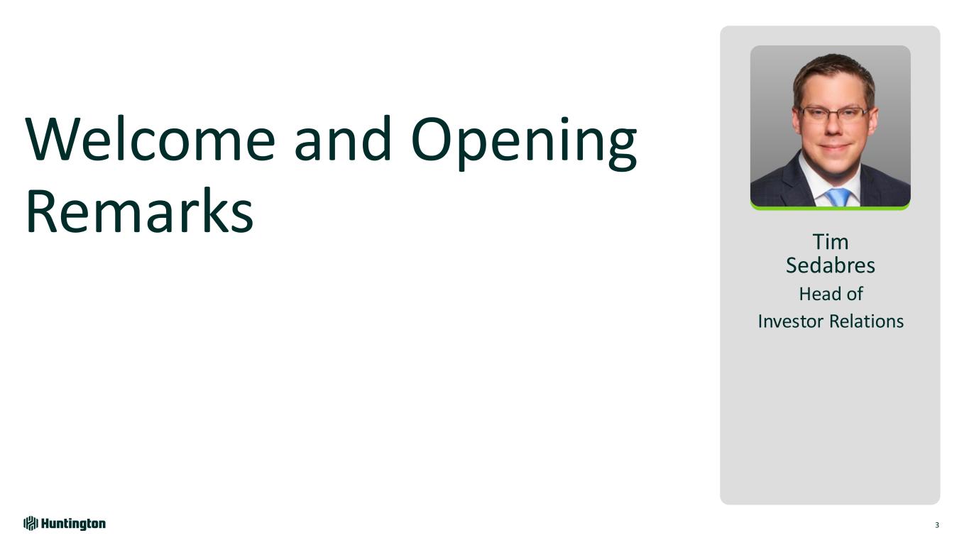Safe Harbor and Forward-Looking Statements 2 CAUTION REGARDING FORWARD LOOKING STATEMENTS The information contained or incorporated by reference in this presentation contains certain forward-looking statements, including, but not limited to, certain plans, expectations, goals, projections, and statements, which are not historical facts and are subject to numerous assumptions, risks, and uncertainties. Statements that do not describe historical or current facts, including statements about beliefs and expectations, are forward-looking statements. Forward-looking statements may be identified by words such as expect, anticipate, believe, intend, estimate, plan, target, goal, or similar expressions, or future or conditional verbs such as will, may, might, should, would, could, or similar variations. The forward-looking statements are intended to be subject to the safe harbor provided by Section 27A of the Securities Act of 1933, Section 21E of the Securities Exchange Act of 1934, and the Private Securities Litigation Reform Act of 1995. While there is no assurance that any list of risks and uncertainties or risk factors is complete, below are certain factors which could cause actual results to differ materially from those contained or implied in the forward-looking statements: changes in general economic, political, or industry conditions; deterioration in business and economic conditions, including persistent inflation, supply chain issues or labor shortages, instability in global economic conditions and geopolitical matters, as well as volatility in financial markets; the impact of pandemics and other catastrophic events or disasters on the global economy and financial market conditions and our business, results of operations, and financial condition; the impacts related to or resulting from bank failures and other volatility, including potential increased regulatory requirements and costs, such as FDIC special assessments, long-term debt requirements and heightened capital requirements, and potential impacts to macroeconomic conditions, which could affect the ability of depository institutions, including us, to attract and retain depositors and to borrow or raise capital; unexpected outflows of uninsured deposits which may require us to sell investment securities at a loss; changing interest rates which could negatively impact the value of our portfolio of investment securities; the loss of value of our investment portfolio which could negatively impact market perceptions of us and could lead to deposit withdrawals; the effects of social media on market perceptions of us and banks generally; cybersecurity risks; uncertainty in U.S. fiscal and monetary policy, including the interest rate policies of the Federal Reserve; volatility and disruptions in global capital and credit markets; movements in interest rates; competitive pressures on product pricing and services; success, impact, and timing of our business strategies, including market acceptance of any new products or services including those implementing our “Fair Play” banking philosophy; changes in policies and standards for regulatory review of bank mergers; the nature, extent, timing, and results of governmental actions, examinations, reviews, reforms, regulations, and interpretations, including those related to the Dodd-Frank Wall Street Reform and Consumer Protection Act and the Basel III regulatory capital reforms, as well as those involving the OCC, Federal Reserve, FDIC, and CFPB; and other factors that may affect the future results of Huntington. Additional factors that could cause results to differ materially from those described above can be found in Huntington’s Annual Report on Form 10-K for the year ended December 31, 2023 and Quarterly Reports on Form 10-Q for the quarters ended March 31, 2024, June 30, 2024 and September 30, 2024, which are on file with the Securities and Exchange Commission (the “SEC”) and available in the “Investor Relations” section of Huntington’s website http://www.huntington.com, under the heading “Publications and Filings” and in other documents Huntington files with the SEC. All forward-looking statements speak only as of the date they are made and are based on information available at that time. Huntington does not assume any obligation to update forward-looking statements to reflect circumstances or events that occur after the date the forward-looking statements were made or to reflect the occurrence of unanticipated events except as required by federal securities laws. As forward-looking statements involve significant risks and uncertainties, caution should be exercised against placing undue reliance on such statements.