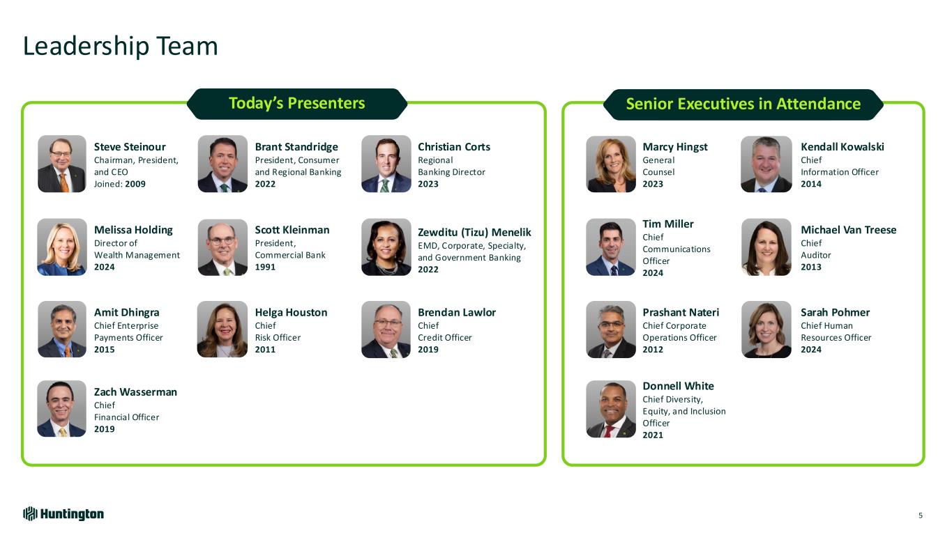 8:30 am WELCOME AND OPENING REMARKS Tim Sedabres | Head of Investor Relations 10:30 am COMMERCIAL BANKING / CORPORATE, SPECIALTY, AND GOVERNMENT BANKING Expanding Capabilities to Provide Complete Customer Solutions Scott Kleinman | President, Commercial Bank Zewditu (Tizu) Menelik | EMD, Corporate, Specialty, and Government Banking COMPANY AND STRATEGY OVERVIEW Sustained Growth Culture Steve Steinour | Chairman, President, and CEO PAYMENTS Accelerating Growth and Scale Amit Dhingra | Chief Enterprise Payments Officer CONSUMER AND REGIONAL BANKING Customer Focus Drives Differentiated Growth and Further Scale Brant Standridge | President, Consumer and Regional Banking 11:15 am Q&A REGIONAL BANKING Aligned and Integrated Team Positioned Close to Our Customers Leads to Differentiated Performance Christian Corts | Regional Banking Director RISK / CREDIT Disciplined Approach Leads to Outperformance Helga Houston | Chief Risk Officer Brendan Lawlor | Chief Credit Officer WEALTH MANAGEMENT Leveraging the Huntington Franchise to Drive Sustainable Growth Melissa Holding | Director of Wealth Management FINANCIAL OUTLOOK Positioned for Accelerating Value Creation Zach Wasserman | Chief Financial Officer 9:55 am Q&A CLOSING REMARKS Steve Steinour | Chairman, President, and CEO 10:15 am BREAK 12:30 pm Q&A 12:50 pm LUNCHEON WITH EXECUTIVE TEAM Presentation Agenda 4