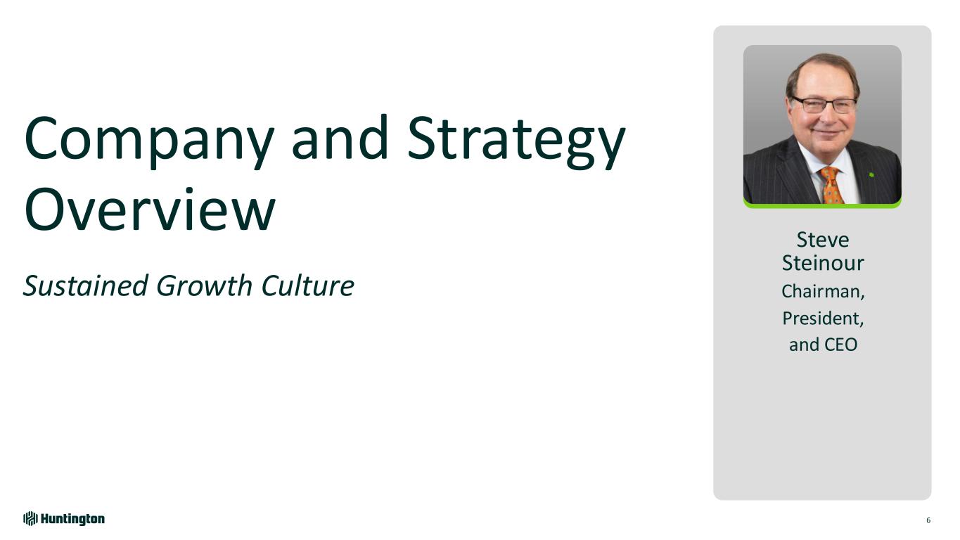 Leadership Team 5 Steve Steinour Chairman, President, and CEO Joined: 2009 Brant Standridge President, Consumer and Regional Banking 2022 Scott Kleinman President, Commercial Bank 1991 Amit Dhingra Chief Enterprise Payments Officer 2015 Helga Houston Chief Risk Officer 2011 Zewditu (Tizu) Menelik EMD, Corporate, Specialty, and Government Banking 2022 Melissa Holding Director of Wealth Management 2024 Prashant Nateri Chief Corporate Operations Officer 2012 Tim Miller Chief Communications Officer 2024 Michael Van Treese Chief Auditor 2013 Marcy Hingst General Counsel 2023 Kendall Kowalski Chief Information Officer 2014 Zach Wasserman Chief Financial Officer 2019 Christian Corts Regional Banking Director 2023 Brendan Lawlor Chief Credit Officer 2019 Today’s Presenters Senior Executives in Attendance Sarah Pohmer Chief Human Resources Officer 2024 Donnell White Chief Diversity, Equity, and Inclusion Officer 2021