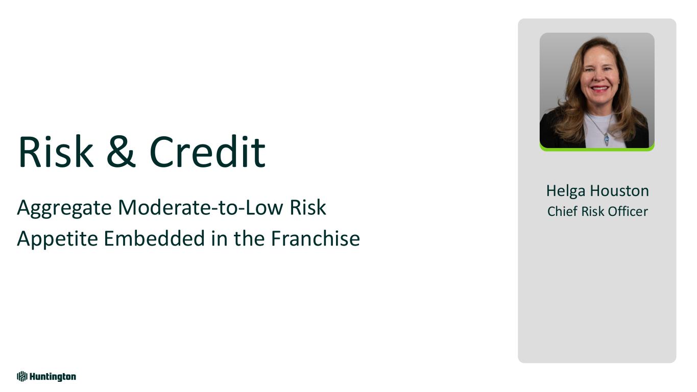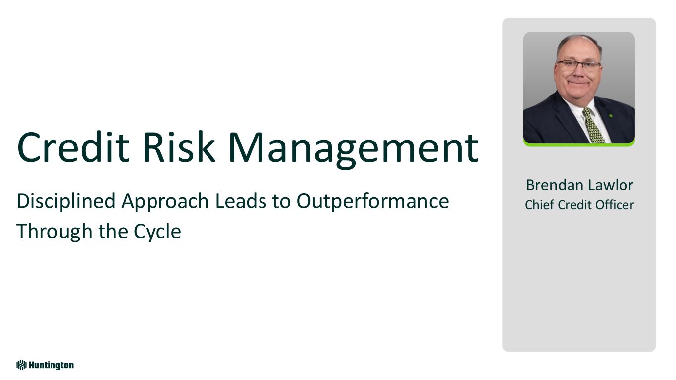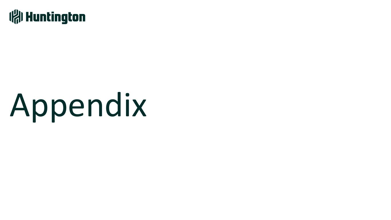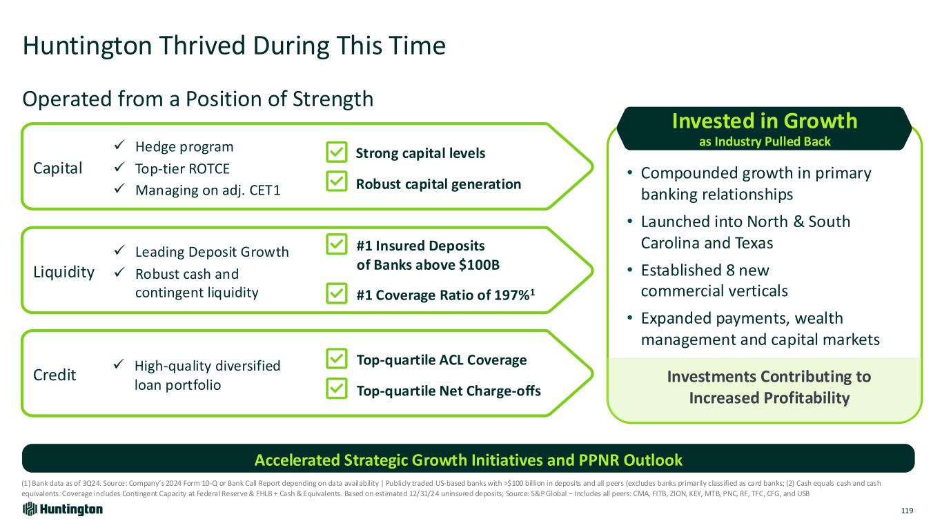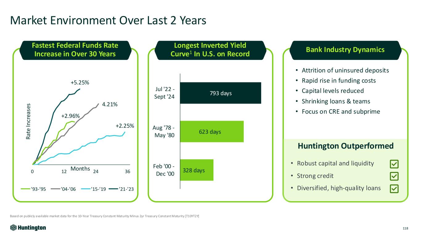 Longest Inverted Yield Curve1 In U.S. on Record 793 days 623 days 328 days Jul '22 - Sept '24 Aug '78 - May '80 Feb '00 - Dec '00 Fastest Federal Funds Rate Increase in Over 30 Years Bank Industry Dynamics Market Environment Over Last 2 Years 118 +5.25% +2.25% 4.21% +2.96% 0 12 24 36 R at e In cr ea se s Months Huntington Outperformed • Robust capital and liquidity • Strong credit • Diversified, high-quality loans • Attrition of uninsured deposits • Rapid rise in funding costs • Capital levels reduced • Shrinking loans & teams • Focus on CRE and subprime ’21-’23’15-’19’04-’06’93-’95 Based on publicly available market data for the 10-Year Treasury Constant Maturity Minus 2yr Treasury Constant Maturity [T10YT2Y]