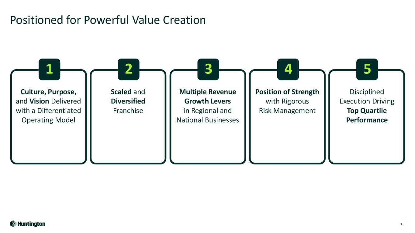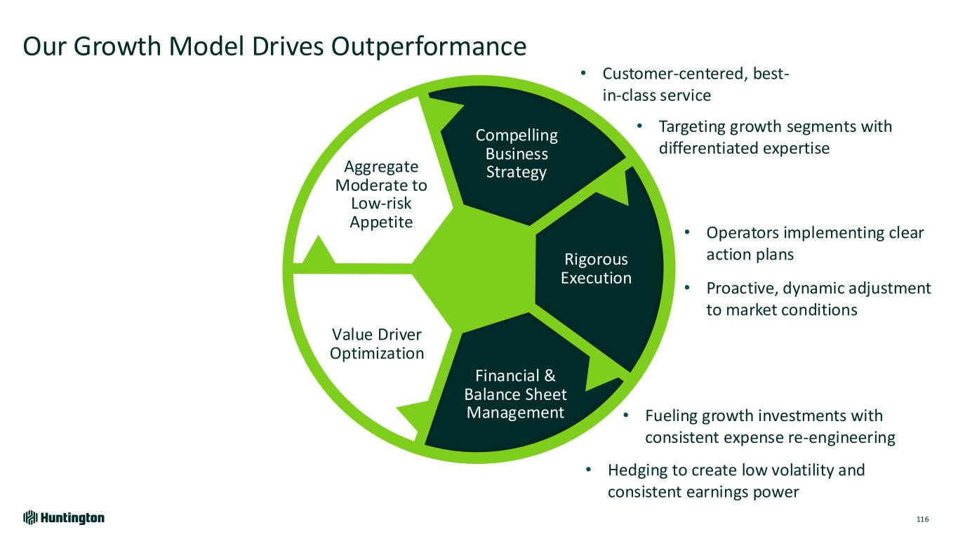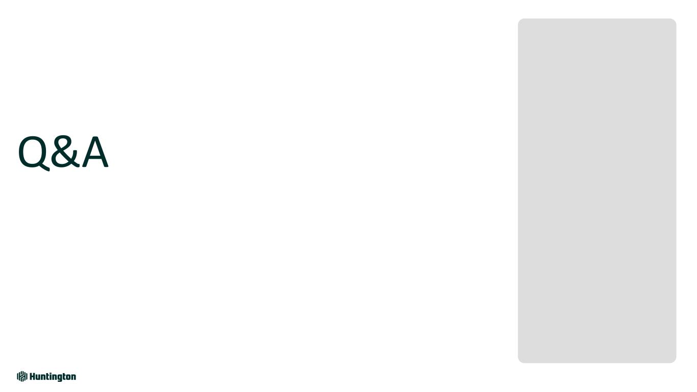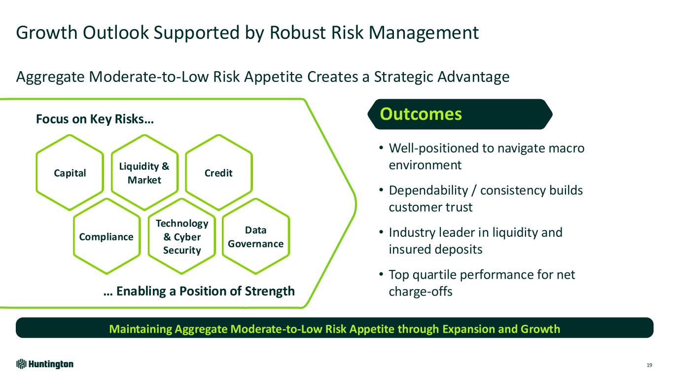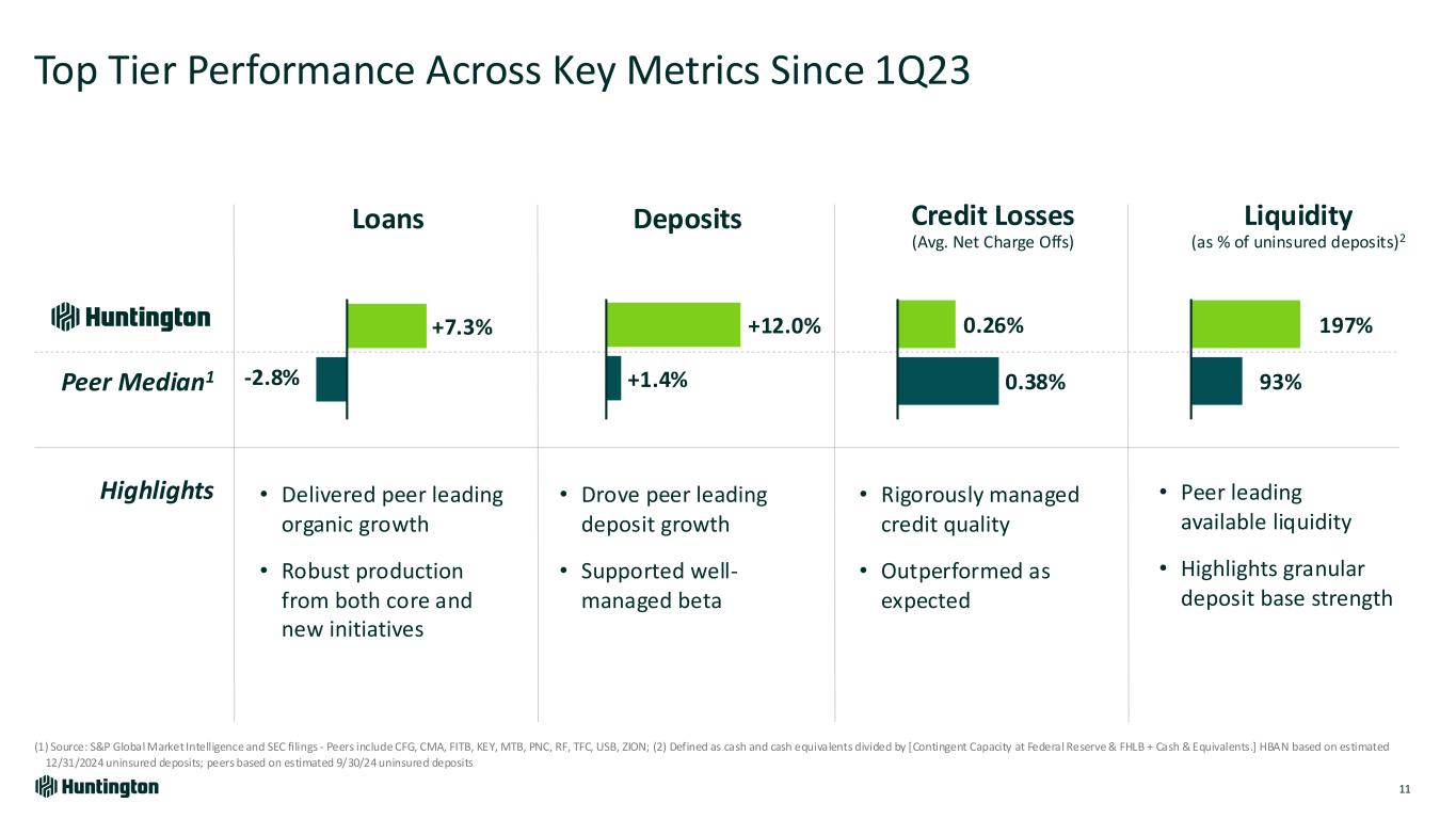 Longest Inverted Yield Curve1 In U.S. on Record 793 days 623 days 328 days Jul '22 - Sept '24 Aug '78 - May '80 Feb '00 - Dec '00 Fastest Federal Funds Rate Increase in Over 30 Years Bank Industry Dynamics Market Environment Over Last 2 Years 118 +5.25% +2.25% 4.21% +2.96% 0 12 24 36 R at e In cr ea se s Months Huntington Outperformed • Robust capital and liquidity • Strong credit • Diversified, high-quality loans • Attrition of uninsured deposits • Rapid rise in funding costs • Capital levels reduced • Shrinking loans & teams • Focus on CRE and subprime ’21-’23’15-’19’04-’06’93-’95 Based on publicly available market data for the 10-Year Treasury Constant Maturity Minus 2yr Treasury Constant Maturity [T10YT2Y]