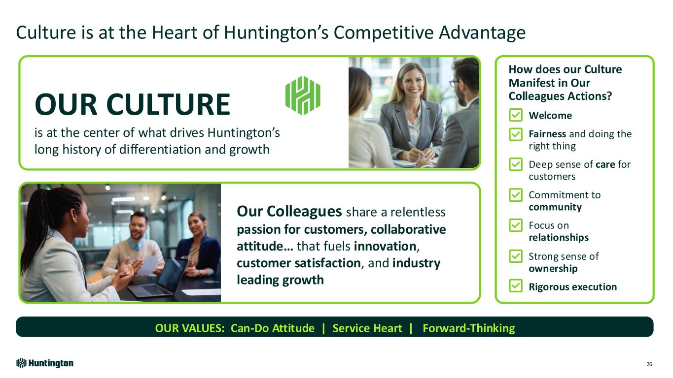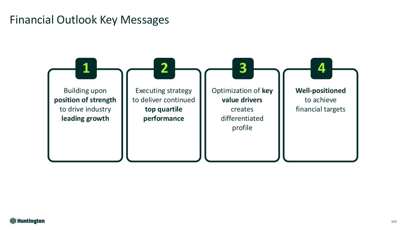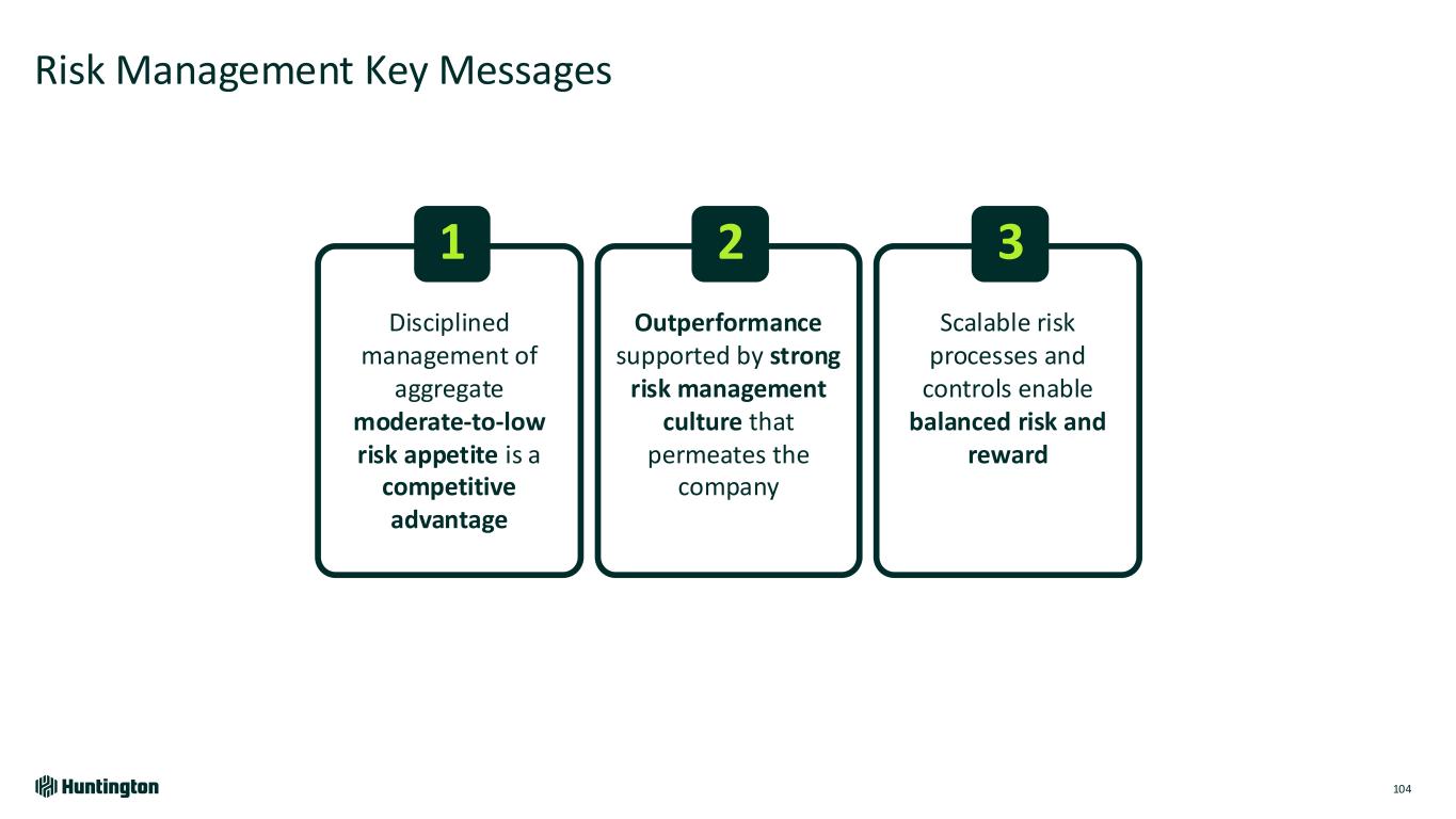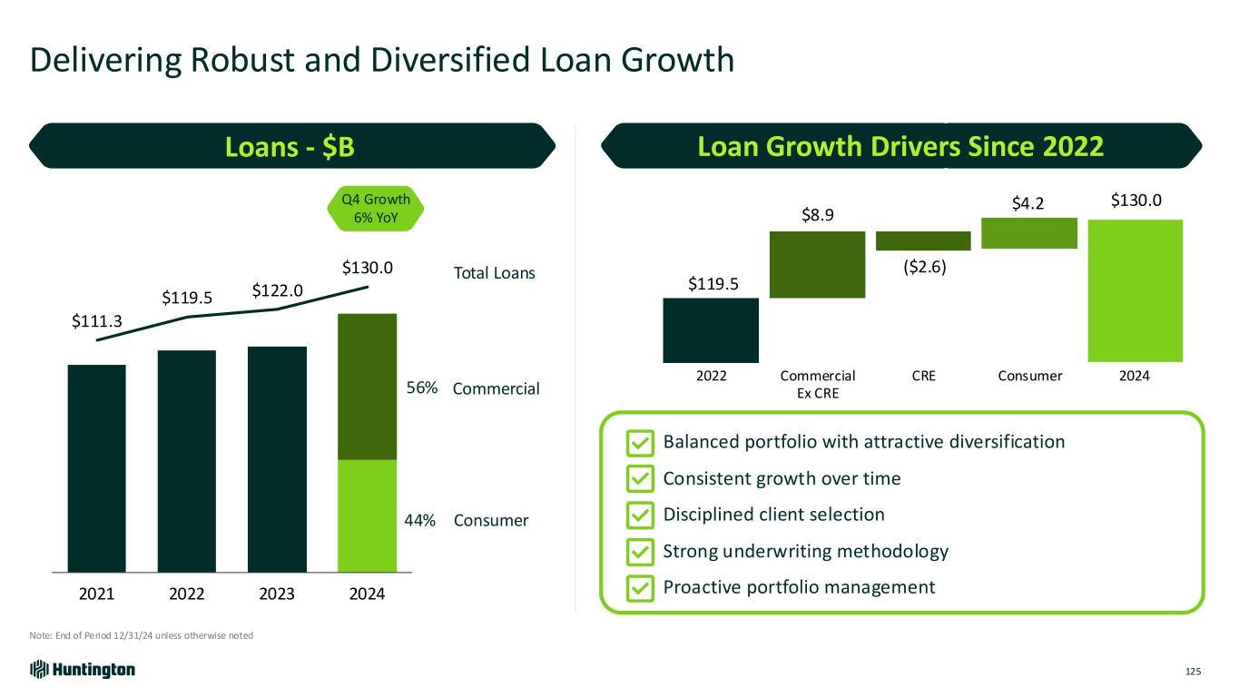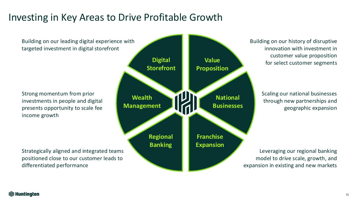 Longest Inverted Yield Curve1 In U.S. on Record 793 days 623 days 328 days Jul '22 - Sept '24 Aug '78 - May '80 Feb '00 - Dec '00 Fastest Federal Funds Rate Increase in Over 30 Years Bank Industry Dynamics Market Environment Over Last 2 Years 118 +5.25% +2.25% 4.21% +2.96% 0 12 24 36 R at e In cr ea se s Months Huntington Outperformed • Robust capital and liquidity • Strong credit • Diversified, high-quality loans • Attrition of uninsured deposits • Rapid rise in funding costs • Capital levels reduced • Shrinking loans & teams • Focus on CRE and subprime ’21-’23’15-’19’04-’06’93-’95 Based on publicly available market data for the 10-Year Treasury Constant Maturity Minus 2yr Treasury Constant Maturity [T10YT2Y]