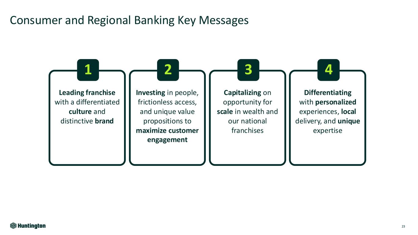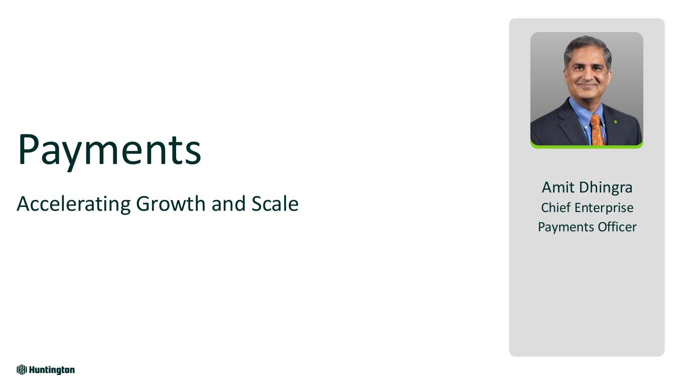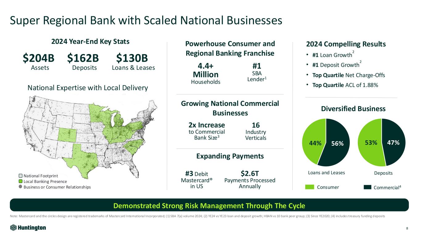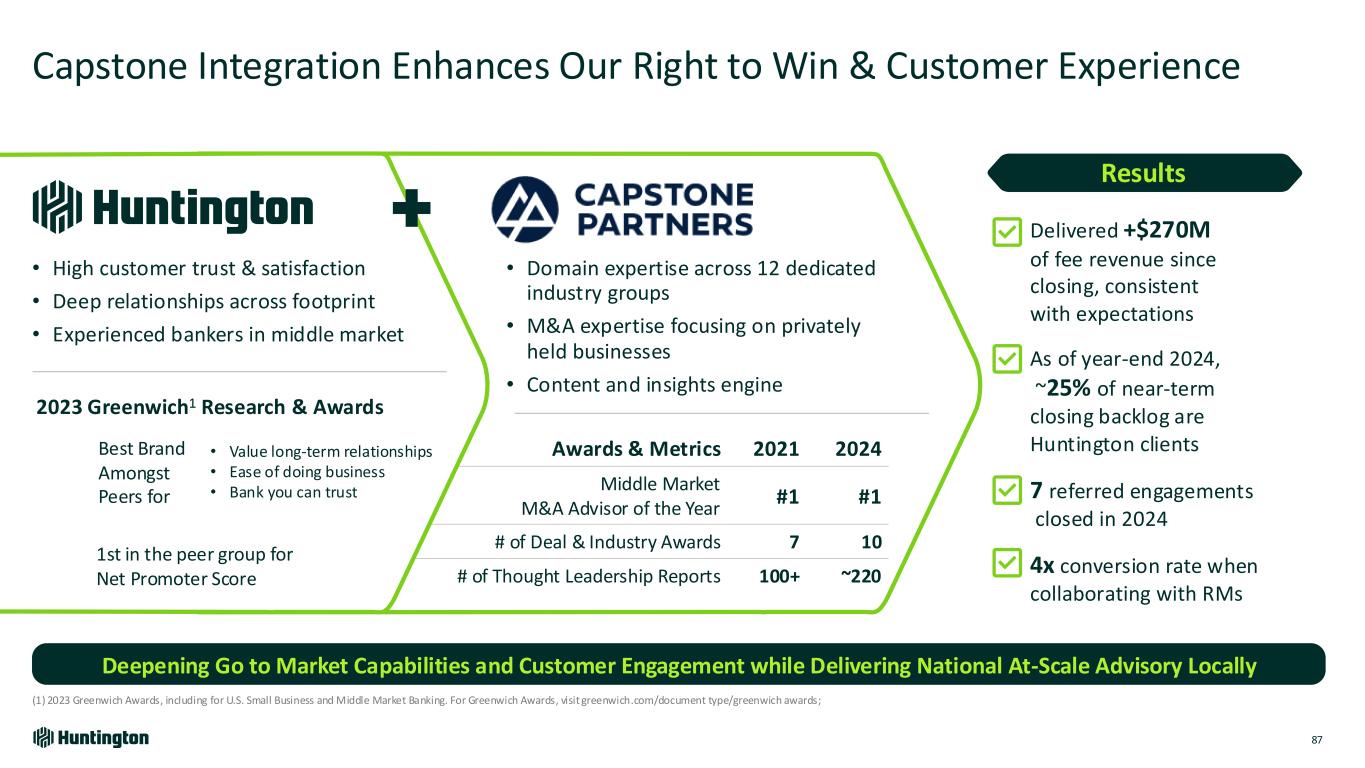 Awards & Metrics 2021 2024 Middle Market M&A Advisor of the Year #1 #1 # of Deal & Industry Awards 7 10 # of Thought Leadership Reports 100+ ~220 Capstone Integration Enhances Our Right to Win & Customer Experience 87 Deepening Go to Market Capabilities and Customer Engagement while Delivering National At-Scale Advisory Locally 2023 Greenwich¹ Research & Awards 1st in the peer group for Net Promoter Score • Value long-term relationships • Ease of doing business • Bank you can trust Best Brand Amongst Peers for • Domain expertise across 12 dedicated industry groups • M&A expertise focusing on privately held businesses • Content and insights engine • High customer trust & satisfaction • Deep relationships across footprint • Experienced bankers in middle market Delivered +$270M of fee revenue since closing, consistent with expectations As of year-end 2024, ~25% of near-term closing backlog are Huntington clients 7 referred engagements closed in 2024 4x conversion rate when collaborating with RMs Results (1) 2023 Greenwich Awards, including for U.S. Small Business and Middle Market Banking. For Greenwich Awards, visit greenwich.com/document type/greenwich awards;