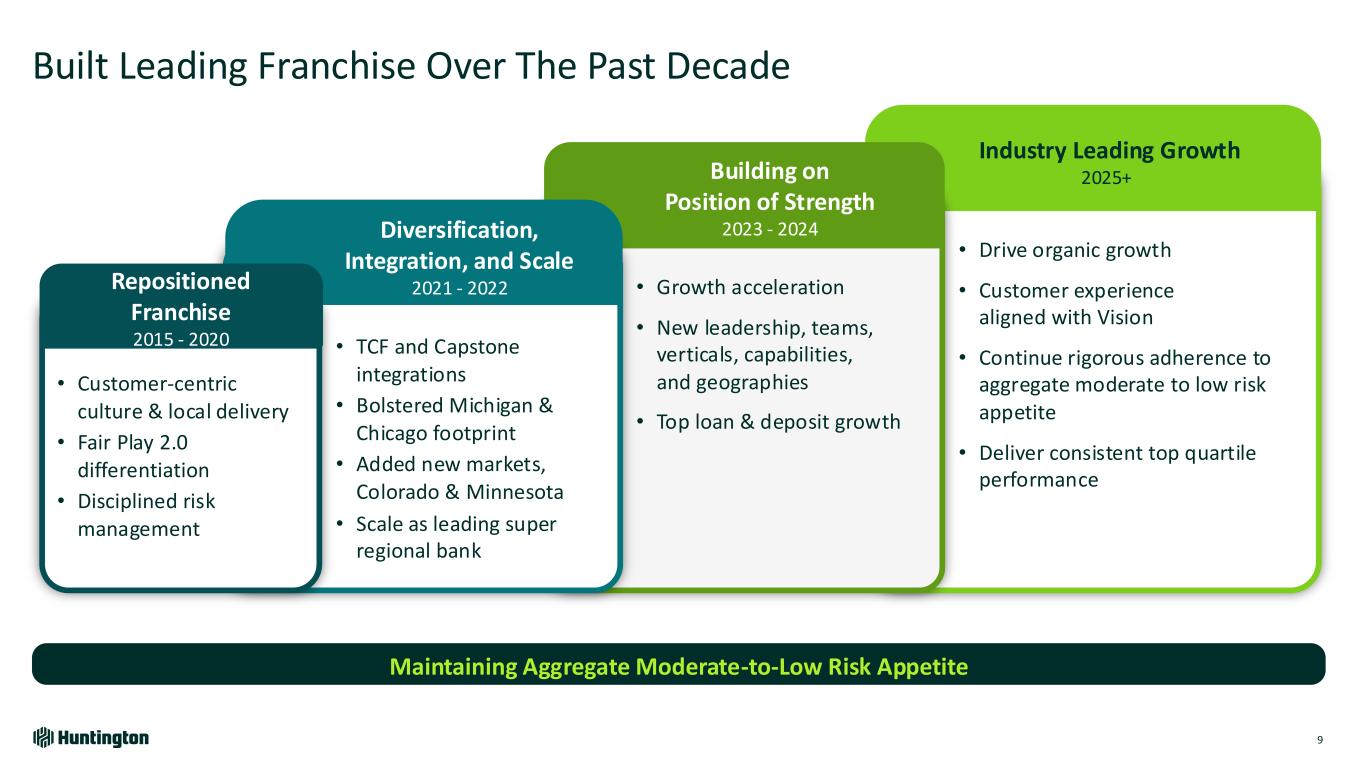 Super Regional Bank with Scaled National Businesses 8 Note: Mastercard and the circles design are registered trademarks of Mastercard International Incorporated; (1) SBA 7(a) volume 2024; (2) YE24 vs YE23 loan and deposit growth; HBAN vs 10 bank peer group; (3) Since YE2020; (4) includes treasury funding deposits Demonstrated Strong Risk Management Through The Cycle 47%53%56%44% Loans and Leases Deposits Diversified Business $204B Assets $162B Deposits $130B Loans & Leases 2024 Year-End Key Stats Powerhouse Consumer and Regional Banking Franchise Growing National Commercial Businesses Expanding Payments 4.4+ Million Households #1 SBA Lender1 2x Increase to Commercial Bank Size3 16 Industry Verticals #3 Debit Mastercard® in US $2.6T Payments Processed Annually 2024 Compelling Results • #1 Loan Growth 2 • #1 Deposit Growth 2 • Top Quartile Net Charge-Offs • Top Quartile ACL of 1.88% Consumer Commercial4 National Expertise with Local Delivery National Footprint Local Banking Presence Business or Consumer Relationships