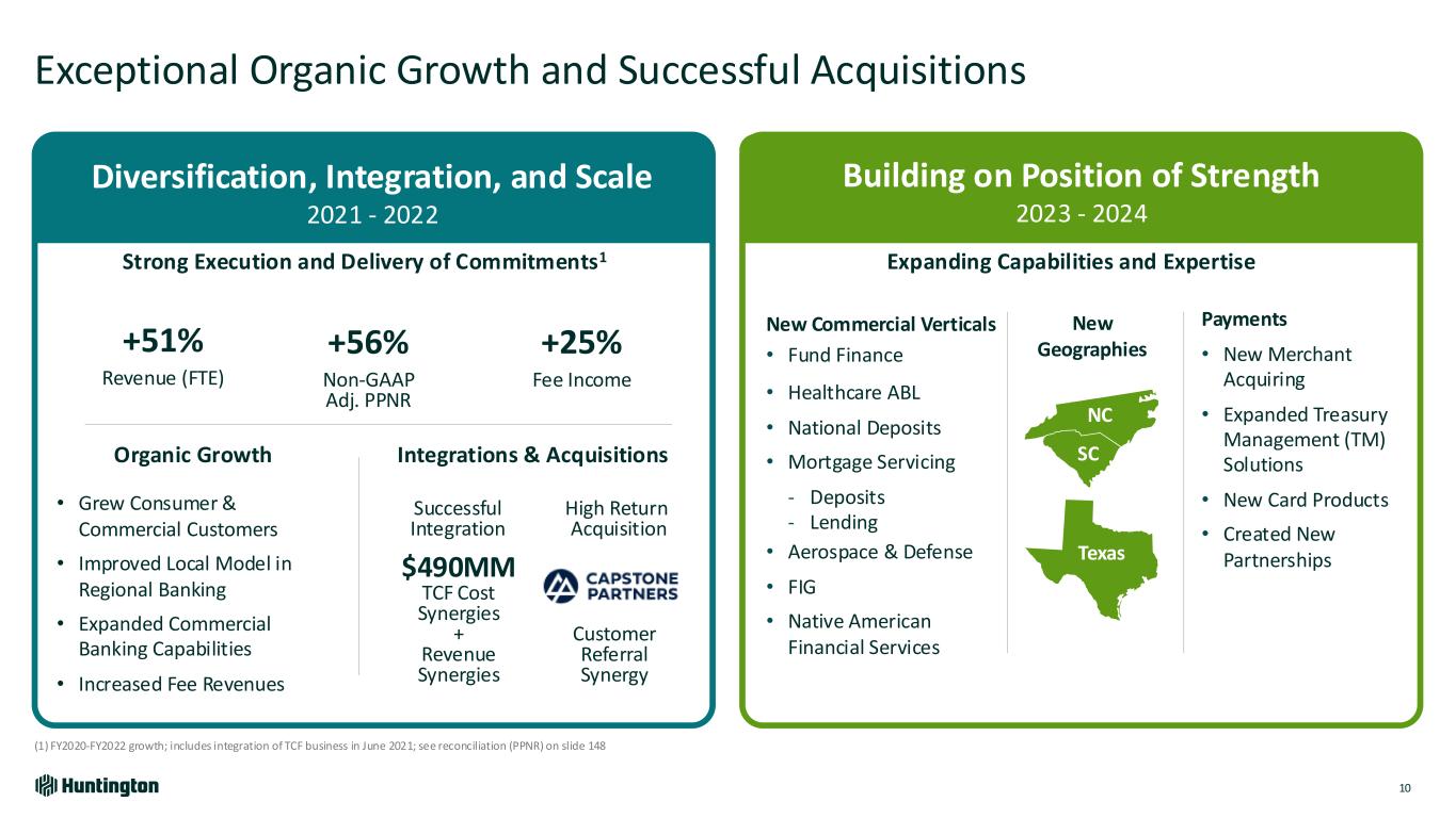 Industry Leading Growth 2025+Building on Position of Strength 2023 - 2024 Built Leading Franchise Over The Past Decade 9 Maintaining Aggregate Moderate-to-Low Risk Appetite • Customer-centric culture & local delivery • Fair Play 2.0 differentiation • Disciplined risk management • TCF and Capstone integrations • Bolstered Michigan & Chicago footprint • Added new markets, Colorado & Minnesota • Scale as leading super regional bank • Growth acceleration • New leadership, teams, verticals, capabilities, and geographies • Top loan & deposit growth • Drive organic growth • Customer experience aligned with Vision • Continue rigorous adherence to aggregate moderate to low risk appetite • Deliver consistent top quartile performance Diversification, Integration, and Scale 2021 - 2022Repositioned Franchise 2015 - 2020