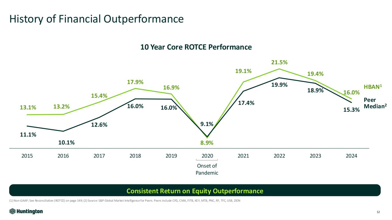 Top Tier Performance Across Key Metrics Since 1Q23 11 (1) Source: S&P Global Market Intelligence and SEC filings ‐ Peers include CFG, CMA, FITB, KEY, MTB, PNC, RF, TFC, USB, ZION; (2) Defined as cash and cash equivalents divided by [Contingent Capacity at Federal Reserve & FHLB + Cash & Equivalents.] HBAN based on estimated 12/31/2024 uninsured deposits; peers based on estimated 9/30/24 uninsured deposits -2.8% +7.3% Loans +1.4% +12.0% Deposits 0.38% 0.26% Credit Losses (Avg. Net Charge Offs) Peer Median1 Highlights • Delivered peer leading organic growth • Robust production from both core and new initiatives • Drove peer leading deposit growth • Supported well- managed beta • Rigorously managed credit quality • Outperformed as expected 93% 197% Liquidity (as % of uninsured deposits)2 • Peer leading available liquidity • Highlights granular deposit base strength