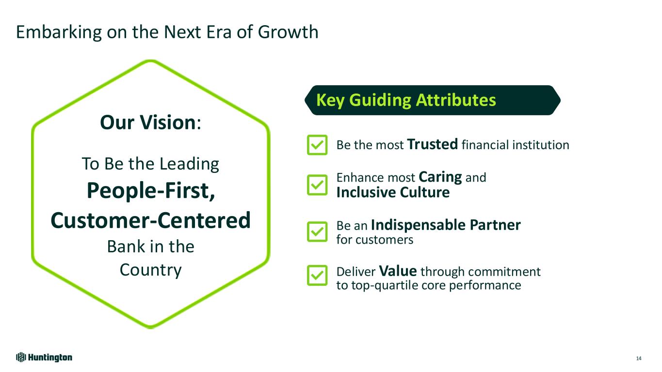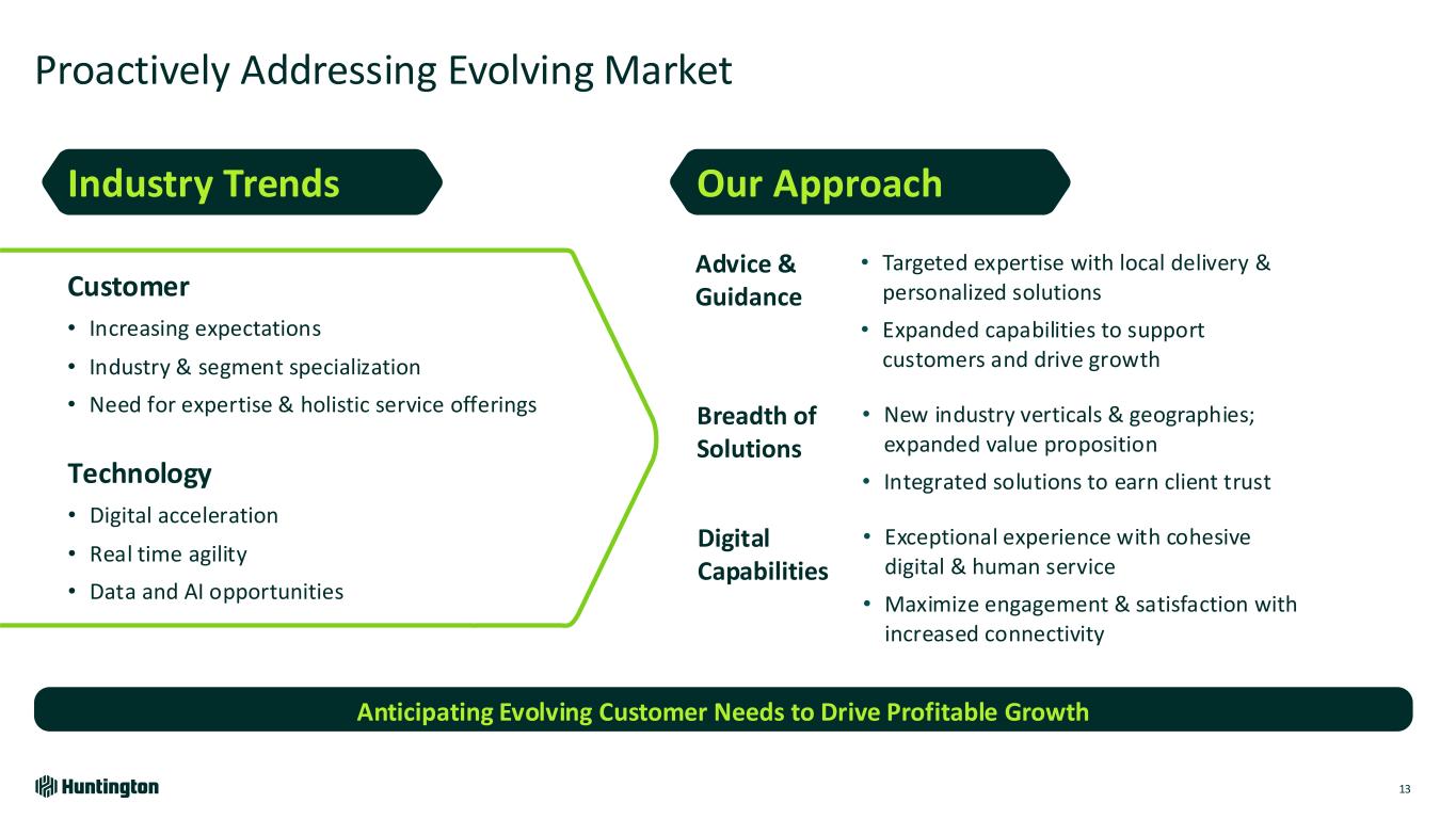 History of Financial Outperformance 12 (1) Non-GAAP; See Reconciliation (ROTCE) on page 149; (2) Source: S&P Global Market Intelligence for Peers. Peers include CFG, CMA, FITB, KEY, MTB, PNC, RF, TFC, USB, ZION Consistent Return on Equity Outperformance 10 Year Core ROTCE Performance Peer Median2 HBAN1 Onset of Pandemic 13.1% 13.2% 15.4% 17.9% 16.9% 8.9% 19.1% 21.5% 19.4% 16.0% 11.1% 10.1% 12.6% 16.0% 16.0% 9.1% 17.4% 19.9% 18.9% 15.3% 2015 2016 2017 2018 2019 2020 2021 2022 2023 2024