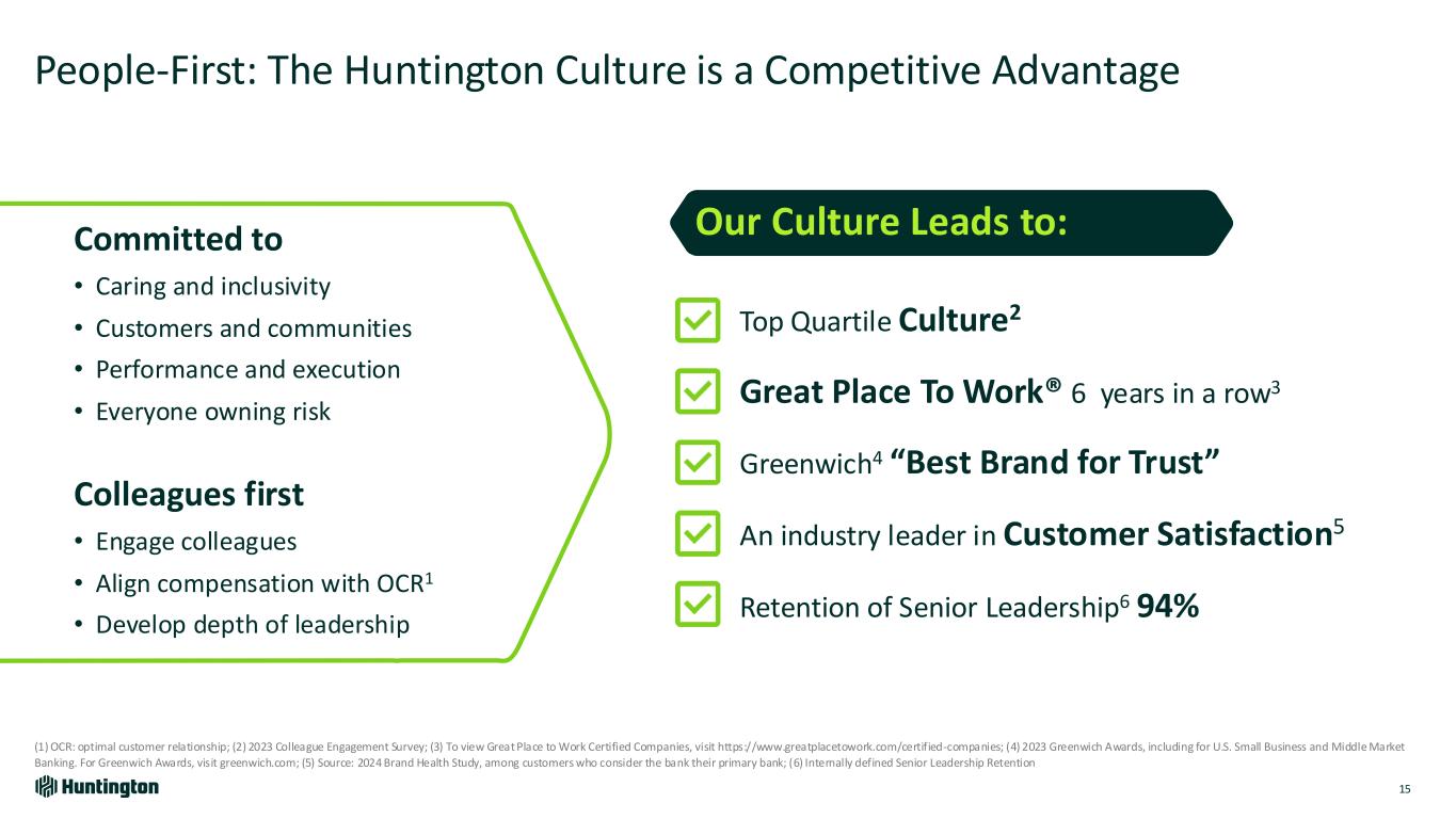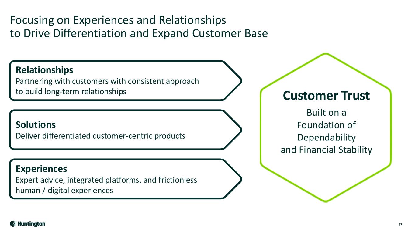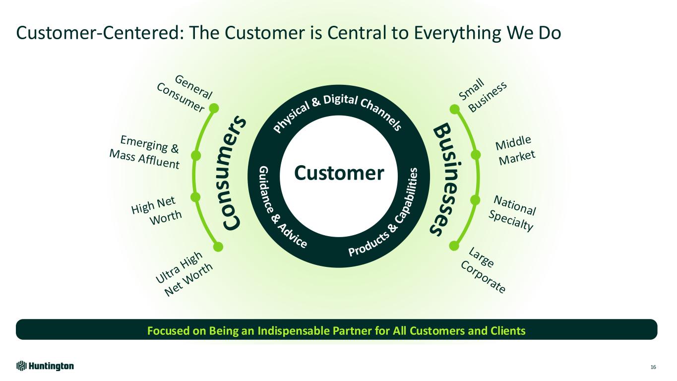 Our Culture Leads to: Top Quartile Culture2 Great Place To Work® 6 years in a row3 Greenwich4 “Best Brand for Trust” An industry leader in Customer Satisfaction5 Retention of Senior Leadership6 94% People-First: The Huntington Culture is a Competitive Advantage 15 (1) OCR: optimal customer relationship; (2) 2023 Colleague Engagement Survey; (3) To view Great Place to Work Certified Companies, visit https://www.greatplacetowork.com/certified-companies; (4) 2023 Greenwich Awards, including for U.S. Small Business and Middle Market Banking. For Greenwich Awards, visit greenwich.com; (5) Source: 2024 Brand Health Study, among customers who consider the bank their primary bank; (6) Internally defined Senior Leadership Retention Colleagues first • Engage colleagues • Align compensation with OCR1 • Develop depth of leadership Committed to • Caring and inclusivity • Customers and communities • Performance and execution • Everyone owning risk