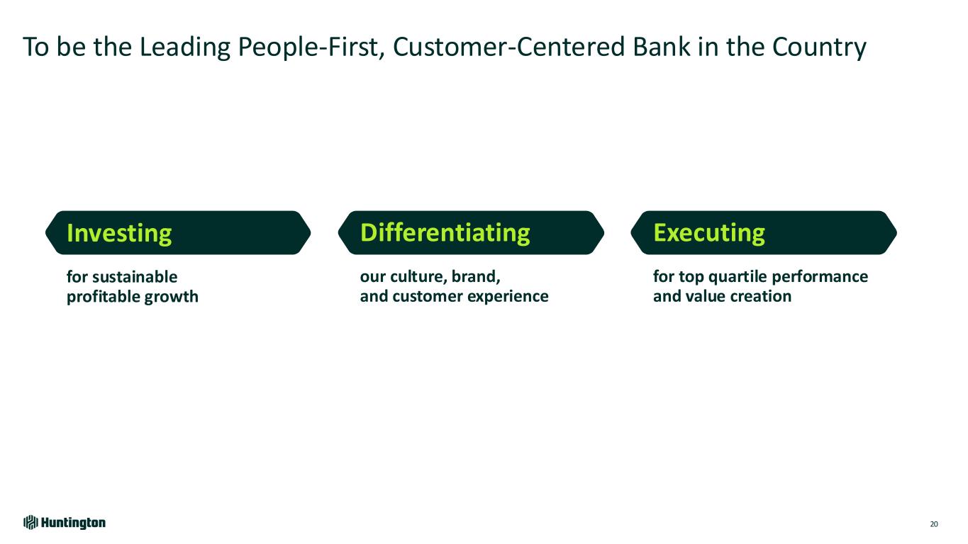 Outcomes Growth Outlook Supported by Robust Risk Management 19 Maintaining Aggregate Moderate-to-Low Risk Appetite through Expansion and Growth Focus on Key Risks… Aggregate Moderate-to-Low Risk Appetite Creates a Strategic Advantage … Enabling a Position of Strength • Well-positioned to navigate macro environment • Dependability / consistency builds customer trust • Industry leader in liquidity and insured deposits • Top quartile performance for net charge-offs Capital Compliance Technology & Cyber Security Liquidity & Market Credit Data Governance