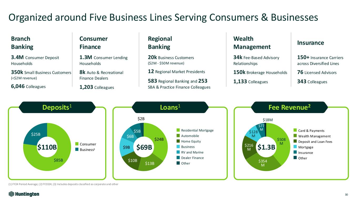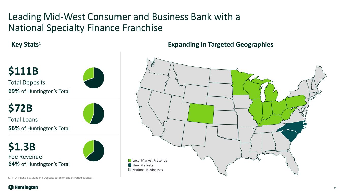 Leading Mid-West Consumer and Business Bank with a National Specialty Finance Franchise 24 (1) FY24 Financials. Loans and Deposits based on End of Period balance. $111B Total Deposits 69% of Huntington’s Total $72B Total Loans 56% of Huntington’s Total $1.3B Fee Revenue 64% of Huntington’s Total Key Stats1 Expanding in Targeted Geographies Local Market Presence New Markets National Businesses