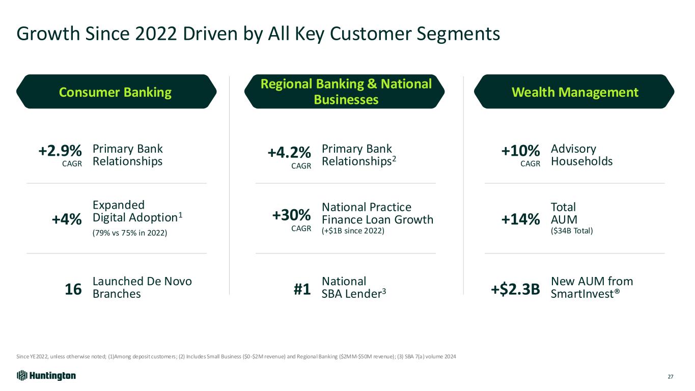 Culture is at the Heart of Huntington’s Competitive Advantage 26 OUR VALUES: Can-Do Attitude | Service Heart | Forward-Thinking Our Colleagues share a relentless passion for customers, collaborative attitude… that fuels innovation, customer satisfaction, and industry leading growth How does our Culture Manifest in Our Colleagues Actions? Welcome Fairness and doing the right thing Deep sense of care for customers Commitment to community Focus on relationships Strong sense of ownership Rigorous execution OUR CULTURE is at the center of what drives Huntington’s long history of differentiation and growth