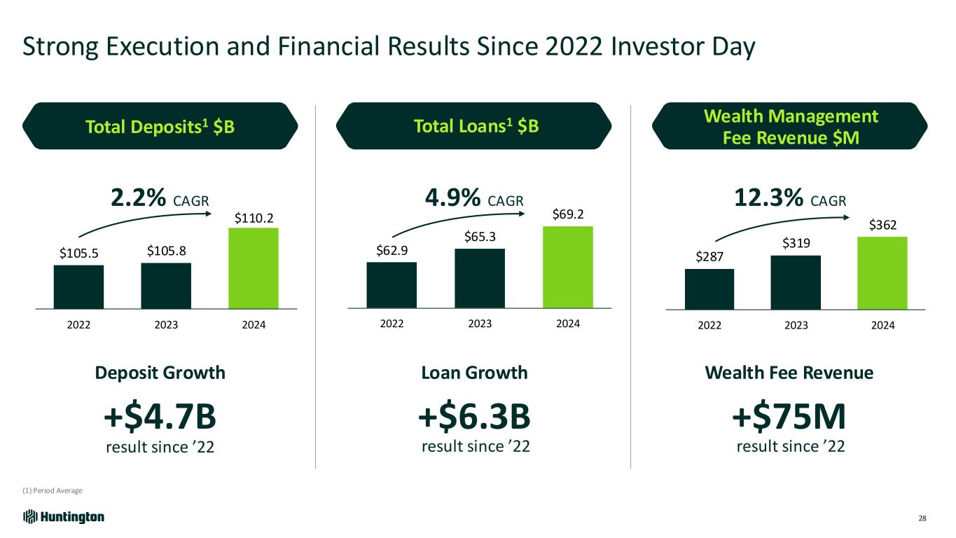 Growth Since 2022 Driven by All Key Customer Segments 27 Since YE2022, unless otherwise noted; (1)Among deposit customers; (2) Includes Small Business ($0-$2M revenue) and Regional Banking ($2MM-$50M revenue); (3) SBA 7(a) volume 2024 +2.9% CAGR Primary Bank Relationships +4% Expanded Digital Adoption1 (79% vs 75% in 2022) 16 Launched De Novo Branches Wealth ManagementConsumer Banking Regional Banking & National Businesses +4.2% CAGR Primary Bank Relationships2 +30% CAGR National Practice Finance Loan Growth (+$1B since 2022) #1 National SBA Lender3 +10% CAGR Advisory Households +14% Total AUM ($34B Total) +$2.3B New AUM from SmartInvest®
