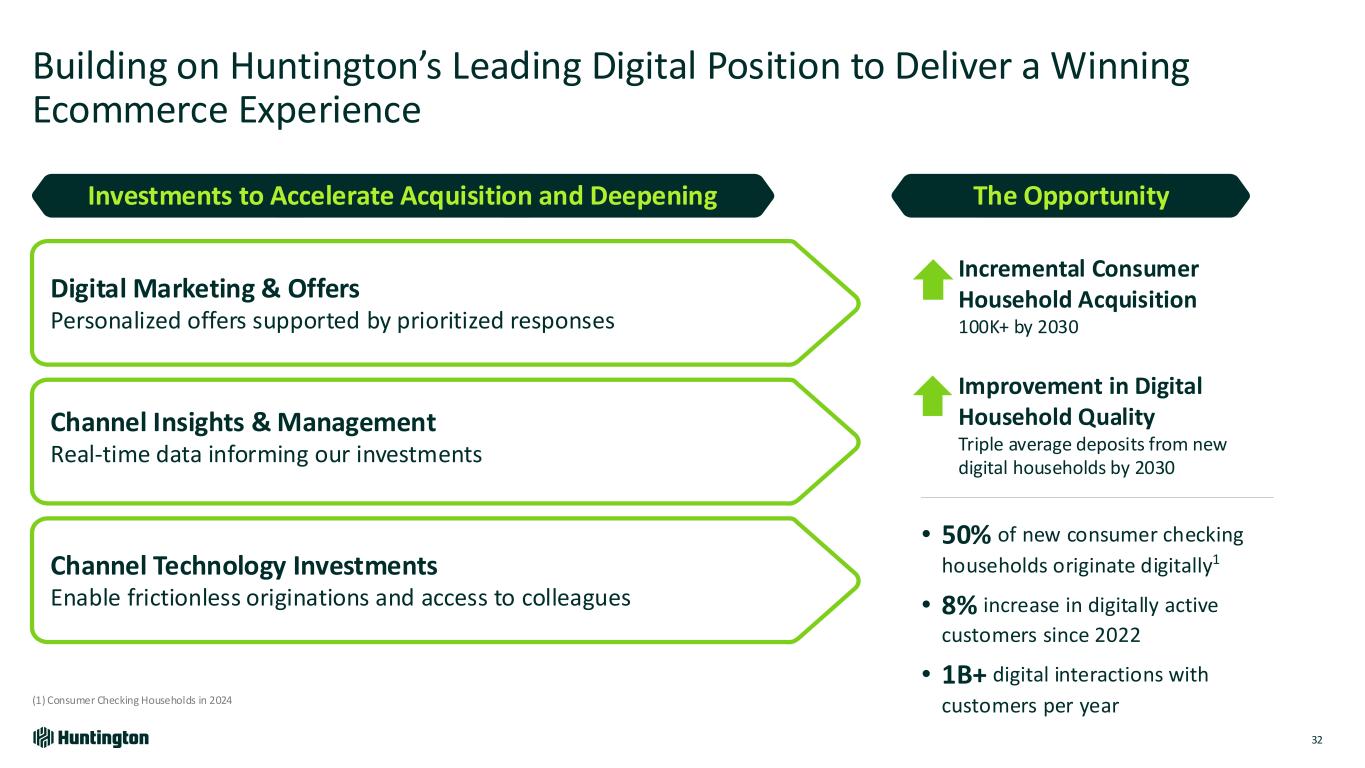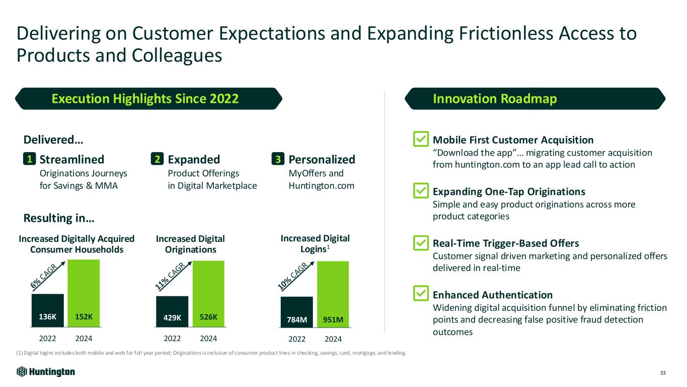 Channel Technology Investments Enable frictionless originations and access to colleagues Improvement in Digital Household Quality Triple average deposits from new digital households by 2030 Building on Huntington’s Leading Digital Position to Deliver a Winning Ecommerce Experience (1) Consumer Checking Households in 2024 Incremental Consumer Household Acquisition 100K+ by 2030 The OpportunityInvestments to Accelerate Acquisition and Deepening Digital Marketing & Offers Personalized offers supported by prioritized responses Channel Insights & Management Real-time data informing our investments • 50% of new consumer checking households originate digitally1 • 8% increase in digitally active customers since 2022 • 1B+ digital interactions with customers per year 32